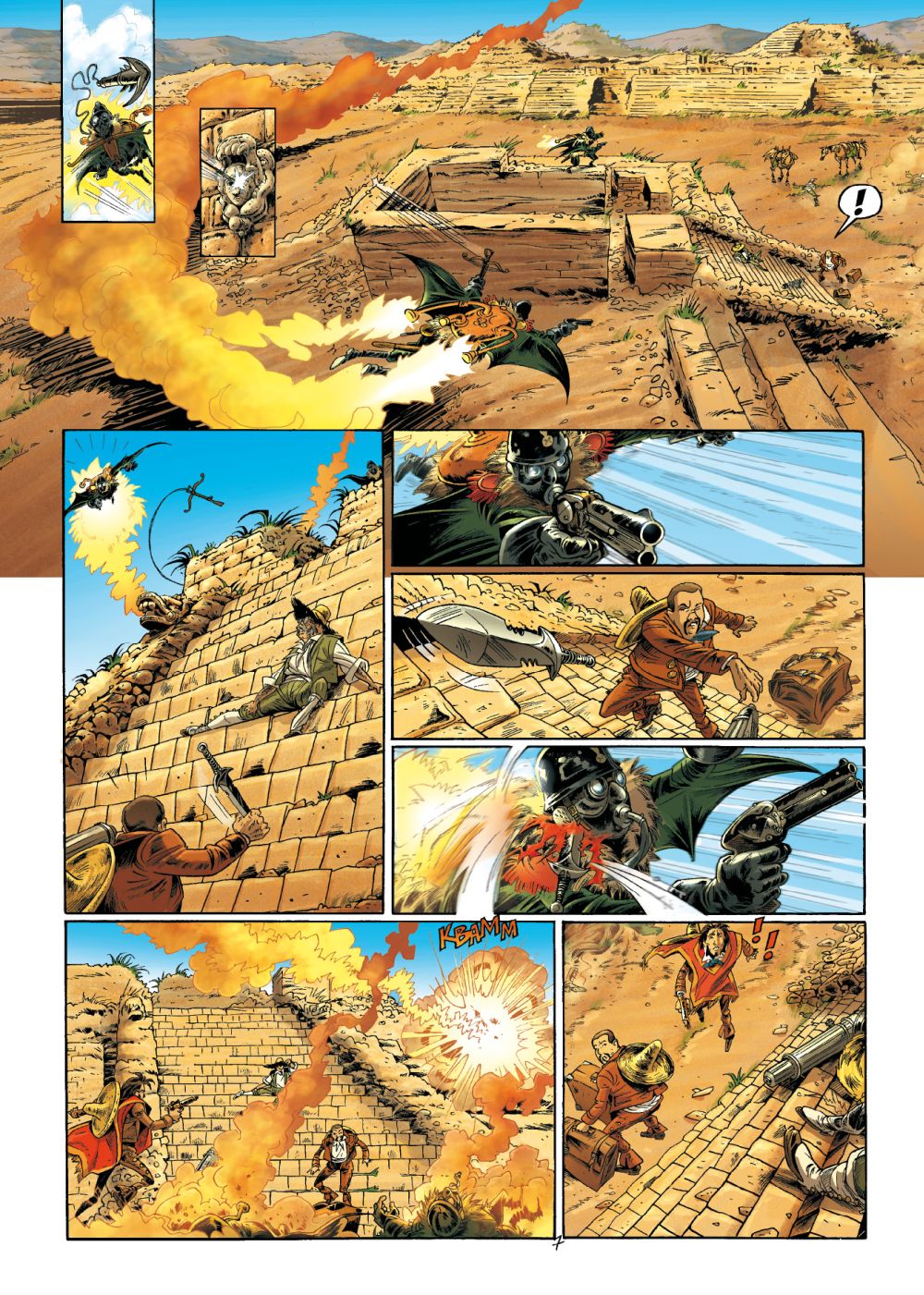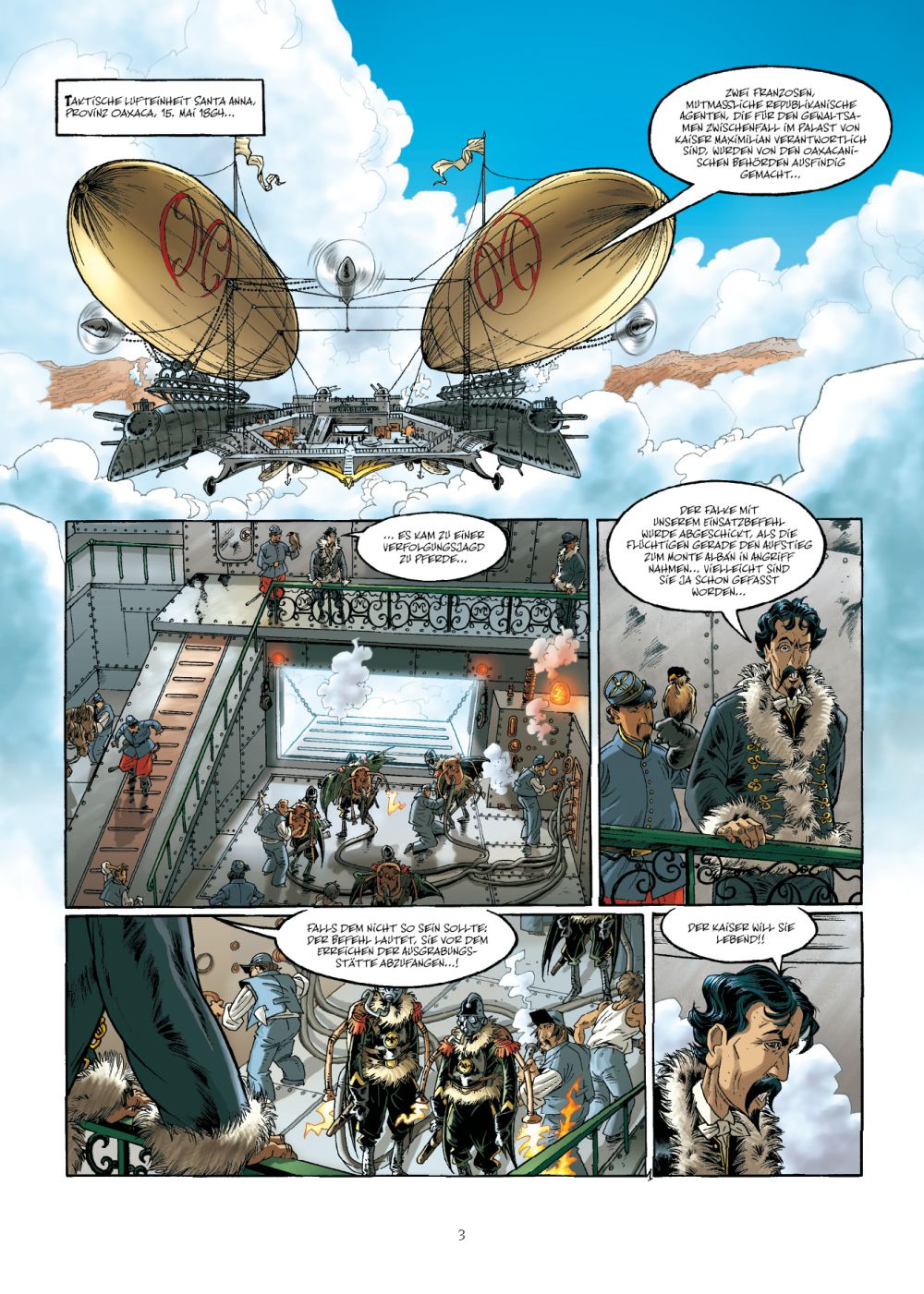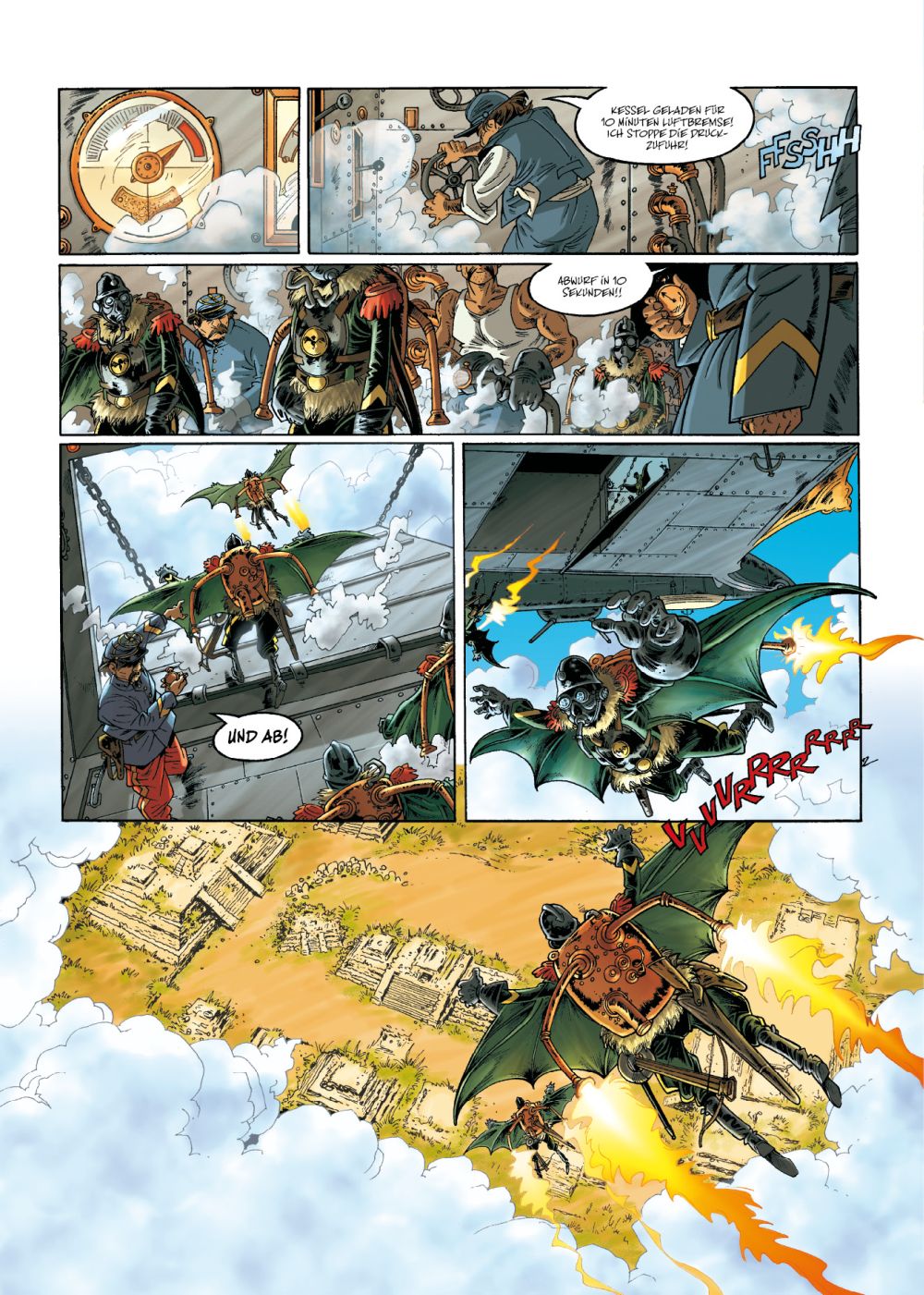 Dort lebt ein schillerndes Archäologenpaar, das ihnen dabei helfen soll, die Geheimnisse des Fragments zu enthüllen. Zugleich aber müssen sie sich aus der Umklammerung der mexikanischen Armee befreien, die sie mit einem ihrer imposantesten Luftschiffe verfolgt. Denn die Santa Anna gleicht eher einer fliegenden Festung als einem einfachen Zeppelin....