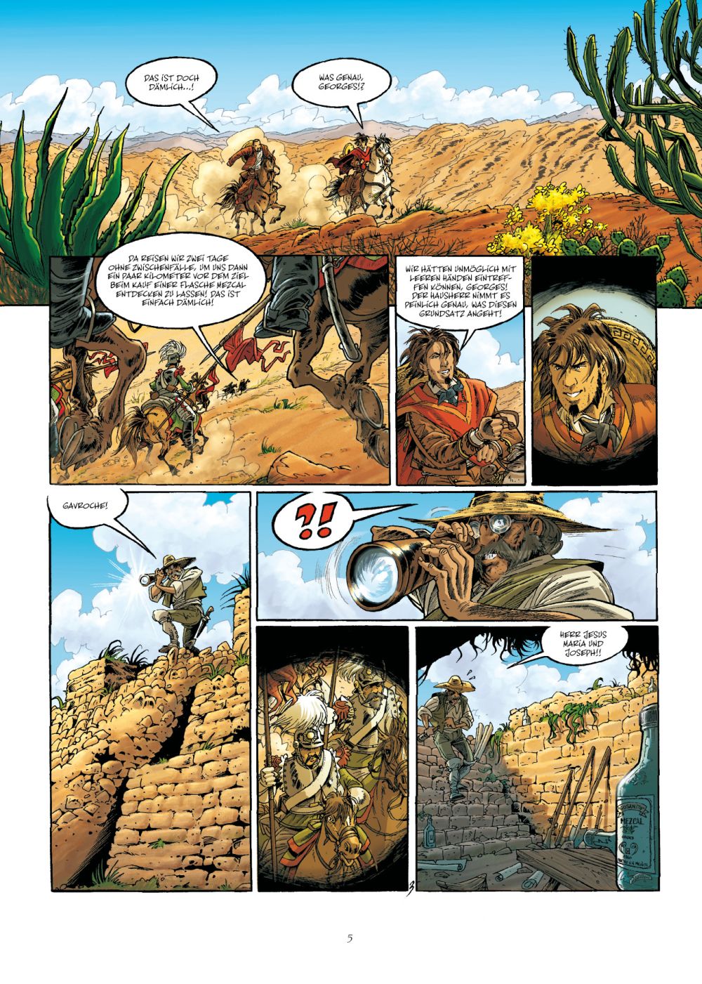 Ausgestattet mit dem unbekannten Fragment der Memoiren des Bernal Diaz del Castillo, des Chronisten der Konquistadoren, reiten Gavroche und Georges durch Mexiko, um zur zapotekischen Ausgrabungsstätte Monte Albán zu gelangen.