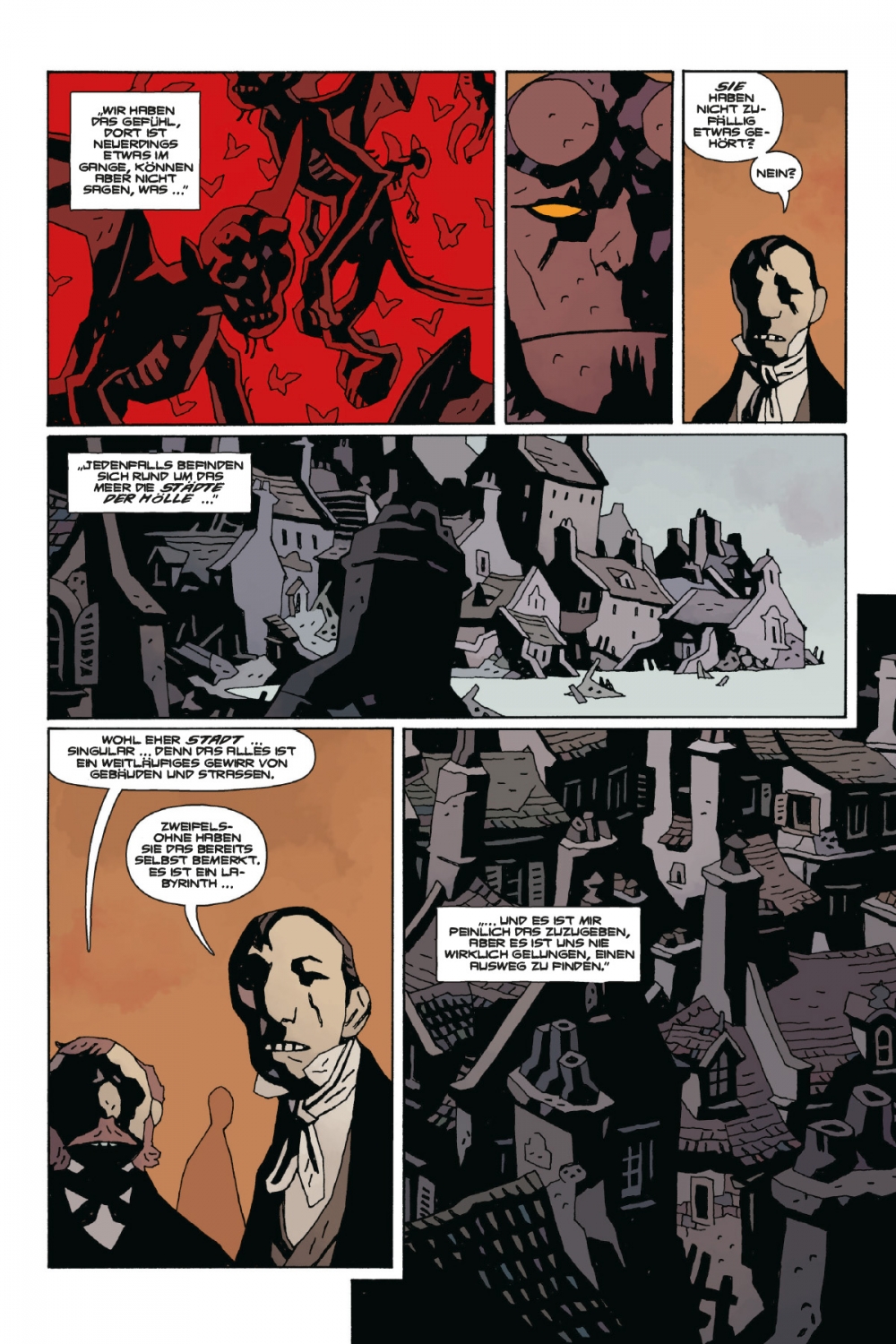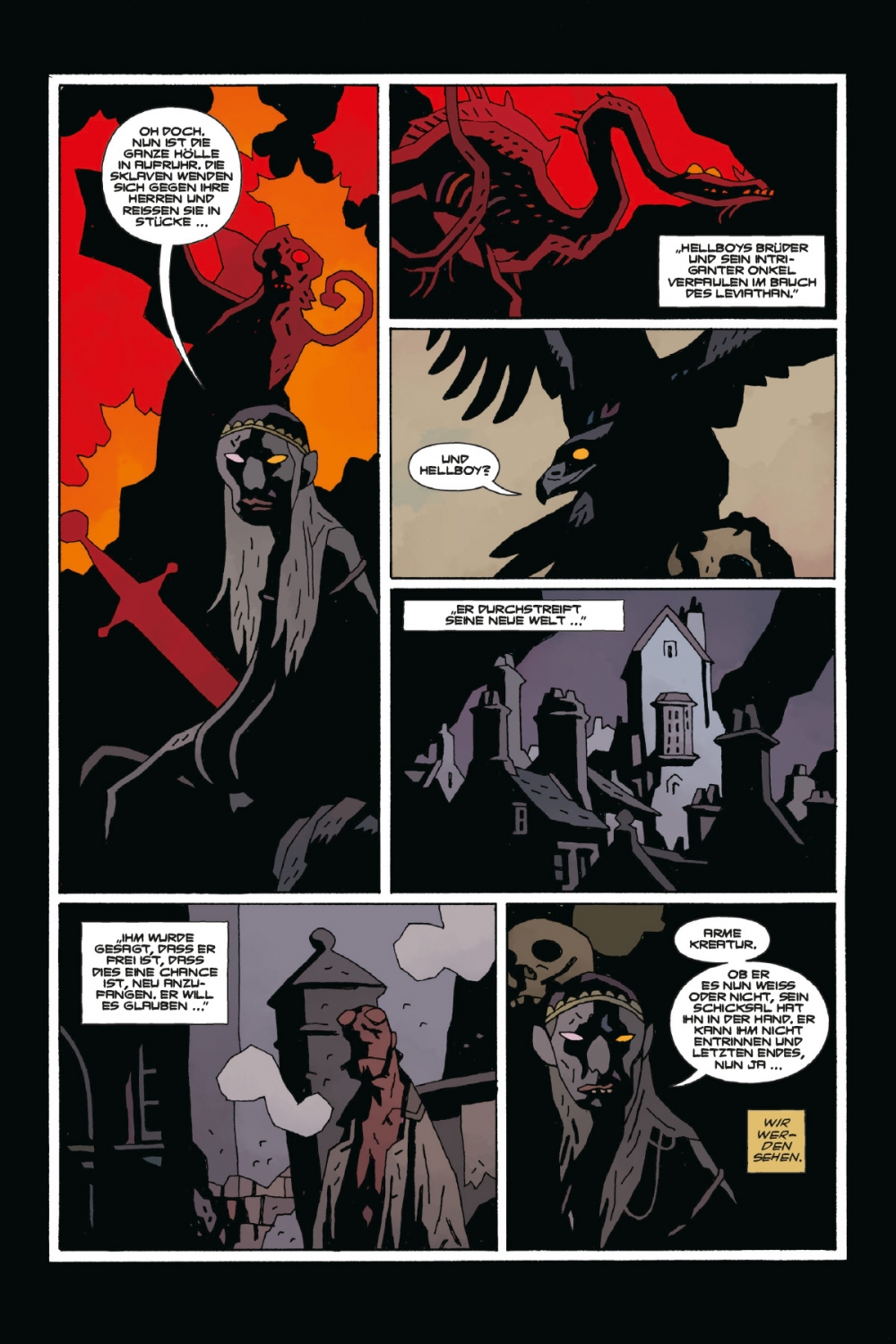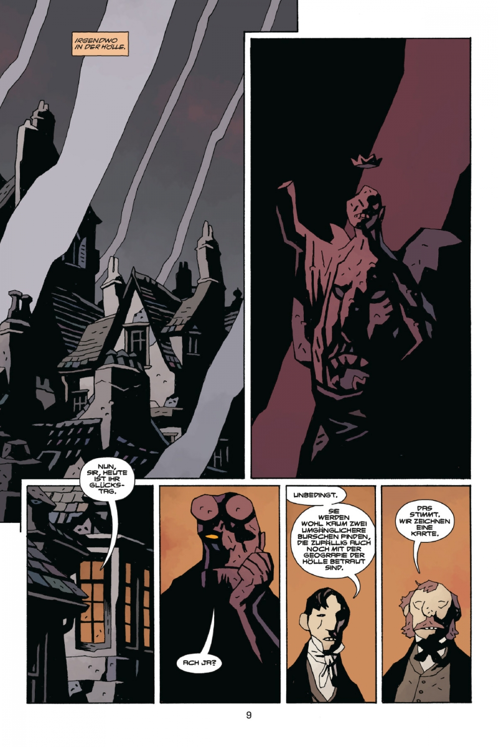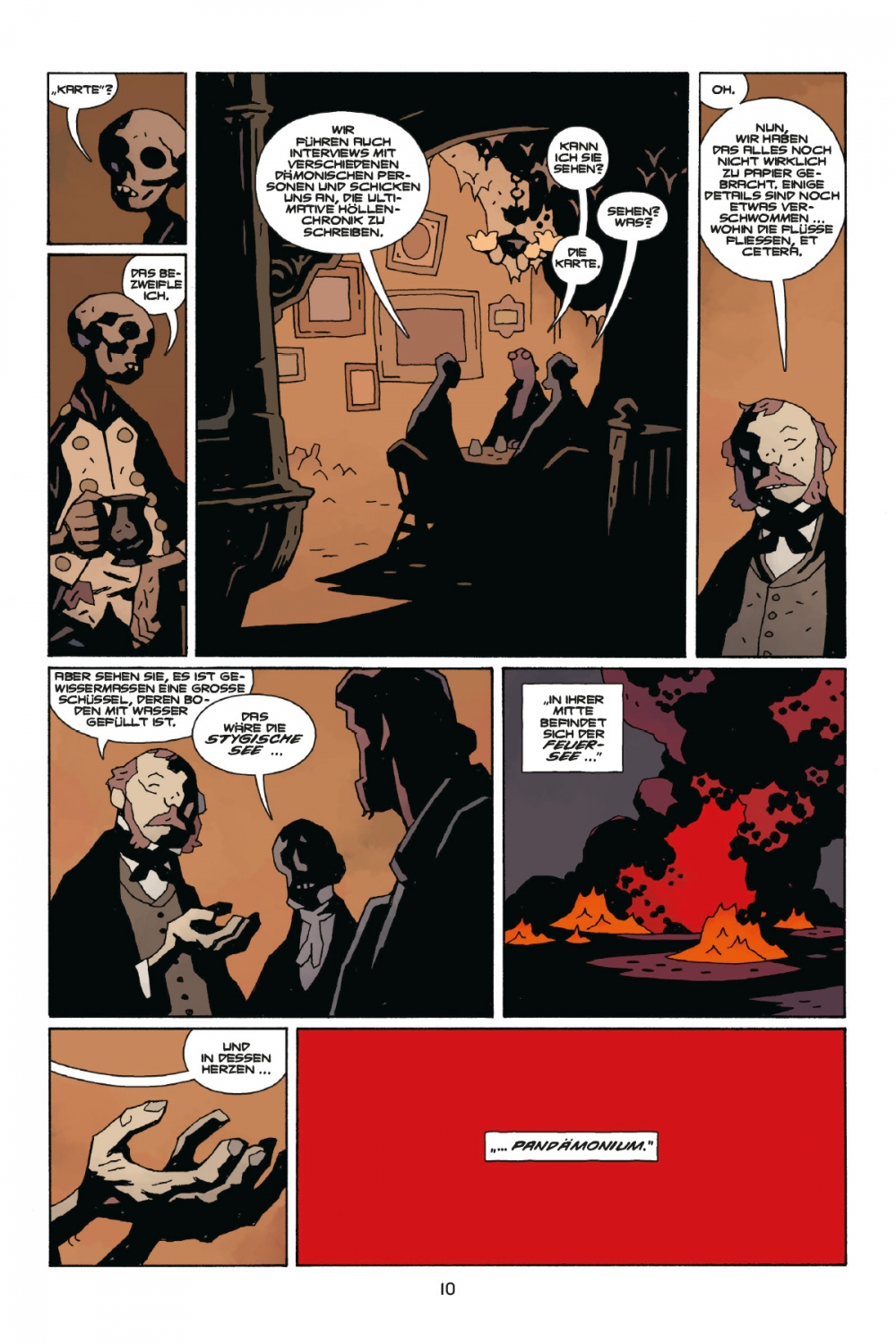 Hellboy, gestorben und in der Hölle, sucht schwer erkrankt den Rat eines inkompetenten Doktorenteams. Als er die Geografie der Hölle erkundet, trifft er auf zwei konfuse Kartografen, er entdeckt den neuen Weltenbaum, den er einst miterschaffen hat, er wird von seiner eigenen Schwester vor Gericht gestellt und eines schrecklichen Mordes angeklagt um schließlich die Zerstörung des gesamten Pandemoniums auszulösen ...