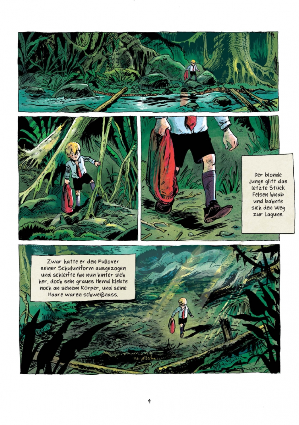 William Goldings Roman »Herr der Fliegen« gilt als eines der einflussreichsten Bücher der Weltliteratur. Seine pessimistische Version einer Robinson-Crusoe-Geschichte besticht nicht nur durch ihre dramatische Handlung, sondern vor allem durch ihre Aussage über die angeborene Gewaltbereitschaft des Menschen und seine Tendenz zur tyrannischen Herrschaft. Die Bildsprache dieser Adaption von Aimée de Jongh fängt vor allem die Kontraste von Goldings Werk – den Horror der paradiesischen Insel, die Grausamkeit der spielfreudigen Kinder – grandios ein.