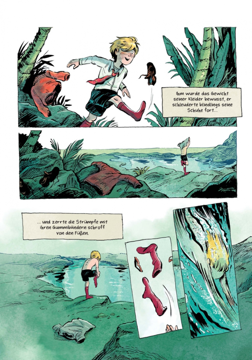 William Goldings Roman »Herr der Fliegen« gilt als eines der einflussreichsten Bücher der Weltliteratur. Seine pessimistische Version einer Robinson-Crusoe-Geschichte besticht nicht nur durch ihre dramatische Handlung, sondern vor allem durch ihre Aussage über die angeborene Gewaltbereitschaft des Menschen und seine Tendenz zur tyrannischen Herrschaft. Die Bildsprache dieser Adaption von Aimée de Jongh fängt vor allem die Kontraste von Goldings Werk – den Horror der paradiesischen Insel, die Grausamkeit der spielfreudigen Kinder – grandios ein.