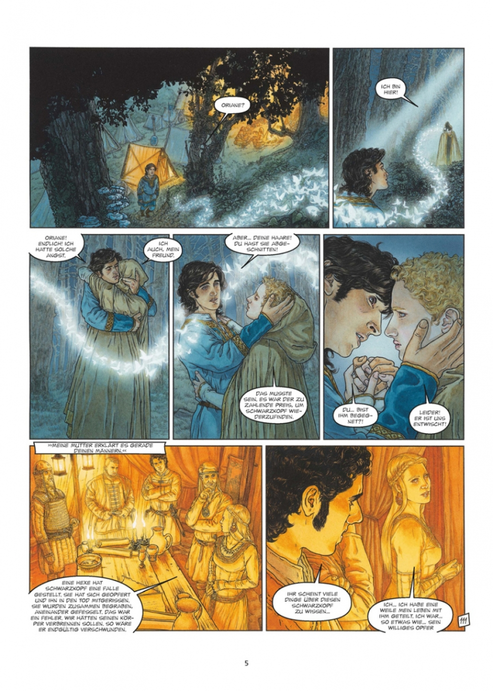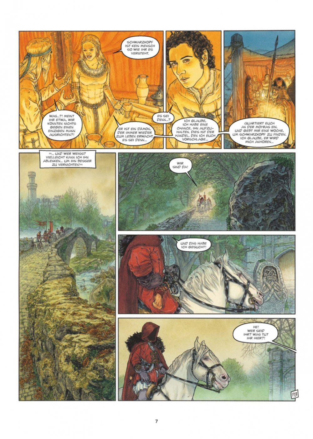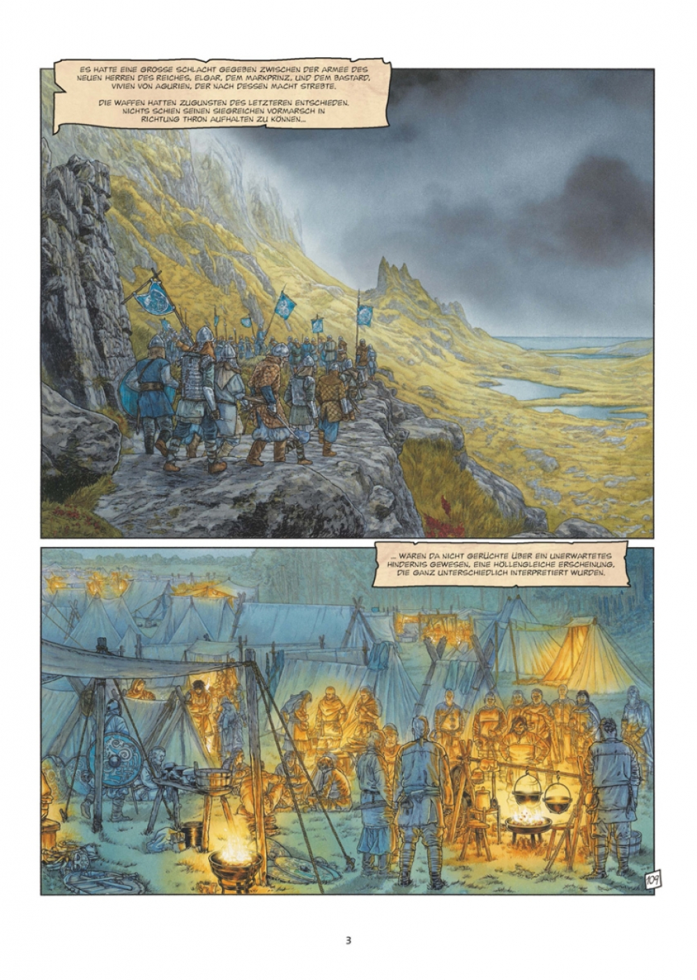 Es ist ein karger, isolierter Landstrich weit draußen im Meer, den Jean Dufaux (»Kreuzzug«, »Conquistador« etc.) da entworfen hat – mit hartgesottenen Bewohnern, denn außer dem rauen Klima werden sie auch noch von Zauberern, Dämonen und Hexen geplagt. Zuerst, ab 1993, illustrierte Grzegorz Rosinski (»Thorgal«) dieses »verlorene Land«, dann Philippe Delaby (»Murena«), und nun übernimmt Béatrice Tillier (»Fee«, »Der Wald der Jungfrauen«) den dritten Zyklus, die wieder auf vier Bände angelegten »Hexen des verlorenen Landes«. Dabei erweitert und kontrastiert sie diese archaische, mittelalterliche Fantasy-Welt mit zarten, nuancenreichen Aquarellen und ihrem feinen, prärafaelitischen Strich. Das Ergebnis ist pure Magie. So entstehen echte Legenden!