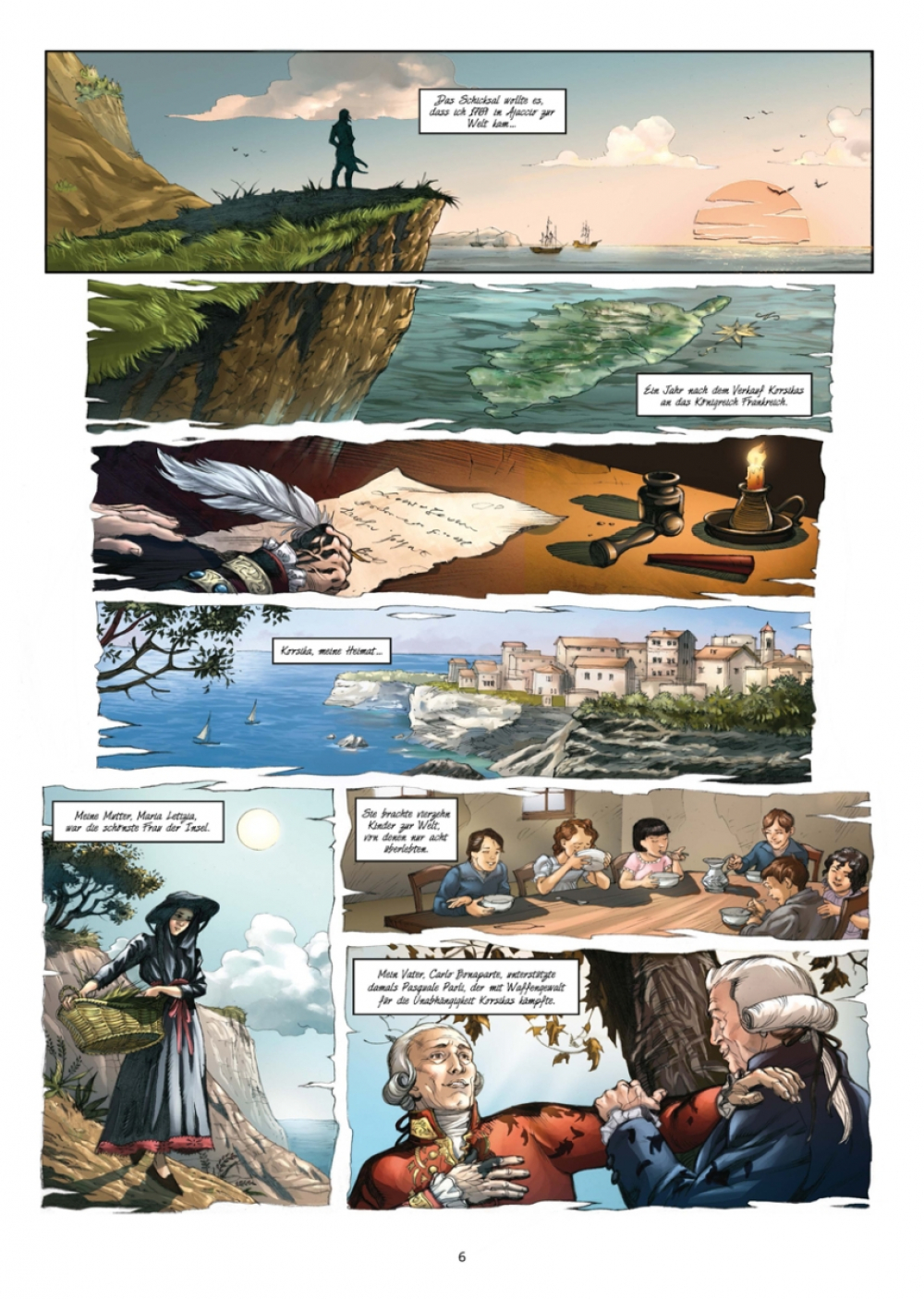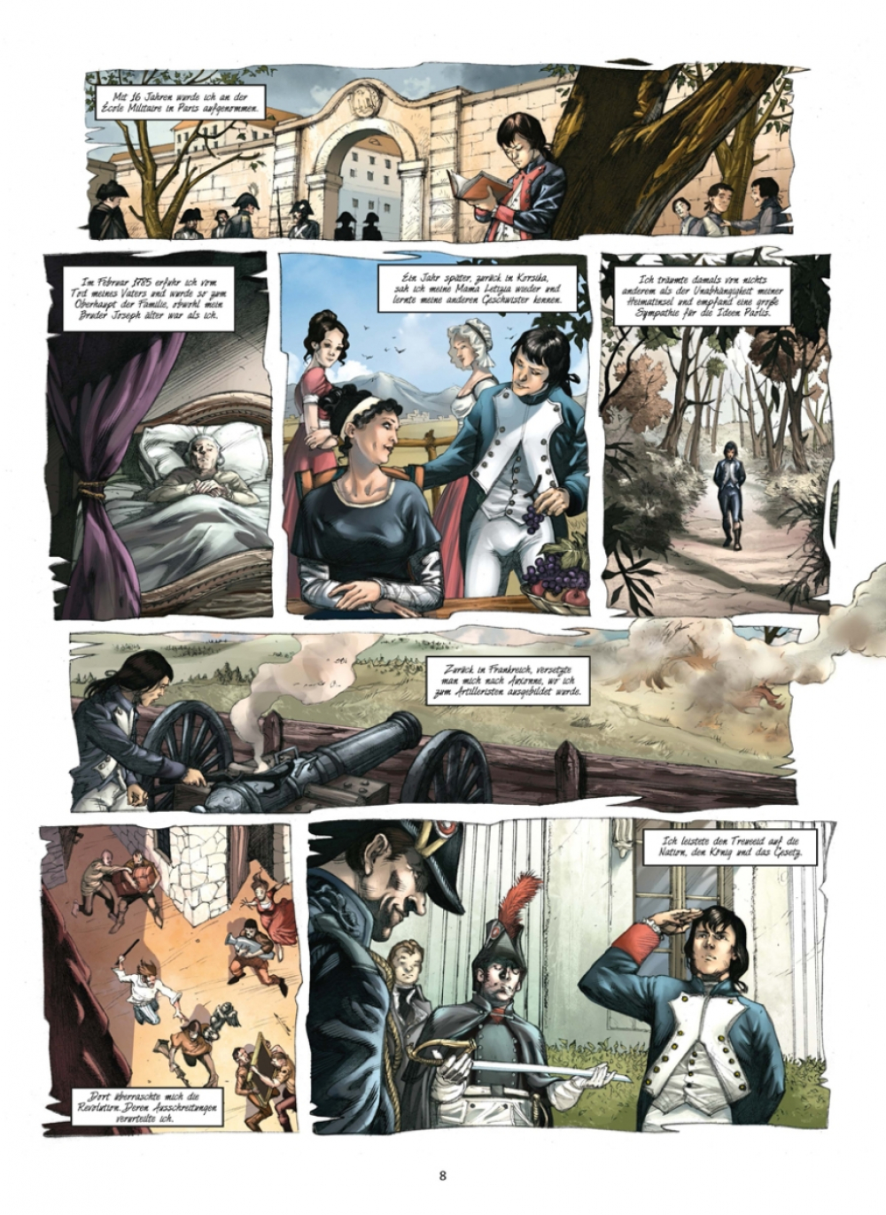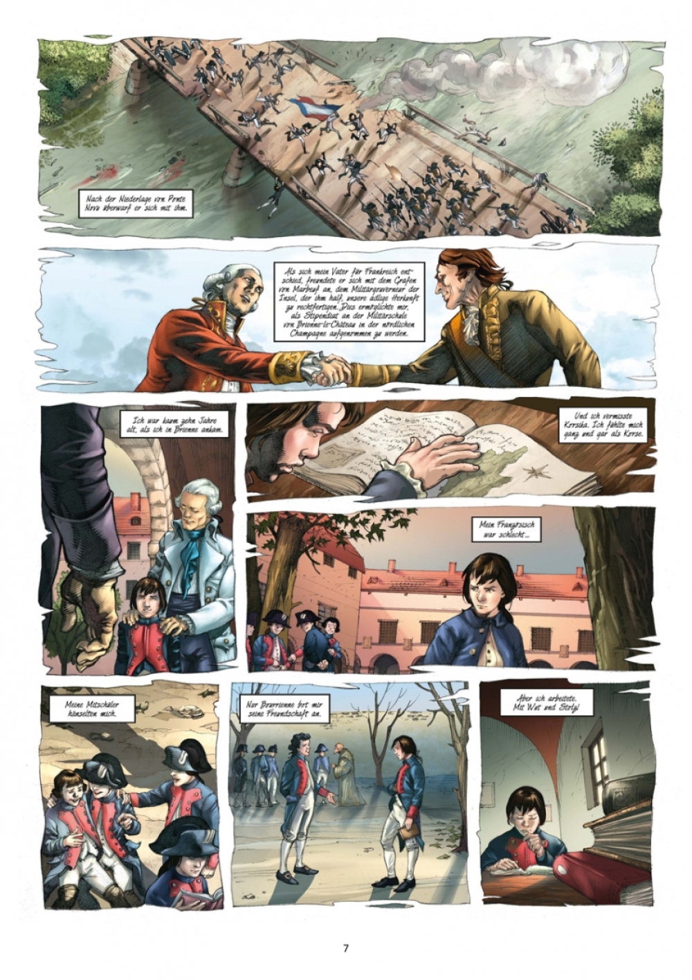 Eine Serie wie die »Historische Persönlichkeiten« Graphic Novels wäre ohne einen Band über Napoleon Bonaparte unvollständig. Auf dreifacher Albenlänge von 168 Seiten widmen sich der versierte Historien-Szenarist Noël Simsolo und Jean Tulard, der führende Experte in der Napoleon-Forschung, dem Leben des »Kleinen Korporals«, von seinen ersten militärischen Erfolgen bis zum Exil auf der Insel Elba.