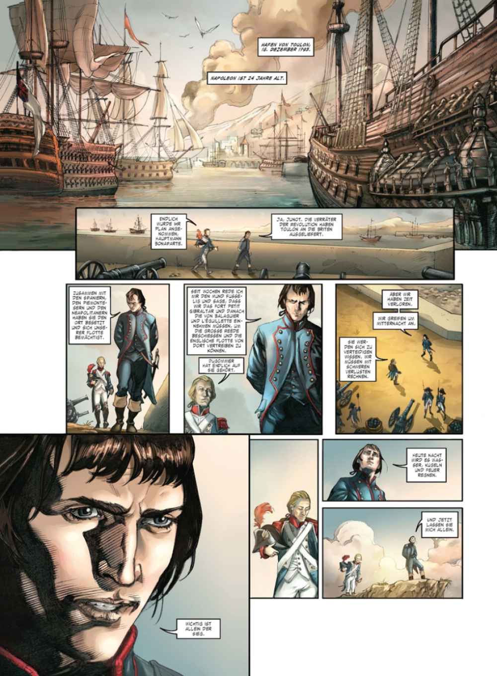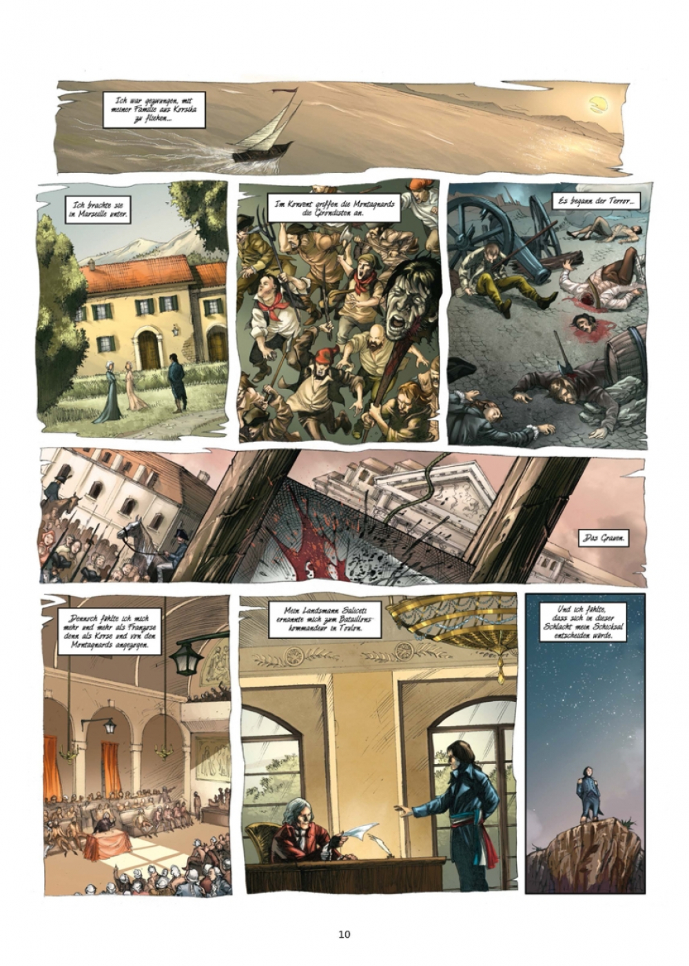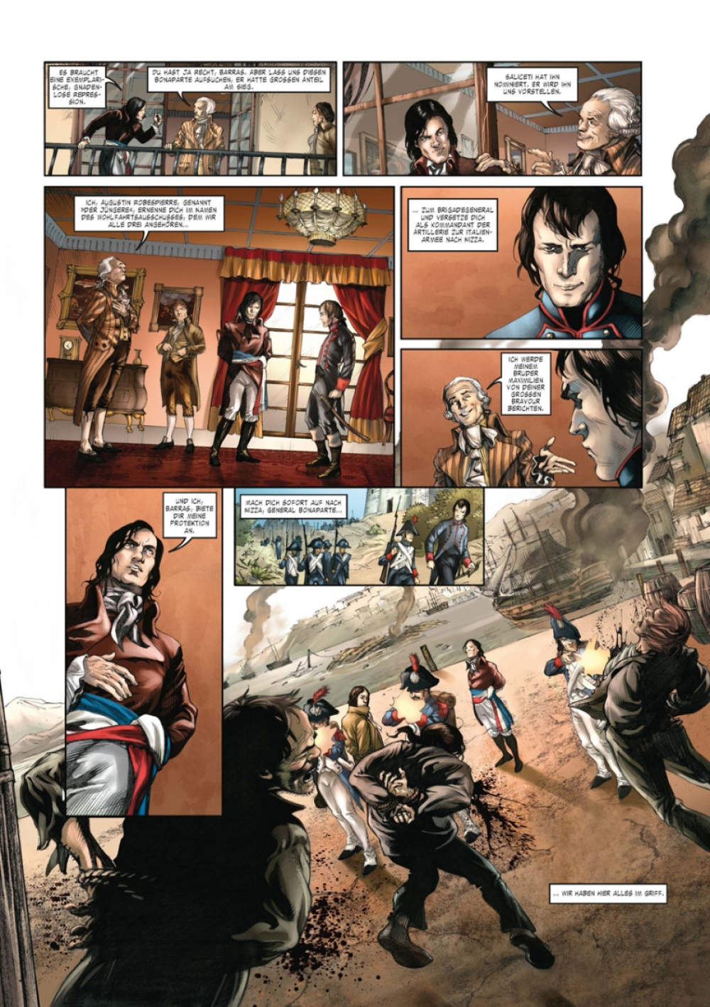 Eine Serie wie die »Historische Persönlichkeiten« Graphic Novels wäre ohne einen Band über Napoleon Bonaparte unvollständig. Auf dreifacher Albenlänge von 168 Seiten widmen sich der versierte Historien-Szenarist Noël Simsolo und Jean Tulard, der führende Experte in der Napoleon-Forschung, dem Leben des »Kleinen Korporals«, von seinen ersten militärischen Erfolgen bis zum Exil auf der Insel Elba.