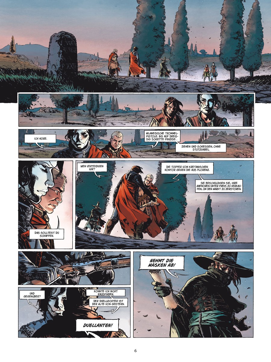 Irgendwo in Italien zu Anfang des 16. Jahr-hunderts… Erschöpft von den blutigen Schlachten beschließen die Reiche des Nordens – von der Toskana bis Piemont –, die Kanonen zum Schweigen zu bringen und ihre Konflikte fortan von Berufs-duellanten austragen zu lassen. So treffen sich eines schönen Tages an die dreißig Duellschützen, um mit der Pistole in der Hand die Ehre ihres Auftraggebers zu verteidigen.
