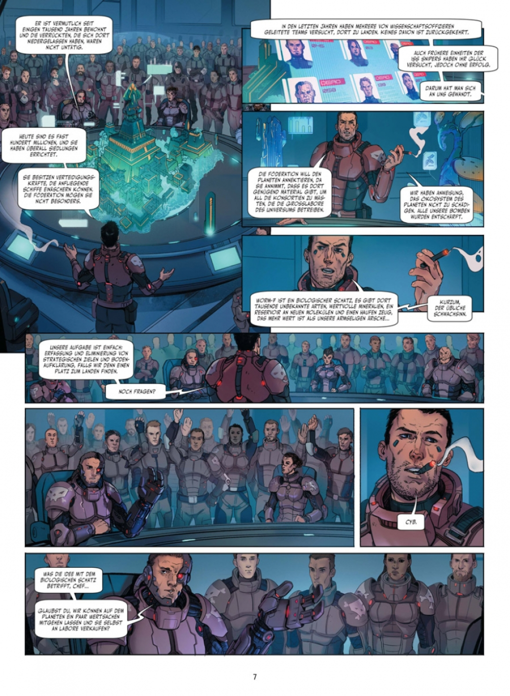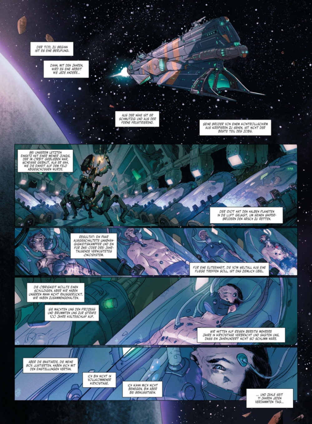 Ein Jahrhundert Kälteschlaf als Strafe dafür, einen Planet voller Hinterwäldler in Schlacke verwandelt zu haben, ist selbst für einen ISS Sniper eine schwer zu schluckende Strafe. Aber ich stecke es weg wie ein Soldat und denke nur an die nächste Mission: einen anderen Planet mit noch mehr Hinterwäldlern auf Vordermann bringen. Ich mag Selbstmordmissionen ebenso sehr wie jeder andere Sniper, aber bei dieser habe ich das Gefühl, dass wir ins Schlachthaus gehen, um Verstecken zu spielen. Und wir sind nicht die Metzger, sondern das Fleisch.