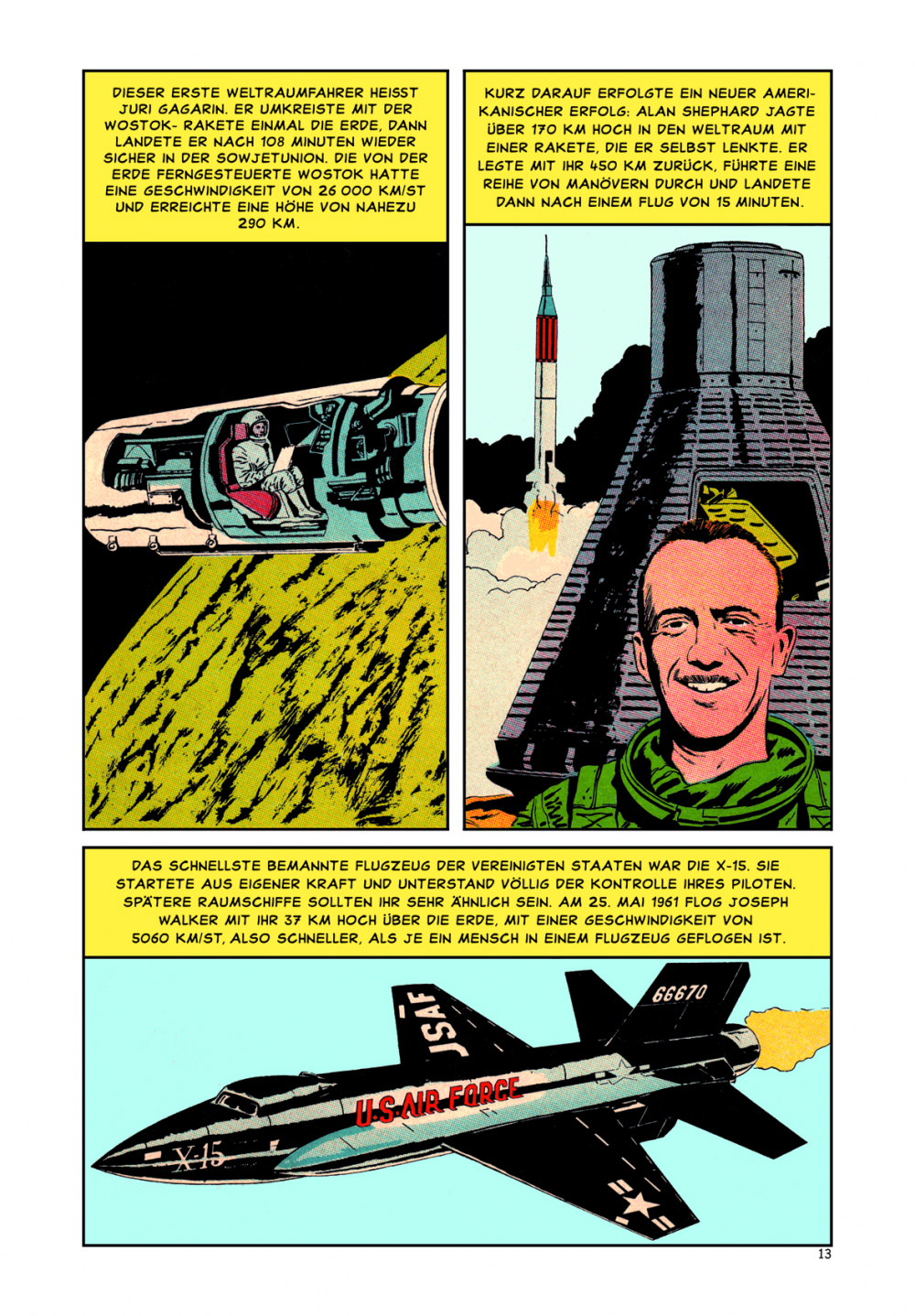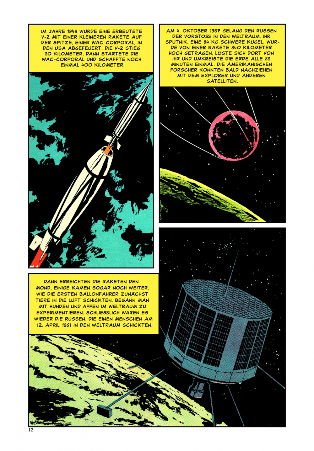 Dies war der Beginn der bemannten Raumfahrt, für die sich nun die Menschen weltweit zu begeistern begannen. Renommierte Comic-Künstler wie Norman Nodel, Angelo Torres, George Evans und Jack Kirby haben den Weg der Menschheit zu den Sternen bis zu diesem historischen Zeitpunkt zeichnerisch in Szene gesetzt. Darüber hinaus enthält der Band viele interessante Einzelheiten über unser Planetensystem und dem ganzen Weltall.