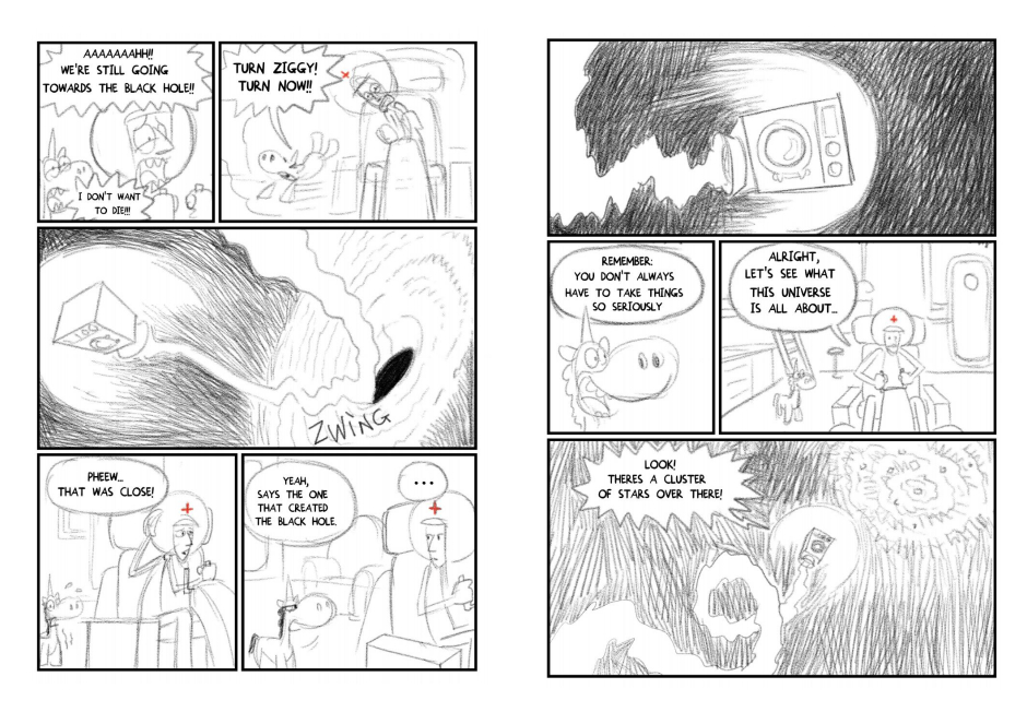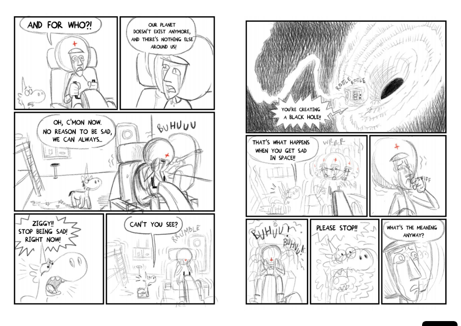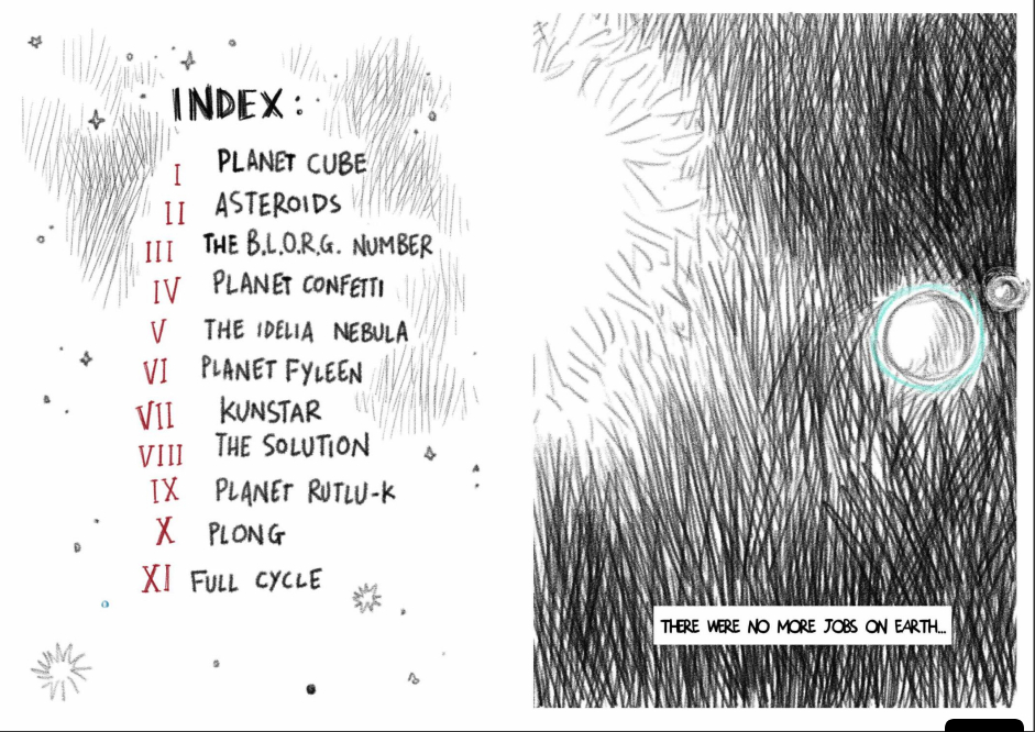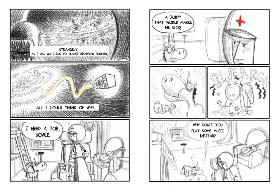 Vertrieben von seinem zerstörten Heimatplaneten versucht er auf verschiedenen Planeten einen Job (er ist Künstler) oder wenigstens Asyl zu bekommen. Dabei wird er mit Kulturen konfrontiert, die größtenteils nicht kompatibel sind mit seinen Talenten und Vorstellungen. Wenigstens hat er auf den elf Planeten, die er besucht, immer seinen kleinen fürsorglichen Freund Bowie, das Einhorn, dabei und verliebt sich sogar.