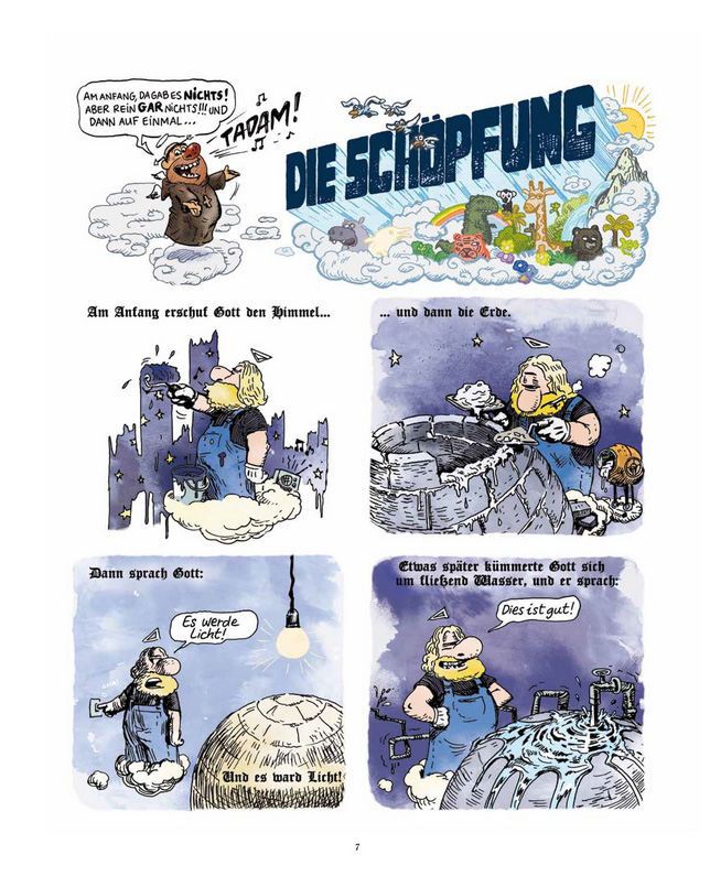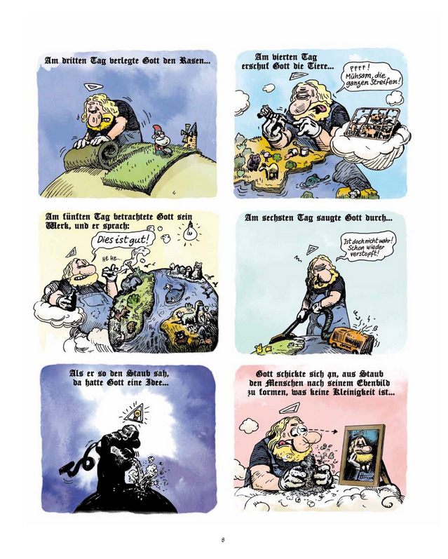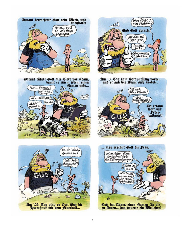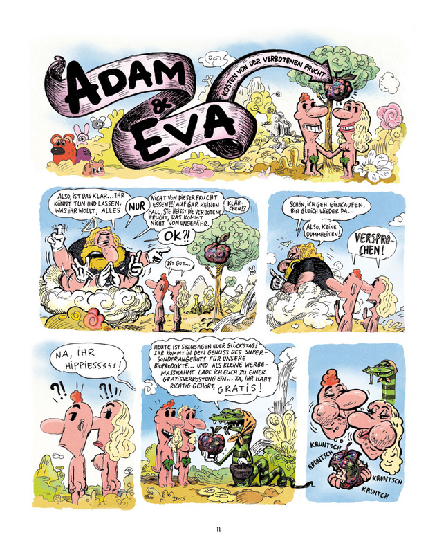 Eine „spirituelle“ Reise zwischen Parodie und Tragödie in einer Vielfalt von Zeichenstilen, bis hin zu fiktiven Werbeanzeigen – absurd, provokant, auf jeden Fall brüllend komisch.