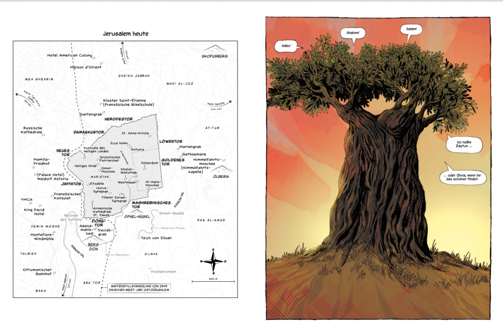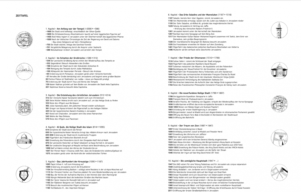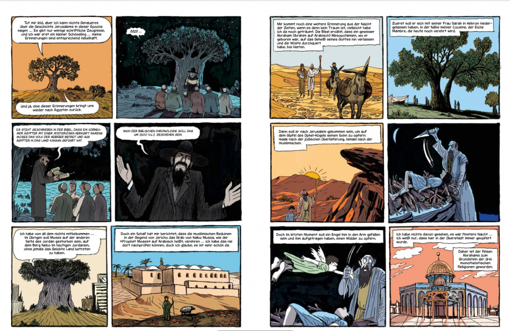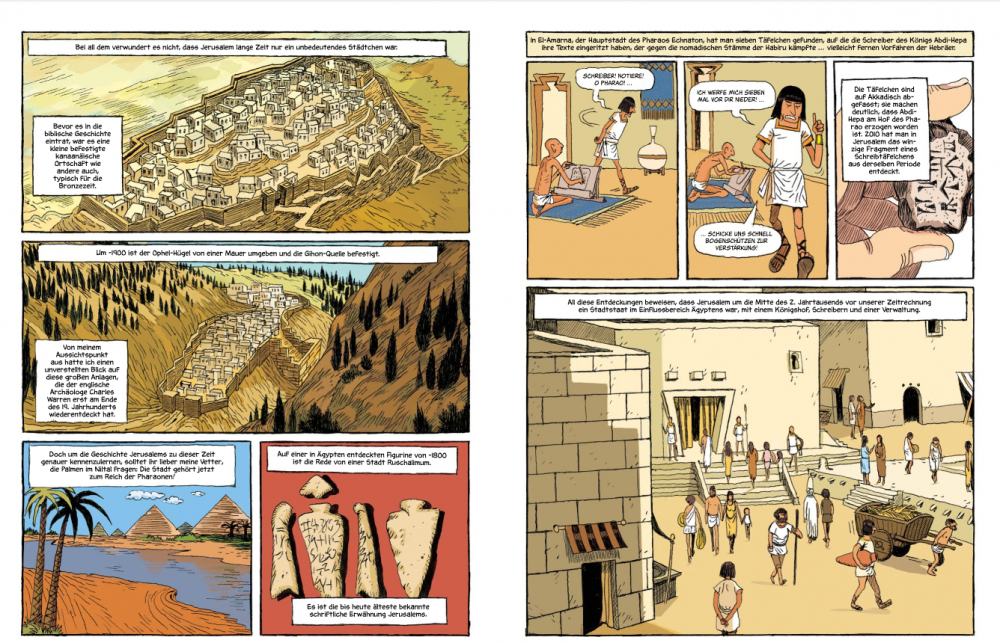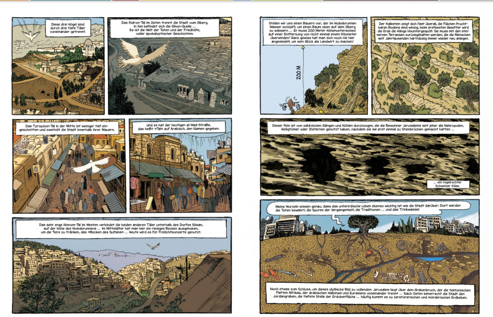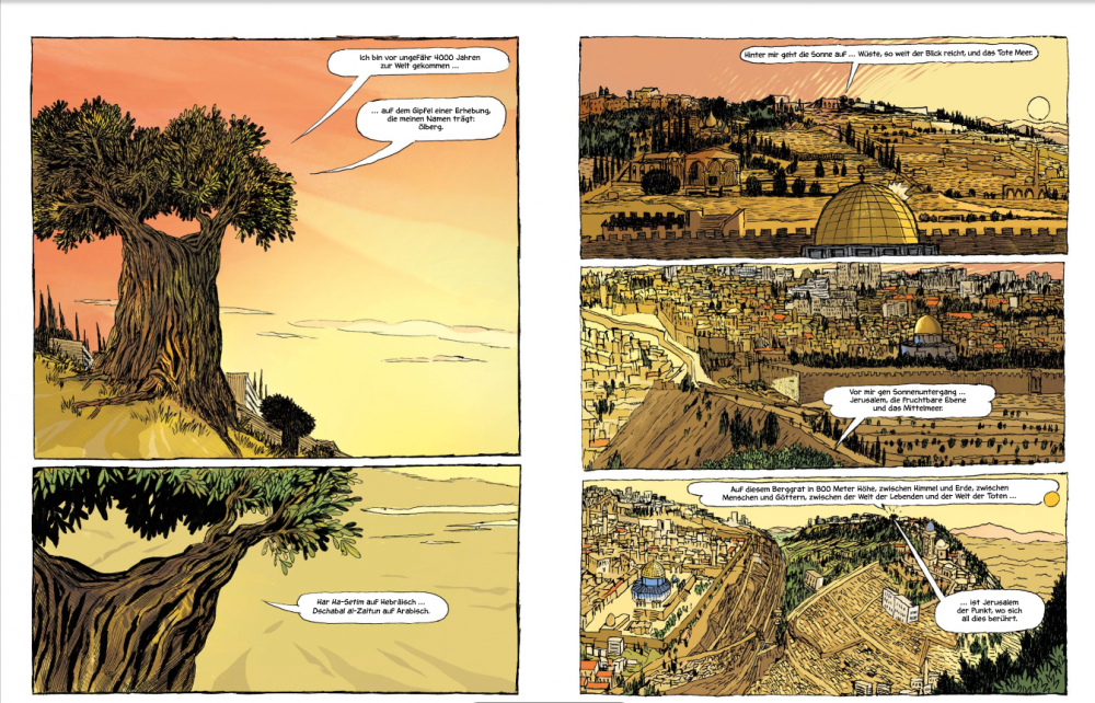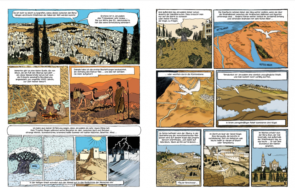 In zehn Kapiteln stellt die Graphic Novel die Zyklen von Leben und Tod, von Krieg und Frieden, von Höhepunkten und Verfall dar. Jerusalem fällt immer wieder und steht von Jahrhundert zu Jahrhundert wieder auf. Jede Periode der Toleranz macht einer Zeit der Eiferer Platz, und alle, die die alleinige Kontrolle über die Stadt wollten, haben sie schließlich verloren. An diesem Ort, an dem die drei großen monotheistischen Religionen aufeinandertreffen, bekämpfen sie sich, kopieren sich und erfinden sich mit den Werkzeugen ihrer Zeit neu.