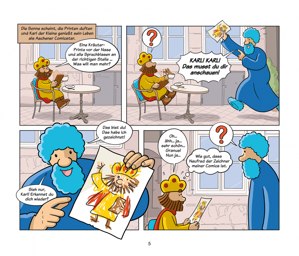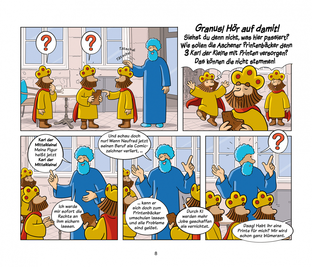 In kürzester Zeit entstehen so viele Karl der Kleine-Doppelgänger, dass die Aachener Bäcker nicht mehr damit nachkommen können, sie alle mit Printen zu versorgen. Da hilft nur noch die Flucht in die Vergangenheit.