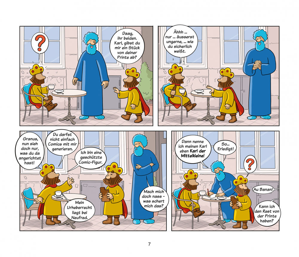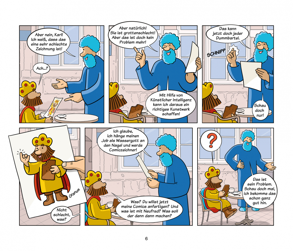 Granus ist von Natur aus ein schlechter Zeichner. Trotzdem möchte der Wassergott seinen Job an den Nagel hängen und Comic-Künstler werden. Mit Hilfe von KI versucht er sich an Karl dem Kleinen.