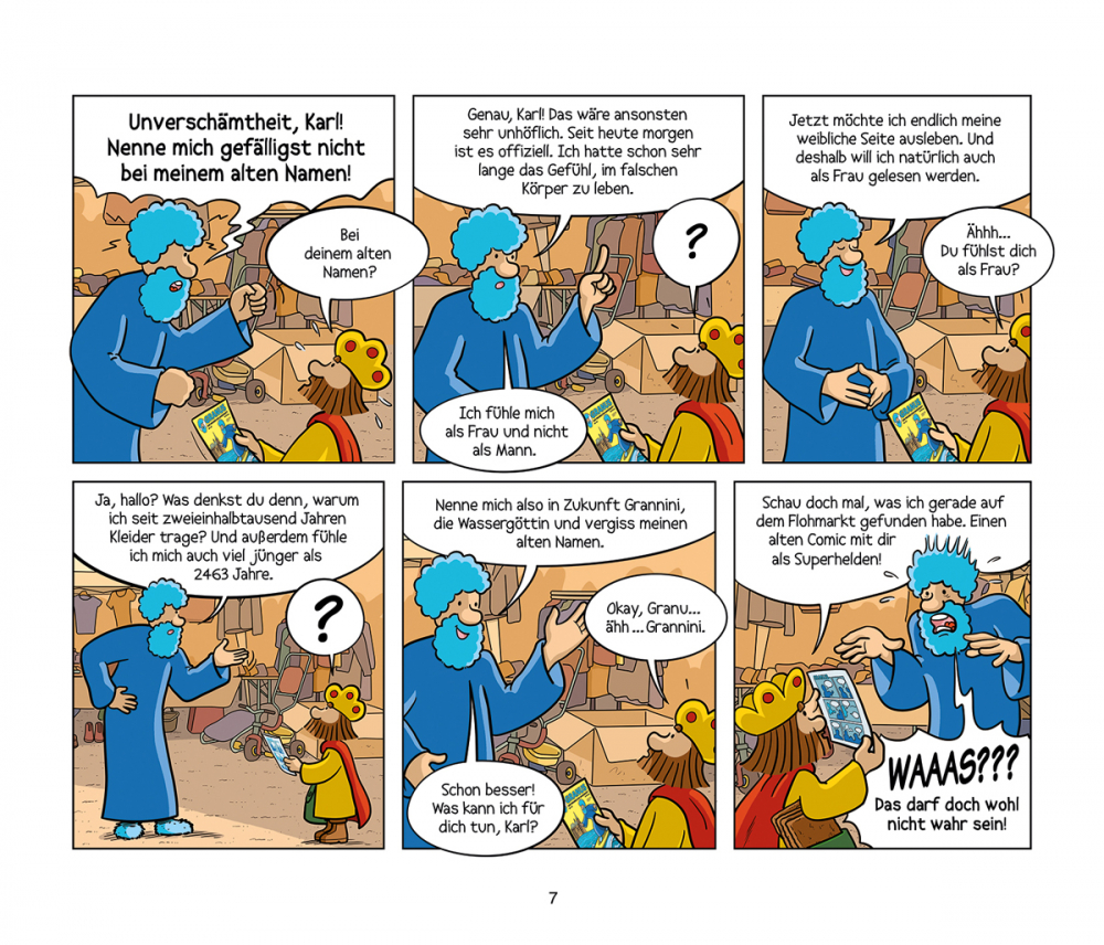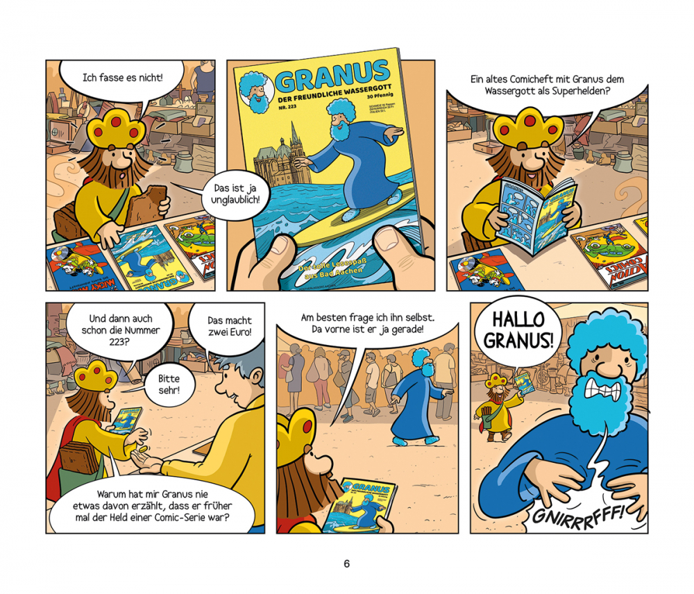 Karl der Kleine findet beim Stöbern auf dem Altstadtflohmarkt ein altes Comicheft, in dem sein Freund, Granus der Wassergott, die Titelrolle spielt. Granus ist über diese Entdeckung überhaupt nicht begeistert. Er fordert Karl auf, mit ihm in die 60er Jahre des vorigen Jahrhunderts zu reisen und die Entstehung dieser Comicserie zu verhindern. Das ist jedoch schwieriger als gedacht und die beiden müssen noch viel weiter in der Zeit zurück, um das Problem zu lösen.