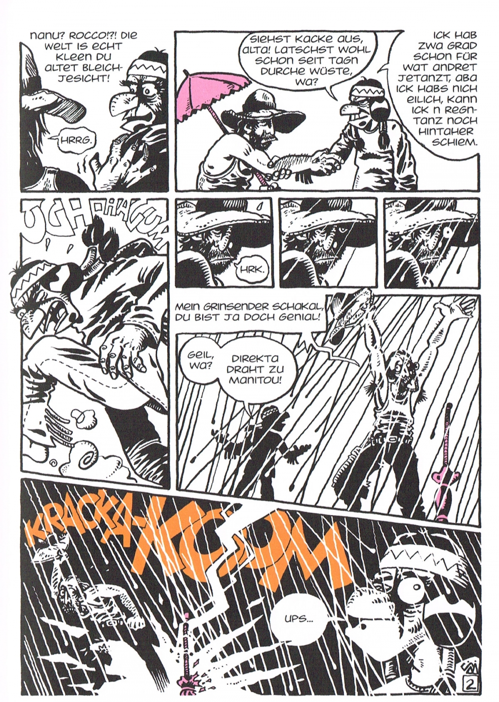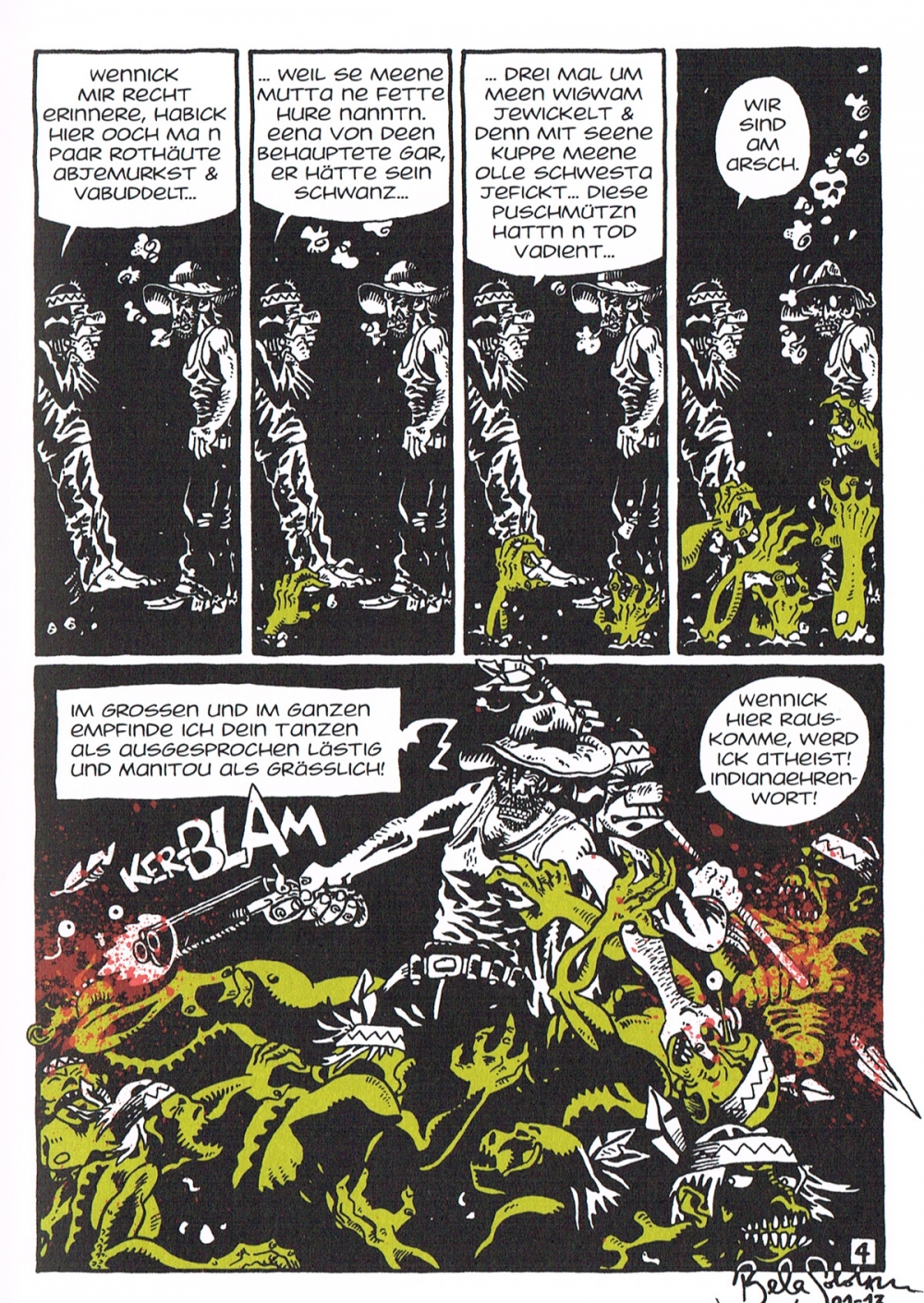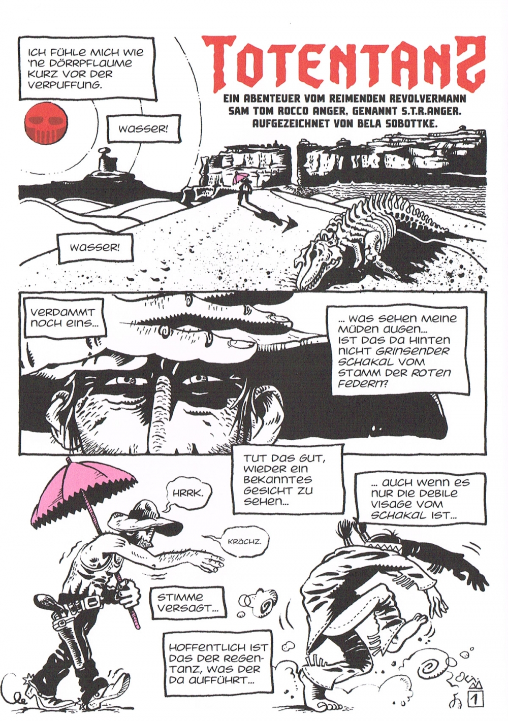 Der mysteriöse Grand Wizard und seine skrupellosen Klans-Soldaten wollen sich dieses letzte bisschen Freiheit unter den Nagel reißen. Doch ein Mann stellt sich ihnen in den Weg: Sam Tom Rocco Anger, der reimende Revolvermann. Um eine Chance gegen die habgierigen Horden zu haben, schart er eine Bande von Ausgestoßenen und Aufständischen um sich. Können sie mit vereinten Kräften dem tödlichen Terror trotzen? Bela Sobottke, Zeichner von KNOCHEN-JOCHEN, KÖNIG KOBRA und KREPIER ODER STIRB präsentiert uns zehn Kapitel feinster Westploitation mit Berliner Würze, serviert in ohrenbetäubendem Reim-O-Rama sowie erstmals in effektvollem Sobokolor.