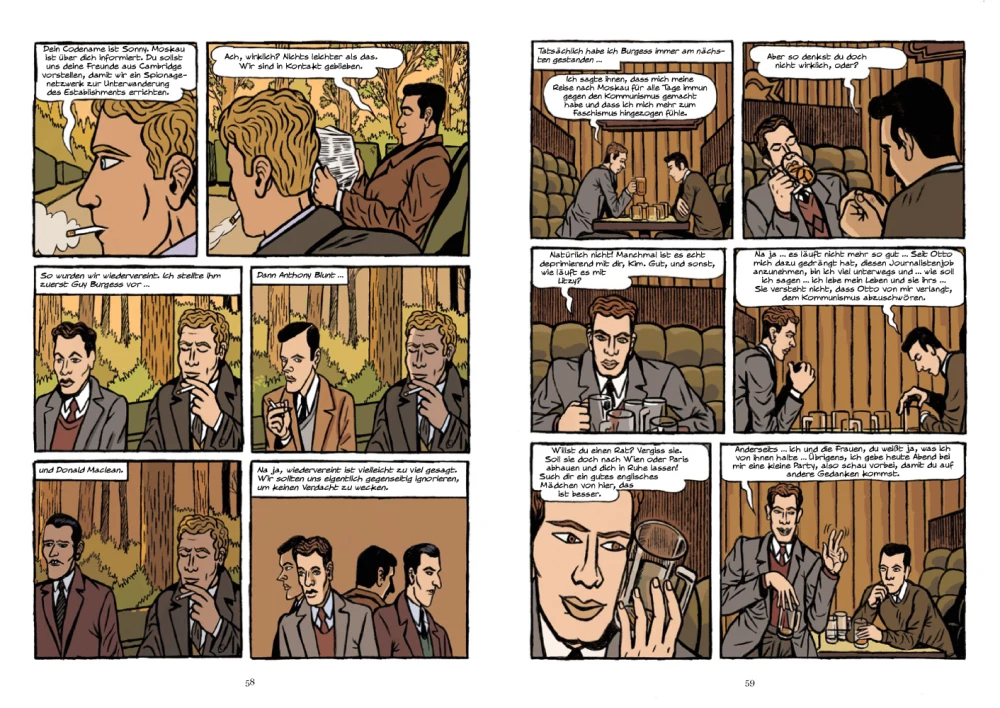 Eine fesselnde Graphic Novel über Überzeugung und Verrat, die auf wahren Tatsachen beruht und Kim Philby als eine der faszinierendsten Persönlichkeiten des 20. Jahrhunderts zeigt – und als Vorbild für den Mythos des Doppelagenten, wie ihn beispielsweise John Le Carré in Dame König Ass Spion beschreibt.