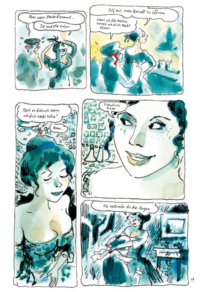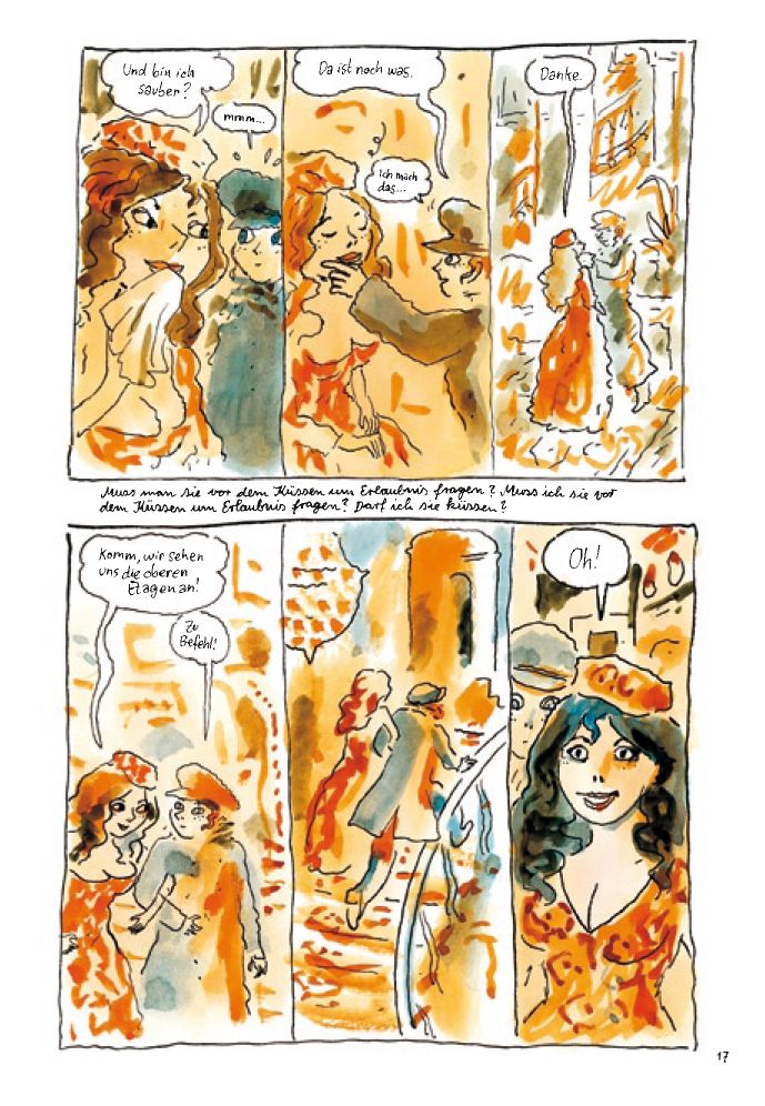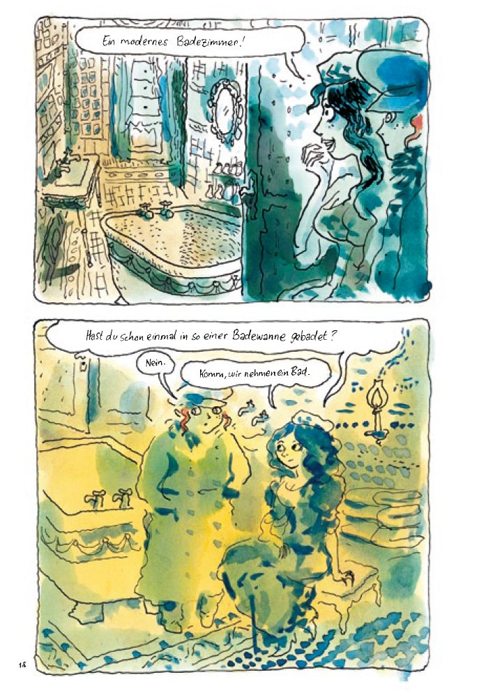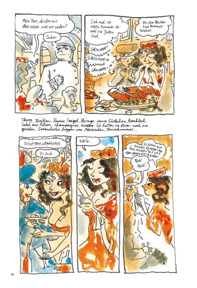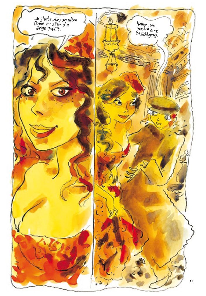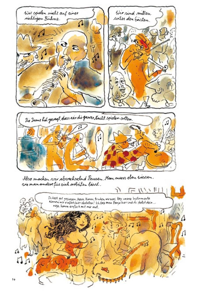 Klezmer ist dass osteuropäische Pedant zur Katze des Rabbiners. Vor allem aber ist es für Sfar die Möglichkeit seineZeichnungen mit leuchtend expressiven Aquarellfarben zu kolorieren. Ein Fest für die Sinne.