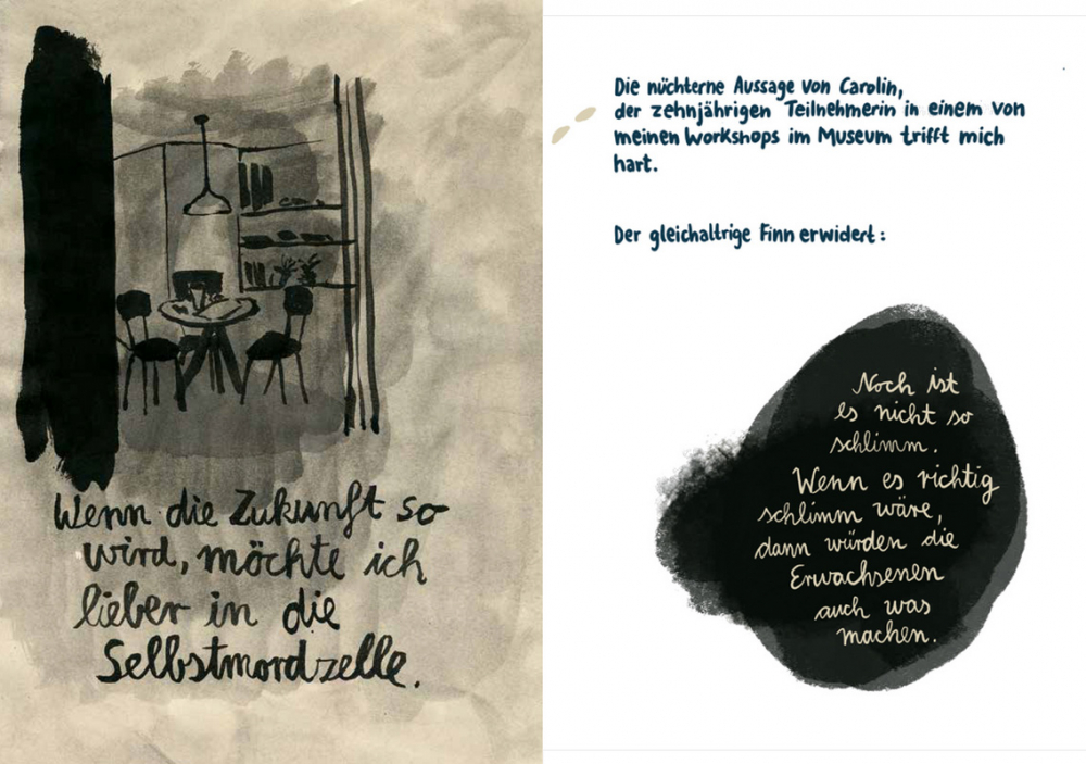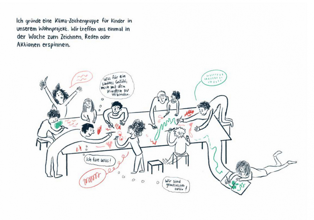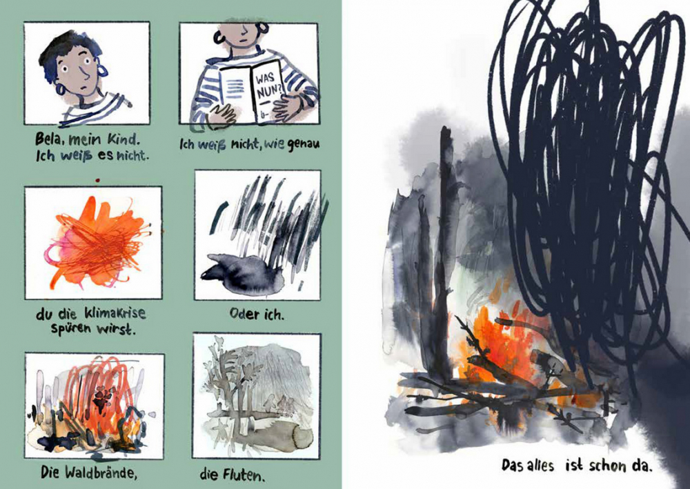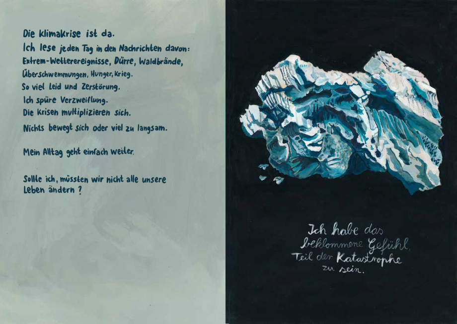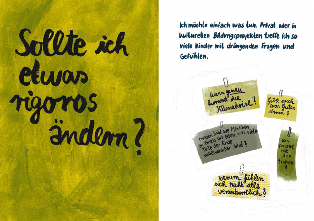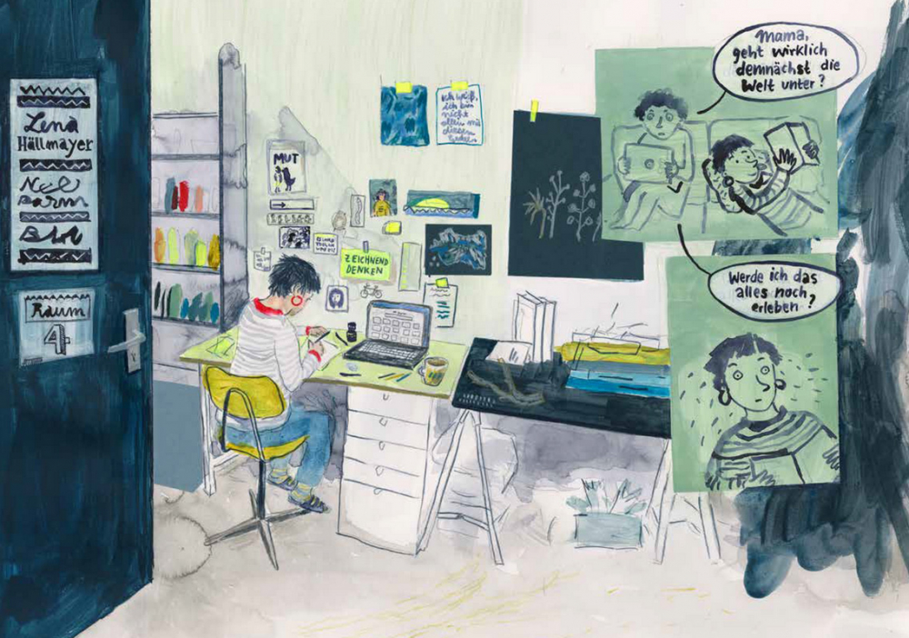 Illustratorin und Kunstpädagogin Lena Hällmayer hat sich all diesen Fragen gestellt und ihren Prozess drei Jahre lang zeichnerisch dokumentiert. Heraus kam nun diese sehr persönliche grafische Erzählung, ein gezeichnetes Protokoll von anfänglicher Ratlosigkeit, von beharrlichem Weitermachen und dem Aufgeben – ein Plädoyer für die Vielfalt von Klimagefühlen.