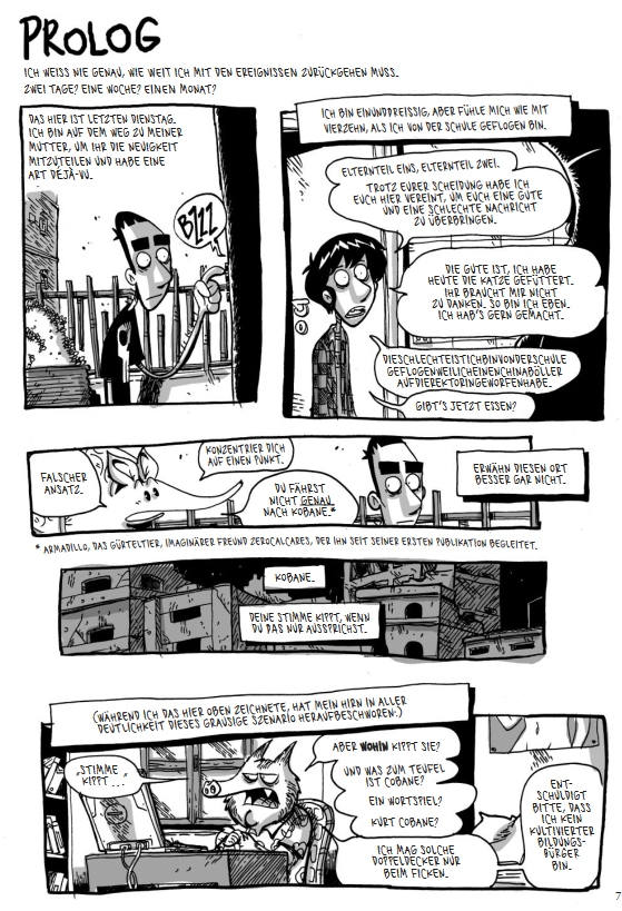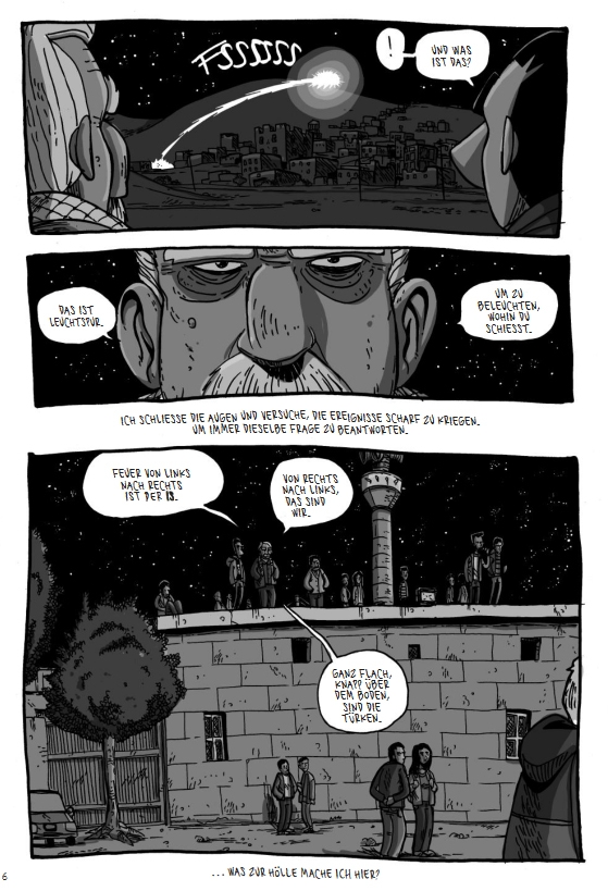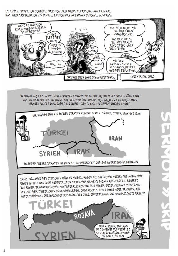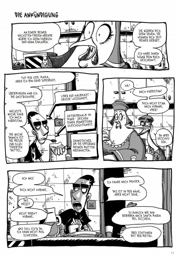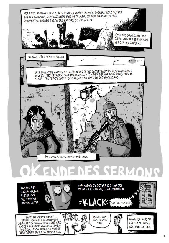 Im Auftrag der italienischen Zeitschrift Internazionale bereiste der Comic-Blogger Zerocalcare das türkisch-syrische Grenzgebiet. In den von Kurden beherrschten Gebieten entstand dort die autonome Region Rojava, mit der Stadt Kobane als Symbol für den Widerstand im Kampf gegen den Islamischen Staat.