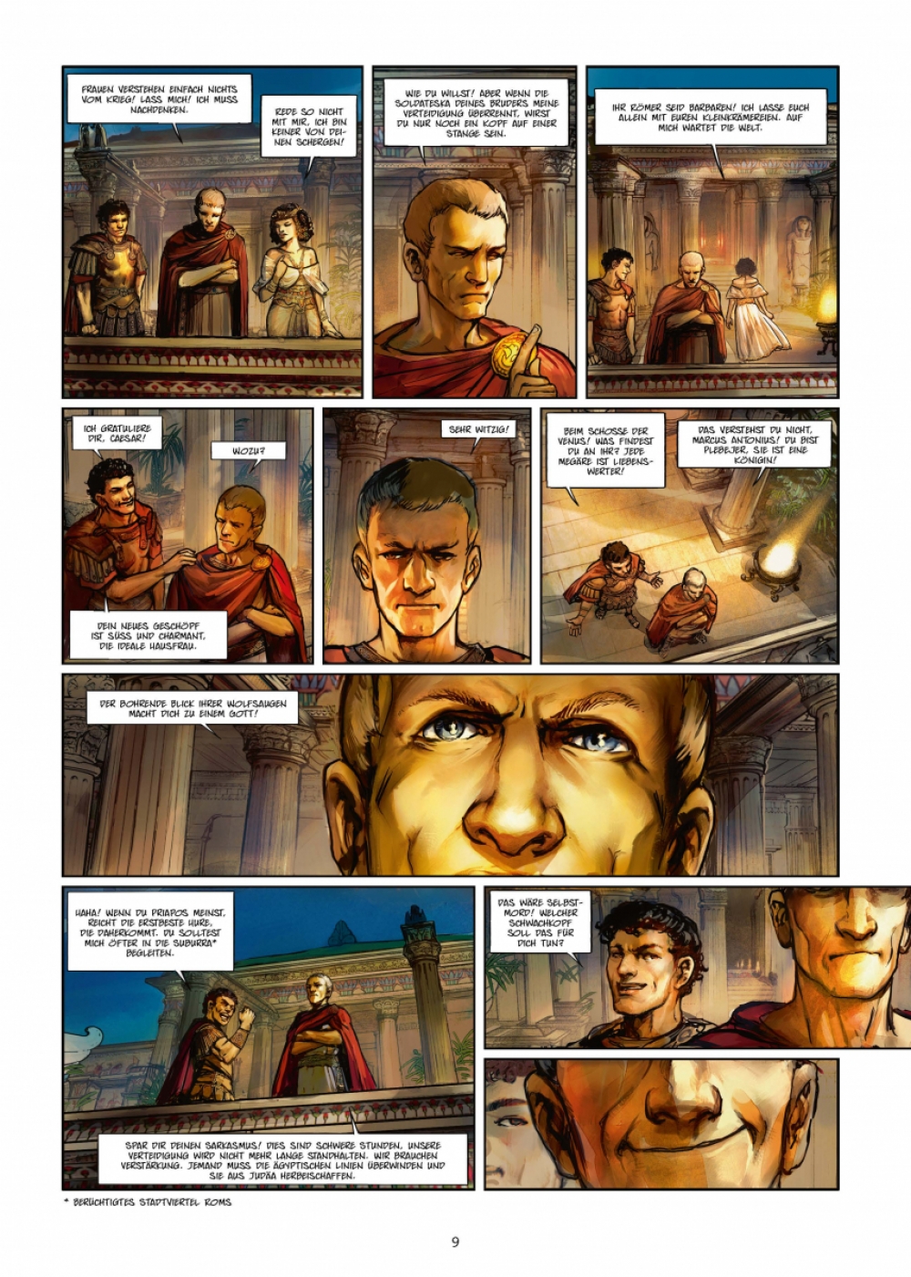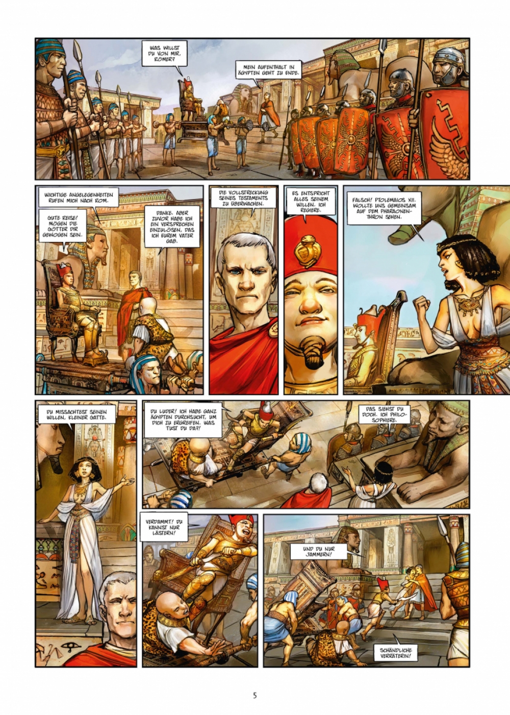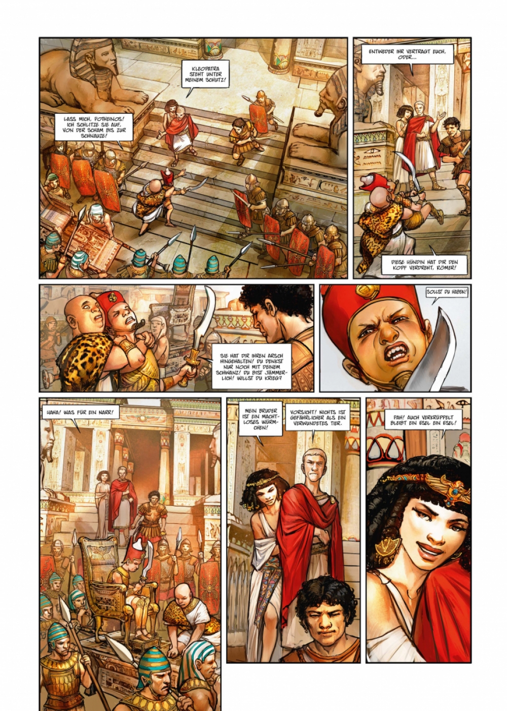 Kleopatra VII. Thea Philopator, Tochter von Ptolemaios XII., besteigt mit 17 Jahren den Thron Ägyptens. Dem Willen ihres Vaters und uralter Tradition folgend, herrscht sie nicht alleine, sondern zusammen mit ihrem zehnjährigen Bruder Ptolemaios XIII., dessen Gemahlin sie werden muss. Mit Willensstärke, Mut und Klugheit will sie die Macht ihrer Nation festigen und ausbauen, vor allem gegenüber dem Römischen Reich. Doch unter dem Einfluss des Eunuchen Potheinos und des Feldherren Achillas wendet sich ihr Bruder gegen sie. Ein blutiger Kampf um die Krone Ägyptens entbrennt, und Kleopatra wird ins Exil gezwungen. Doch ihr Wille, als Frau in einer Männerwelt zu bestehen, bleibt ungebrochen, und so sucht sie die Unterstützung eines mächtigen römischen Konsuls und Generals: Gaius Julius Caesar.