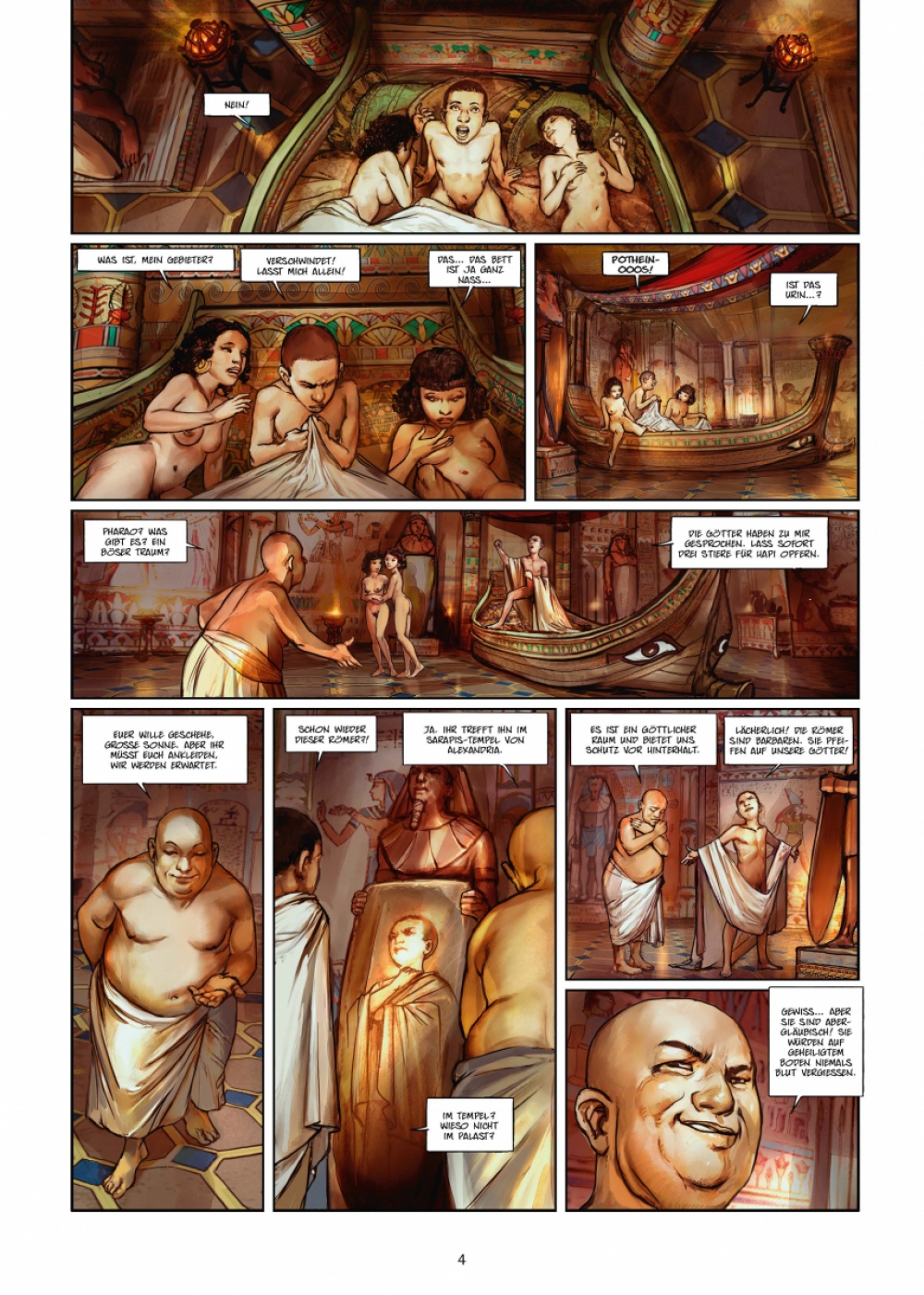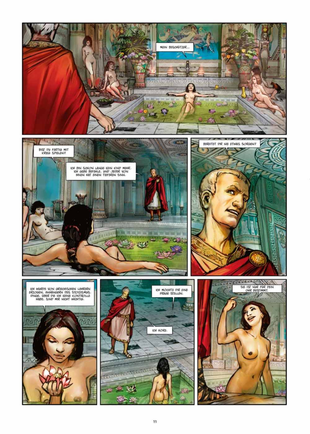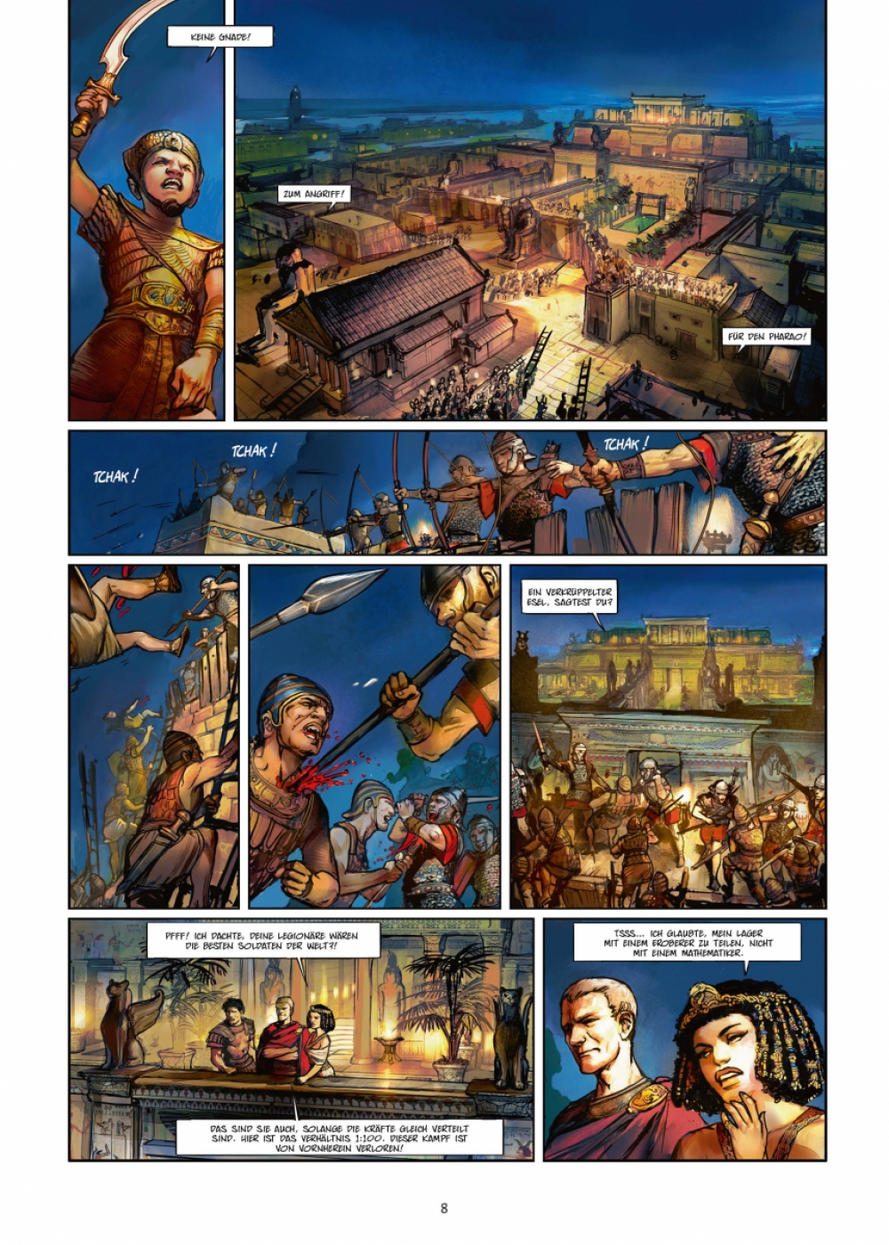 Kleopatra VII. Thea Philopator, Tochter von Ptolemaios XII., besteigt mit 17 Jahren den Thron Ägyptens. Dem Willen ihres Vaters und uralter Tradition folgend, herrscht sie nicht alleine, sondern zusammen mit ihrem zehnjährigen Bruder Ptolemaios XIII., dessen Gemahlin sie werden muss. Mit Willensstärke, Mut und Klugheit will sie die Macht ihrer Nation festigen und ausbauen, vor allem gegenüber dem Römischen Reich. Doch unter dem Einfluss des Eunuchen Potheinos und des Feldherren Achillas wendet sich ihr Bruder gegen sie. Ein blutiger Kampf um die Krone Ägyptens entbrennt, und Kleopatra wird ins Exil gezwungen. Doch ihr Wille, als Frau in einer Männerwelt zu bestehen, bleibt ungebrochen, und so sucht sie die Unterstützung eines mächtigen römischen Konsuls und Generals: Gaius Julius Caesar.