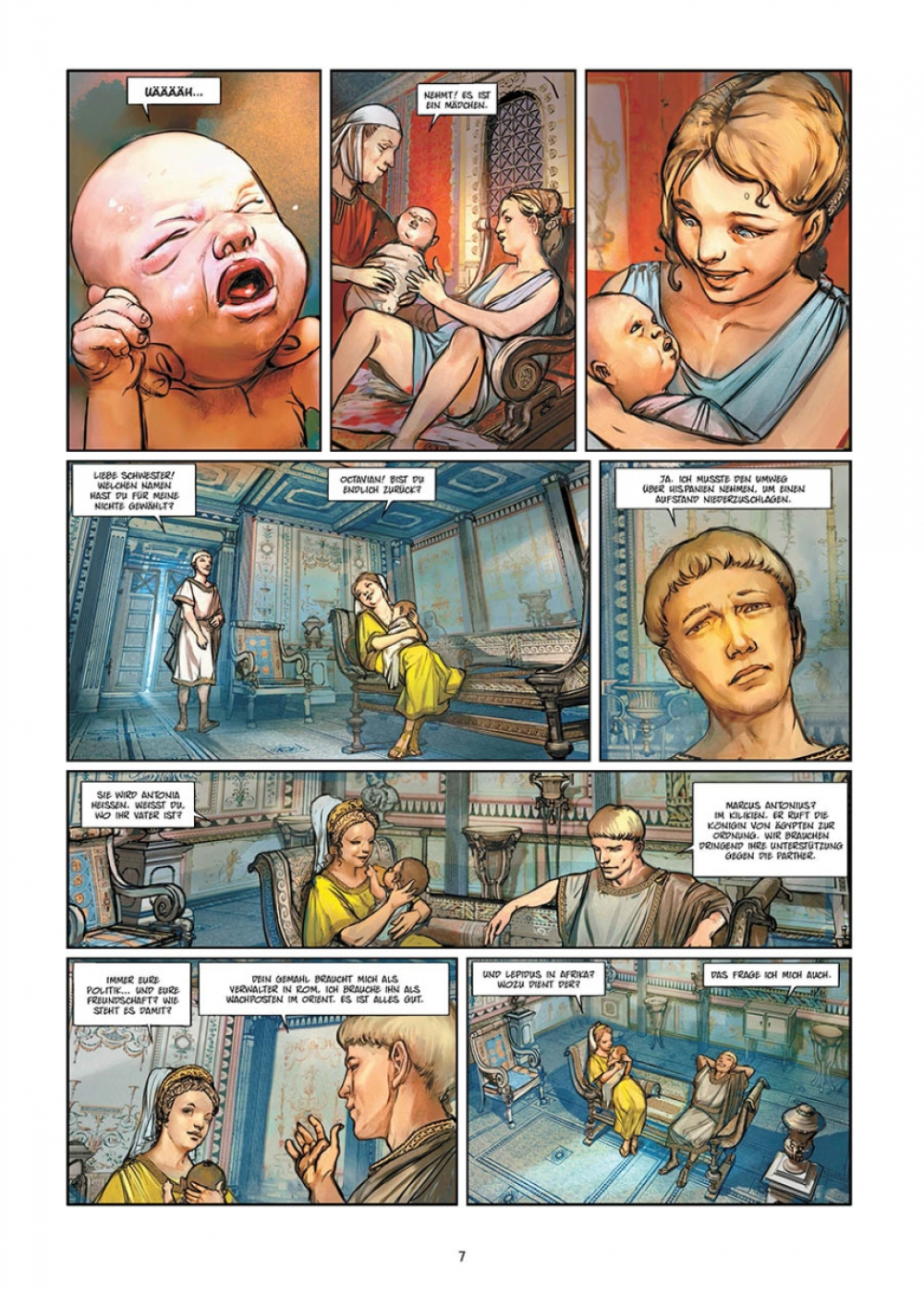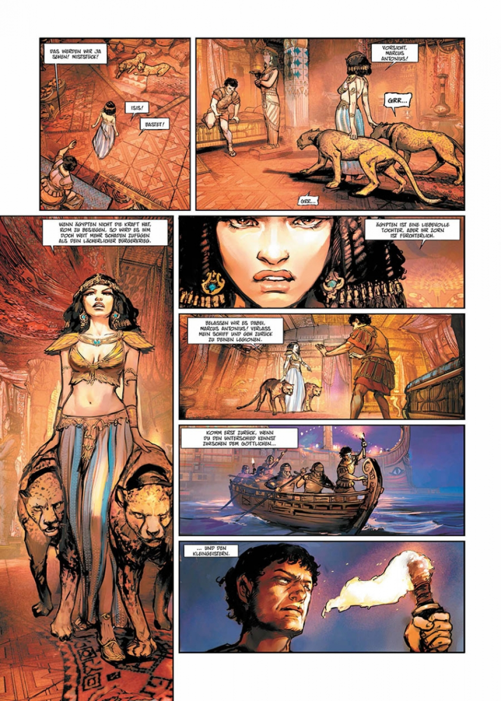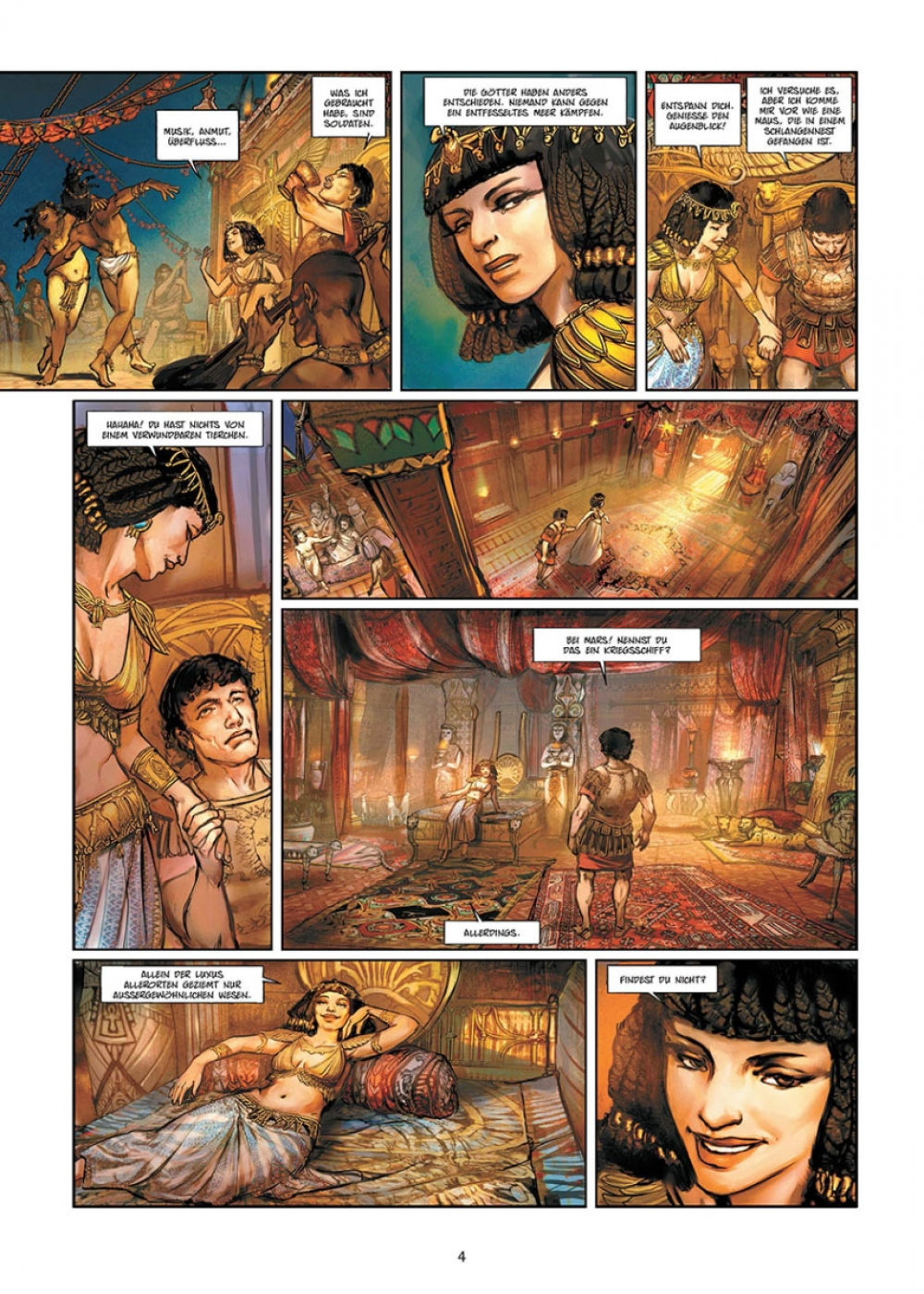 Kleopatra VII. Thea Philopator, Tochter von Ptolemaios XII., besteigt mit 17 Jahren den Thron Ägyptens. Dem Willen ihres Vaters und uralter Tradition folgend, herrscht sie nicht alleine, sondern zusammen mit ihrem zehnjährigen Bruder Ptolemaios XIII., dessen Gemahlin sie werden muss. Mit Willensstärke, Mut und Klugheit will sie die Macht ihrer Nation festigen und ausbauen, vor allem gegenüber dem Römischen Reich. Doch unter dem Einfluss des Eunuchen Potheinos und des Feldherren Achillas wendet sich ihr Bruder gegen sie. Ein blutiger Kampf um die Krone Ägyptens entbrennt, und Kleopatra wird ins Exil gezwungen. Doch ihr Wille, als Frau in einer Männerwelt zu bestehen, bleibt ungebrochen, und so sucht sie die Unterstützung eines mächtigen römischen Konsuls und Generals: Gaius Julius Caesar.