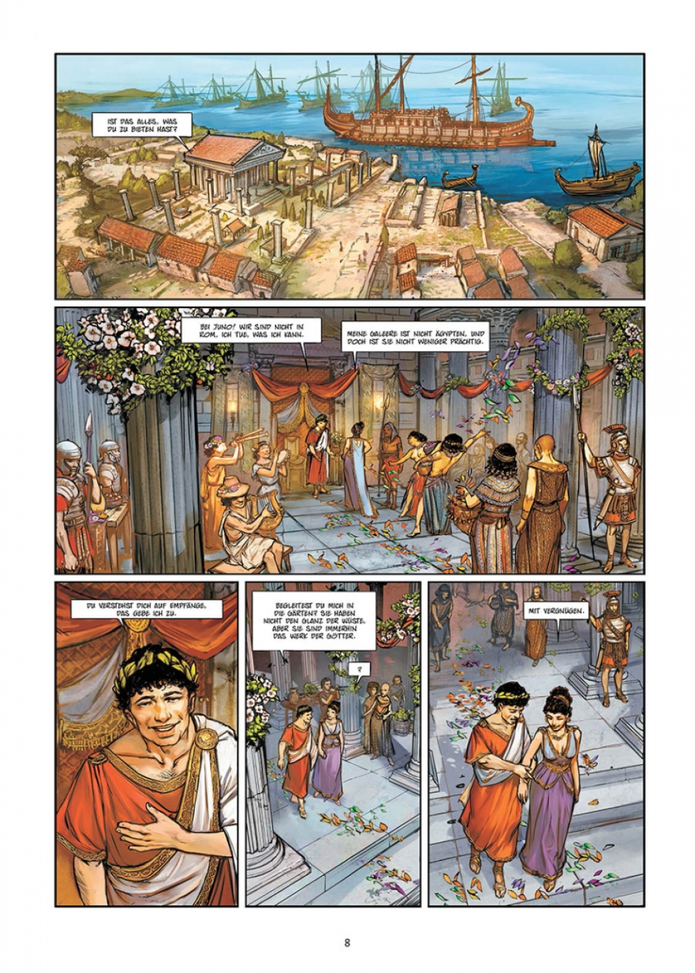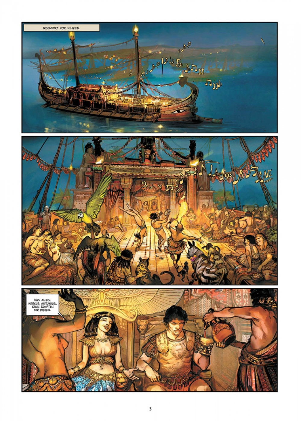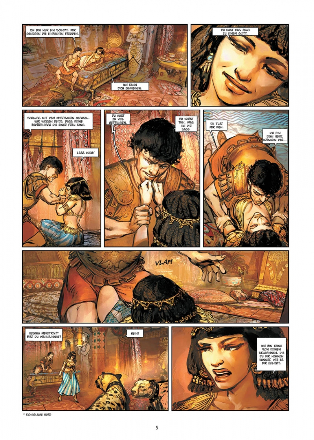 Kleopatra VII. Thea Philopator, Tochter von Ptolemaios XII., besteigt mit 17 Jahren den Thron Ägyptens. Dem Willen ihres Vaters und uralter Tradition folgend, herrscht sie nicht alleine, sondern zusammen mit ihrem zehnjährigen Bruder Ptolemaios XIII., dessen Gemahlin sie werden muss. Mit Willensstärke, Mut und Klugheit will sie die Macht ihrer Nation festigen und ausbauen, vor allem gegenüber dem Römischen Reich. Doch unter dem Einfluss des Eunuchen Potheinos und des Feldherren Achillas wendet sich ihr Bruder gegen sie. Ein blutiger Kampf um die Krone Ägyptens entbrennt, und Kleopatra wird ins Exil gezwungen. Doch ihr Wille, als Frau in einer Männerwelt zu bestehen, bleibt ungebrochen, und so sucht sie die Unterstützung eines mächtigen römischen Konsuls und Generals: Gaius Julius Caesar.