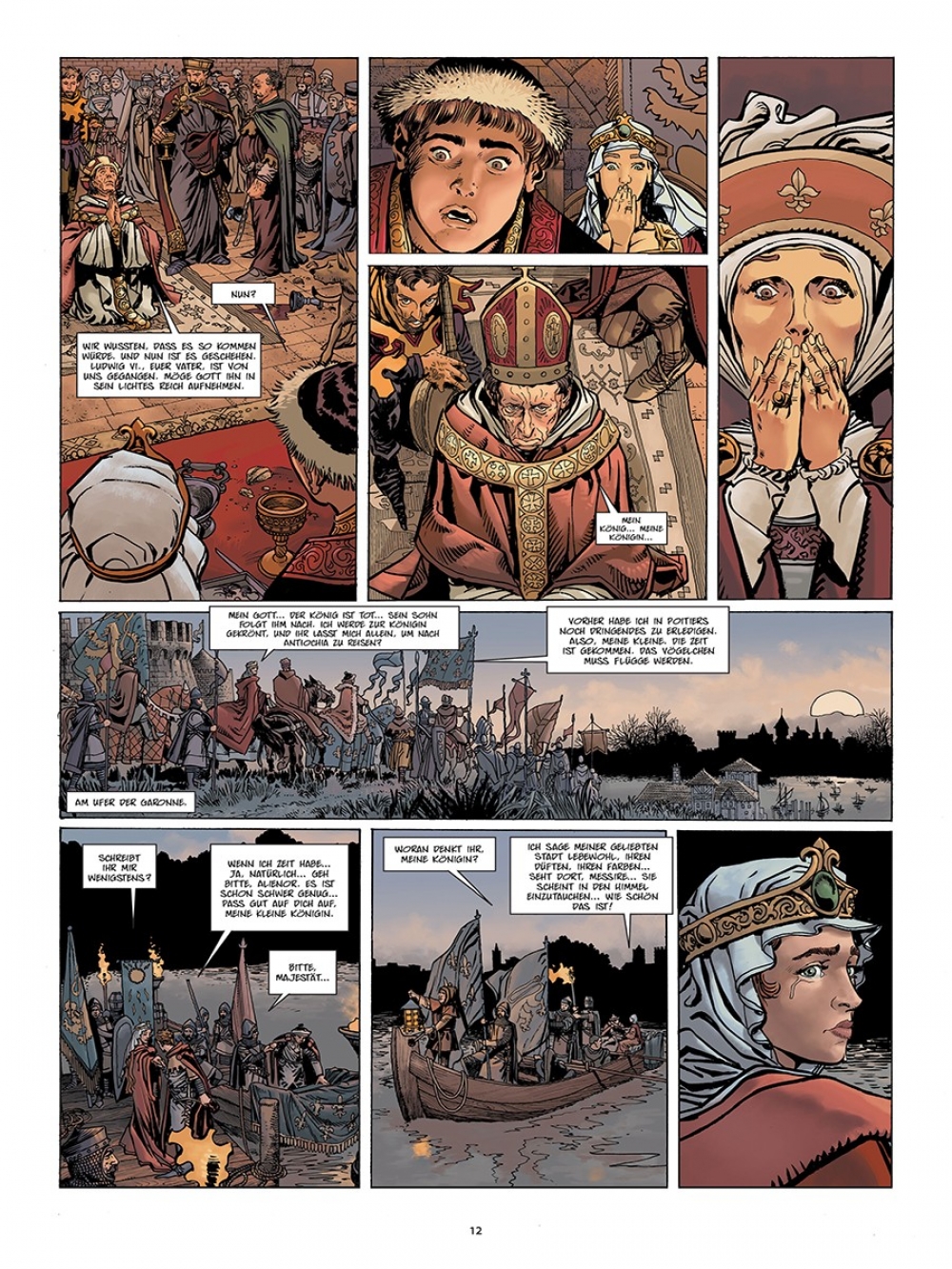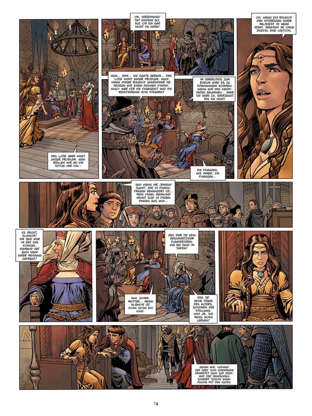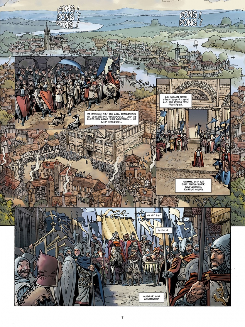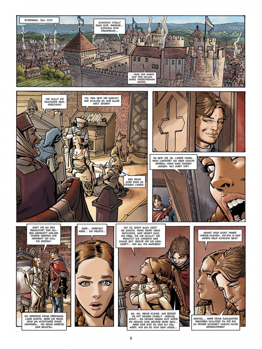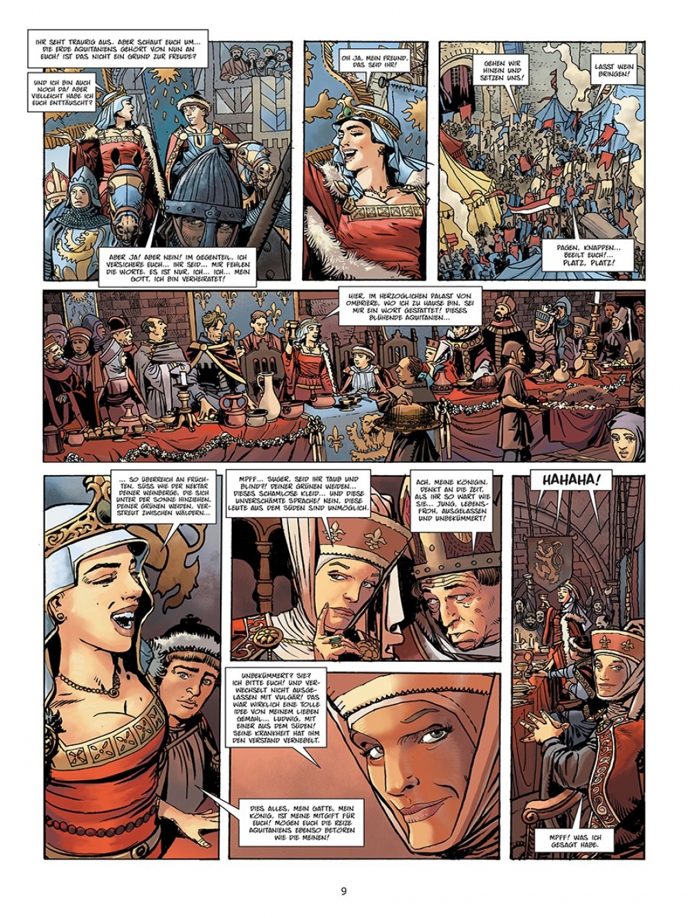 Die Reihe »Königliches Blut« ist solchen Herrscherinnen gewidmet, die, häufig umstritten, in der Geschichte zumindest nachhaltige Spuren hinterließen. Arnaud Delalande (»Surcouf«) und Simona Mogavino haben das wechselvolle Schicksal der Alienor von Aquitanien in ein opulentes mittelalterliches Sittenbild eingebettet, Ritterspektakel und höfisches Ränkespiel inklusive, das Carlos Gomez entsprechend üppig illustriert. Im Mittelpunkt steht aber klar und unmissverständlich das Porträt einer starken Frau – allen »schwarzen Legenden« zum Trotz.