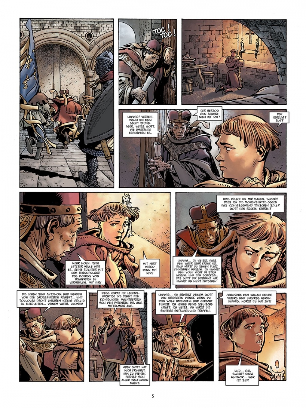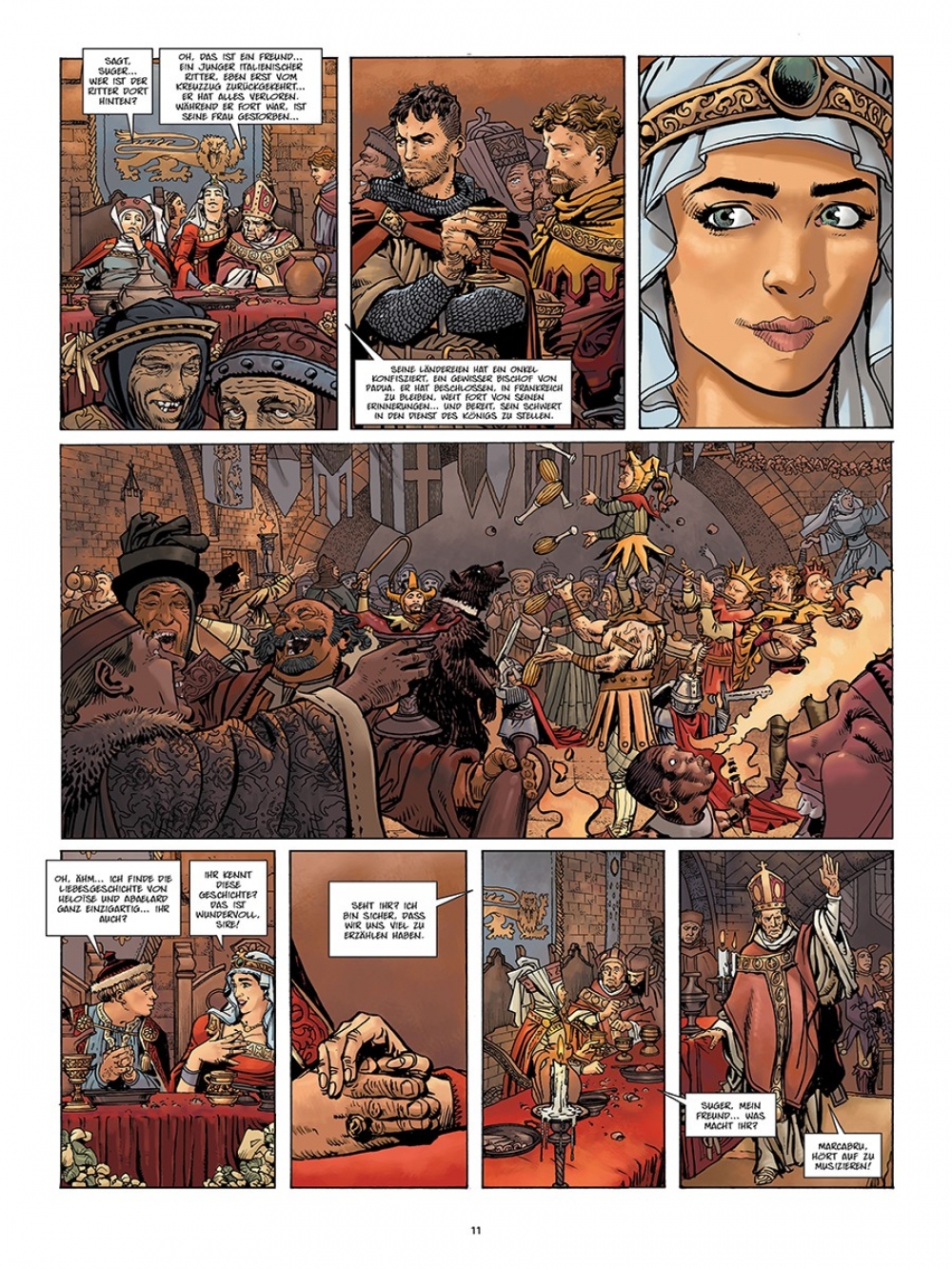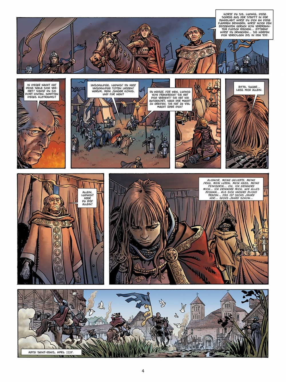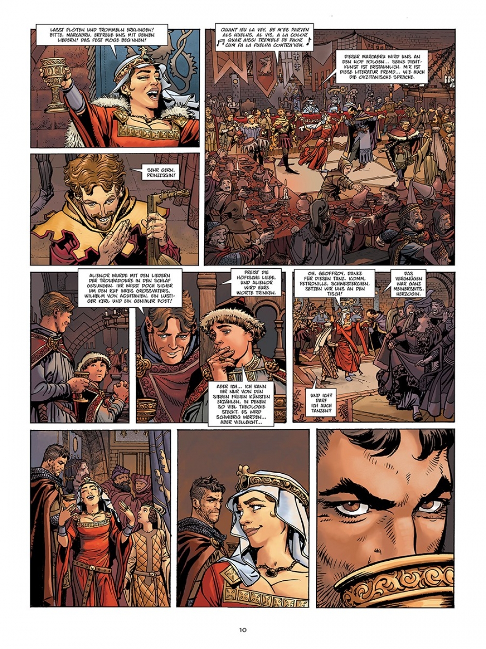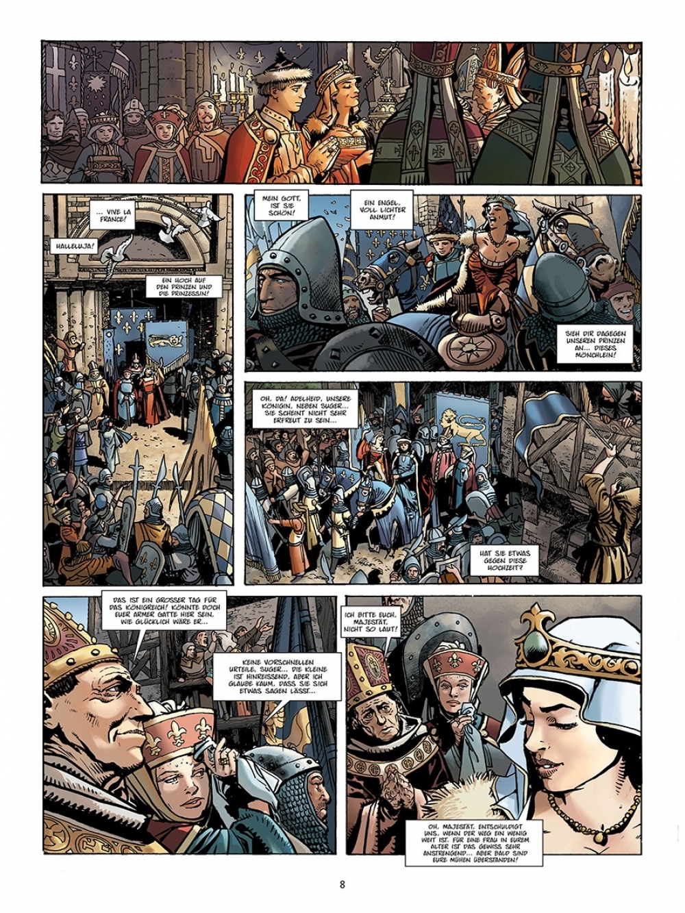 Die Reihe »Königliches Blut« ist solchen Herrscherinnen gewidmet, die, häufig umstritten, in der Geschichte zumindest nachhaltige Spuren hinterließen. Arnaud Delalande (»Surcouf«) und Simona Mogavino haben das wechselvolle Schicksal der Alienor von Aquitanien in ein opulentes mittelalterliches Sittenbild eingebettet, Ritterspektakel und höfisches Ränkespiel inklusive, das Carlos Gomez entsprechend üppig illustriert. Im Mittelpunkt steht aber klar und unmissverständlich das Porträt einer starken Frau – allen »schwarzen Legenden« zum Trotz.