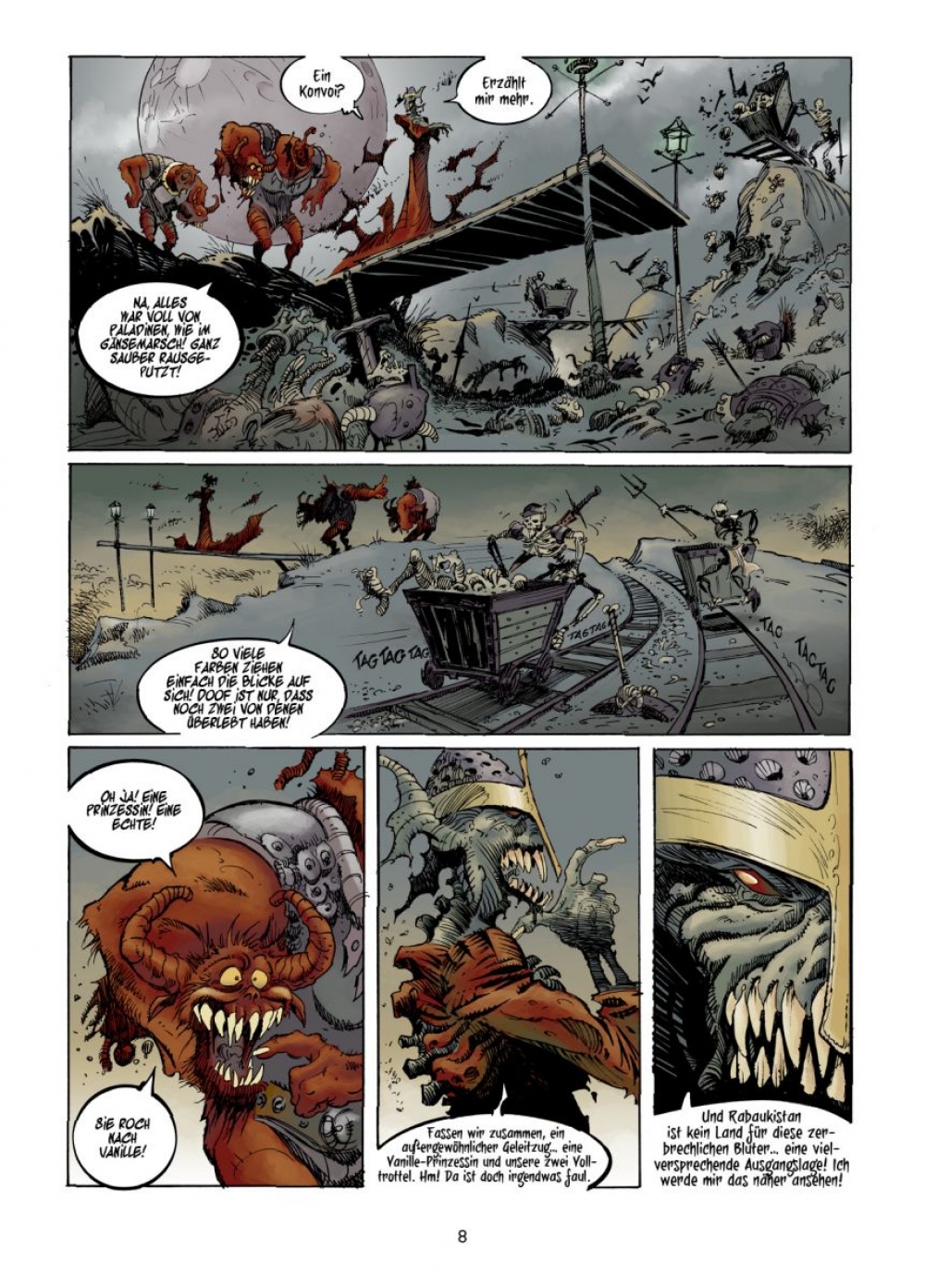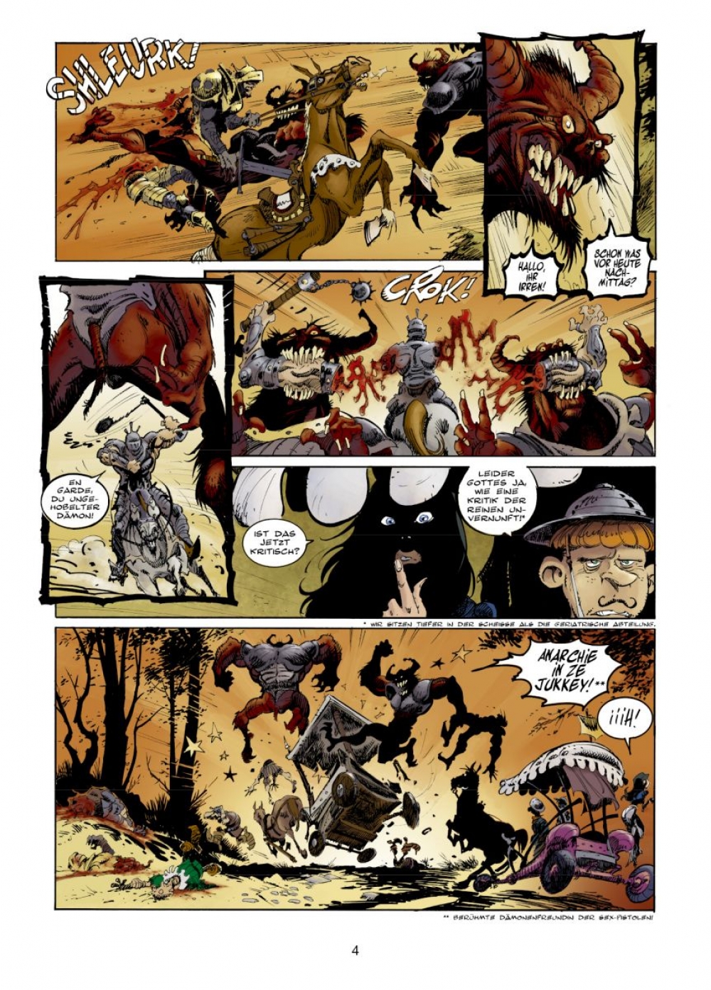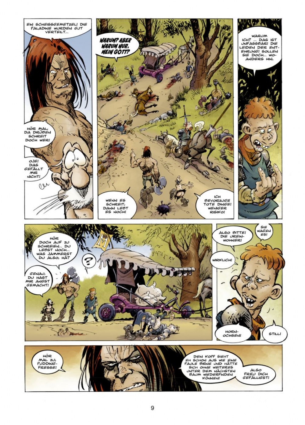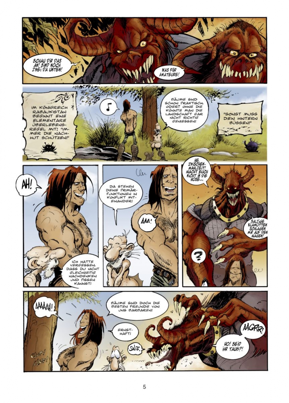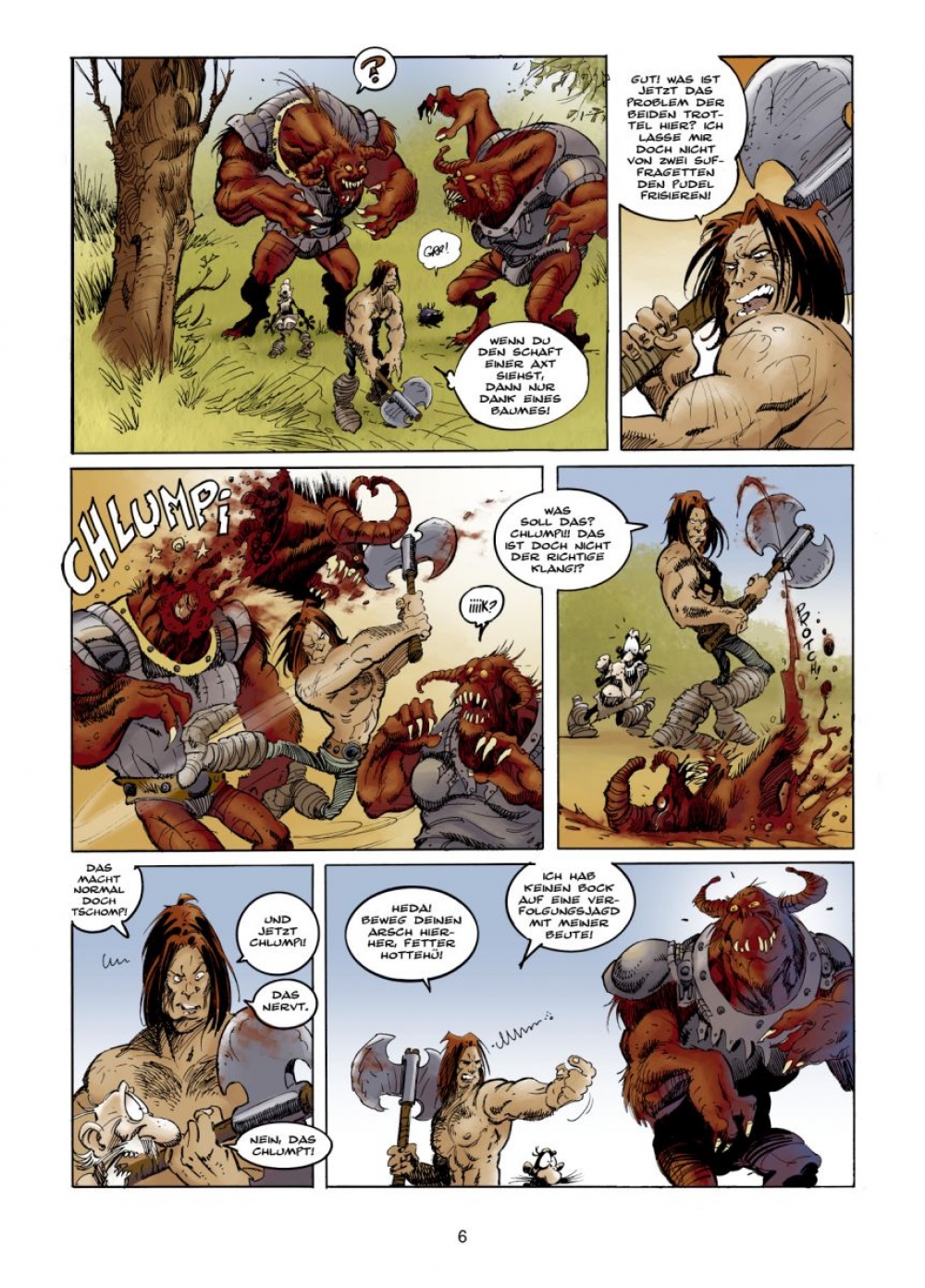 Die männlichen Untertanen im Barbarenreich von Raubaukistan können ganz gut mit einem Erbsenhirn leben, aber mit zwei Erbsen in der Hose anstelle ihrer stolzen Gehänge wären sie weniger glücklich. Und genau das droht Mutter Gebärfreude ihnen an. So wird Krän, die Quelle ihres Unmuts (er hat nämlich die Liebesgöttin gepimpert), vom Hof gejagt, um seine krummen Touren wieder auszubügeln. Und er begibt sich auf eine Fahrt, bei der die Äxte keinen Rost ansetzen..