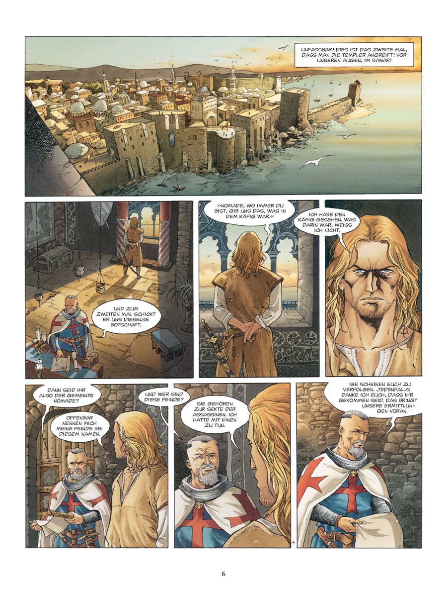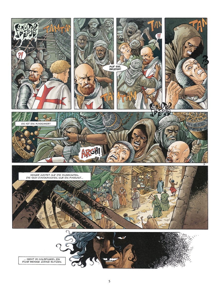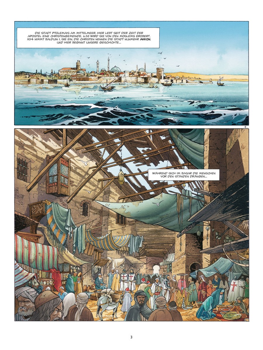 Sein Name ist El Hadj. Er ist der, der ohne Erbarmen sowohl auf das Kreuz als auch auf die Sichel einschlägt. Für seine zu trauriger Berühmtheit gelangte Sekte der Assassinen hat Ottar Benk eine Mission zu erfüllen: In aller Heimlichkeit und ohne jegliche Spuren zu hinterlassen, soll er Rainald von Chatillon sein kostbares Gut rauben. Doch hat er dabei nicht mit der Gegenwart von Gunther von Flandern gerechnet, dem Ritter ohne edle Herkunft und ohne Heimat…