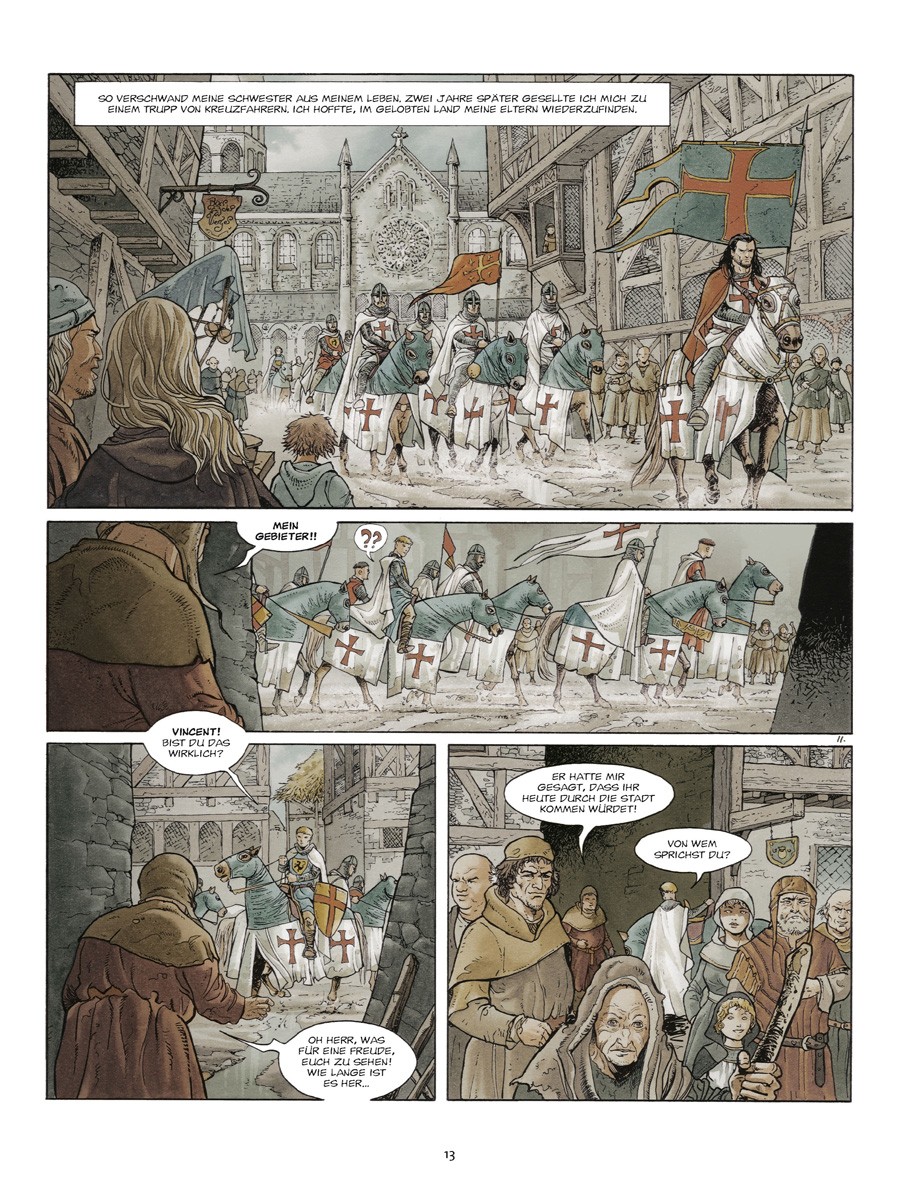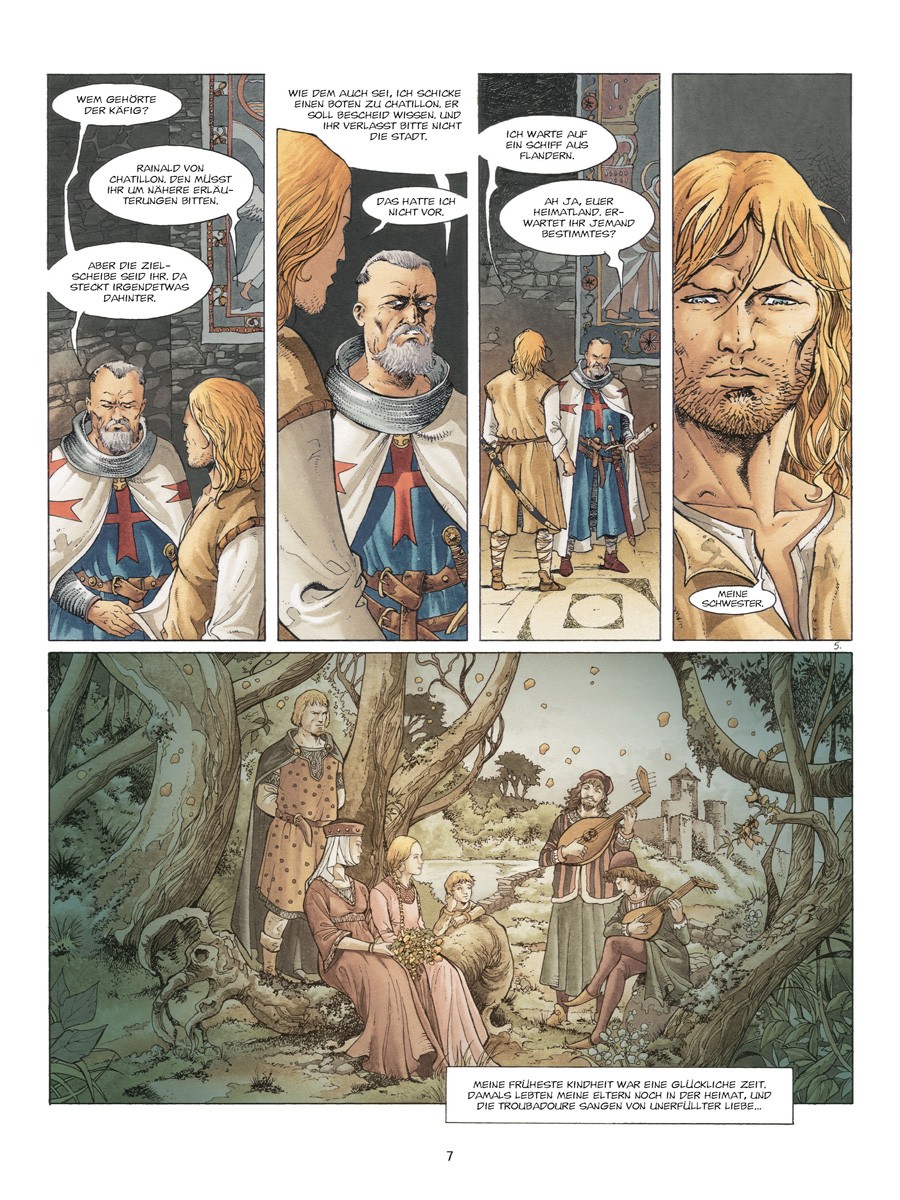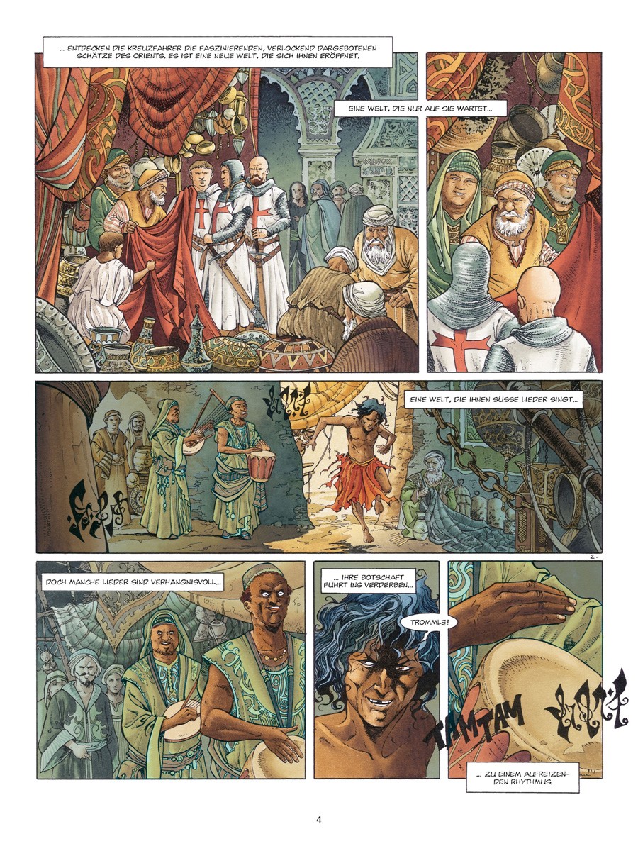 Sein Name ist El Hadj. Er ist der, der ohne Erbarmen sowohl auf das Kreuz als auch auf die Sichel einschlägt. Für seine zu trauriger Berühmtheit gelangte Sekte der Assassinen hat Ottar Benk eine Mission zu erfüllen: In aller Heimlichkeit und ohne jegliche Spuren zu hinterlassen, soll er Rainald von Chatillon sein kostbares Gut rauben. Doch hat er dabei nicht mit der Gegenwart von Gunther von Flandern gerechnet, dem Ritter ohne edle Herkunft und ohne Heimat…