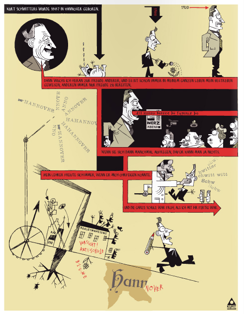 Kurt Schwitters (1887-1948), der als Maler, Dichter und Werbegrafiker in zahlreichen Kunstformen aktiv war, ist ein Pionier der Moderne. Mit dem Lautgedicht „Ursonate“ schockierte er Bourgeoisie und Dadaisten gleichermaßen, mit seinem Gesamtkunstwerk „Merzbau“ war er seiner Zeit weit voraus. Unter dem Kennwort „Merz“ entwickelte Schwitters ein dadaistisches Gesamtweltbild. Den „Merzbau“, eine grottenartige Collage-Skulptur mit Erinnerungsstücken, schuf Schwitters in zwanzigjähriger Arbeit in seiner Heimatstadt Hannover, im Haus seiner Eltern. Als die Nazis die Macht in Deutschland übernahmen und seine Kunst als „entartet“ verfemt wurde, emigrierte er nach 1937 nach Norwegen, wo er noch zwei weitere Merz-Bauten anfertigte, bevor er 1940 weiter nach England fliehen musste.
