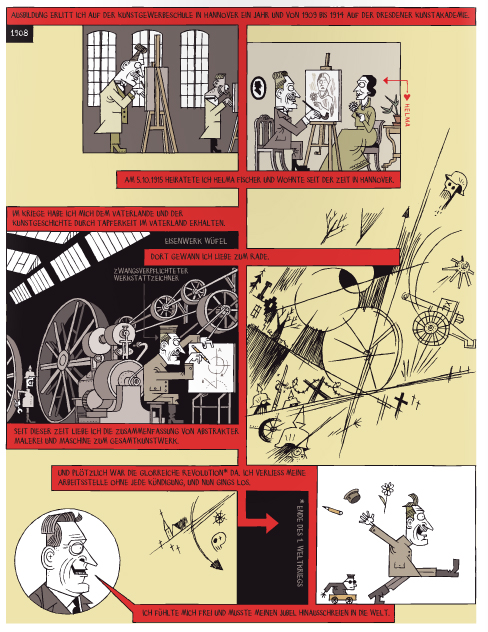 Lars Fiske legt den Schwerpunkt seiner Erzählung auf die Jahre des Künstlers im norwegischen Exil und nutzt die radikale Skulptur des „Merzbau“ als Grundlage für die Erzählstruktur seiner Comic-Biografie. Der norwegische Comic-Künstler Lars Fiske (Jahrgang 1966) studierte Illustration und Grafikdesign in Stockholm und Los Angeles. Er publizierte zahlreiche Comics und Kinderbücher und arbeitet als Illustrator für verschiedene Zeitungen. Gemeinsam mit Steffen Kverneland schuf er die Künstlerbiografie „Olaf G.“, die auf Deutsch ebenfalls im avant-verlag vorliegt.