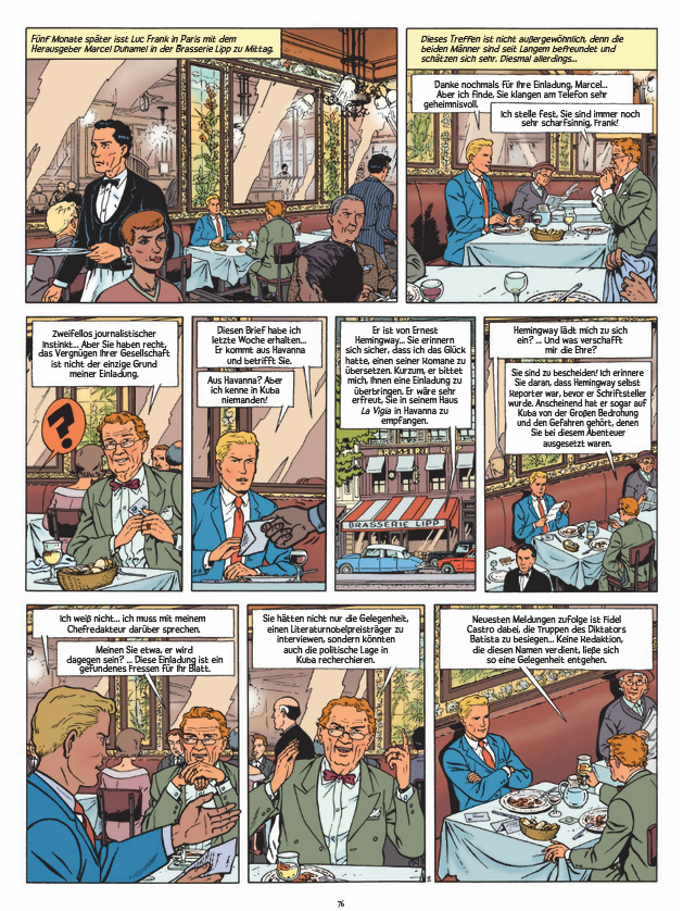 Niemand Geringerer als Ernest Hemingway lädt Luc Frank zu sich nach Havanna ein, um ihn zu interviewen. Vor Ort muss der Journalist jedoch feststellen, dass nicht nur eine archäologische Sensation auf ihn wartet, sondern auch ein internationales Komplott gegen Fidel Castro aufzudecken ist, das für mehrere Titelseiten reicht. Unter Lebensgefahr geht Frank aufs Ganze.