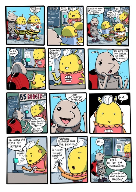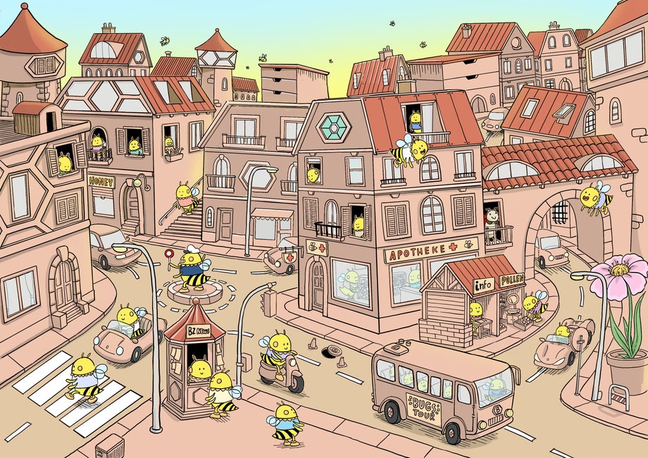 Im Wechsel mit den kurzen Comic-Anekdoten gibt es auf 10 Doppelseiten große Bienenstadt-Wimmelbilder mit all den Gebäuden, Geschäften, Fahrzeugen und natürlich den Bienen. Und irgendwo steht ganz allein Ladybug, findest du sie?