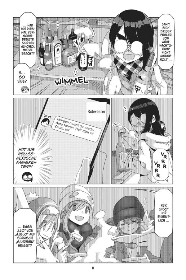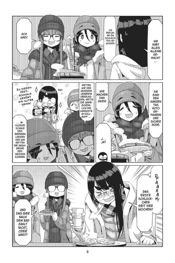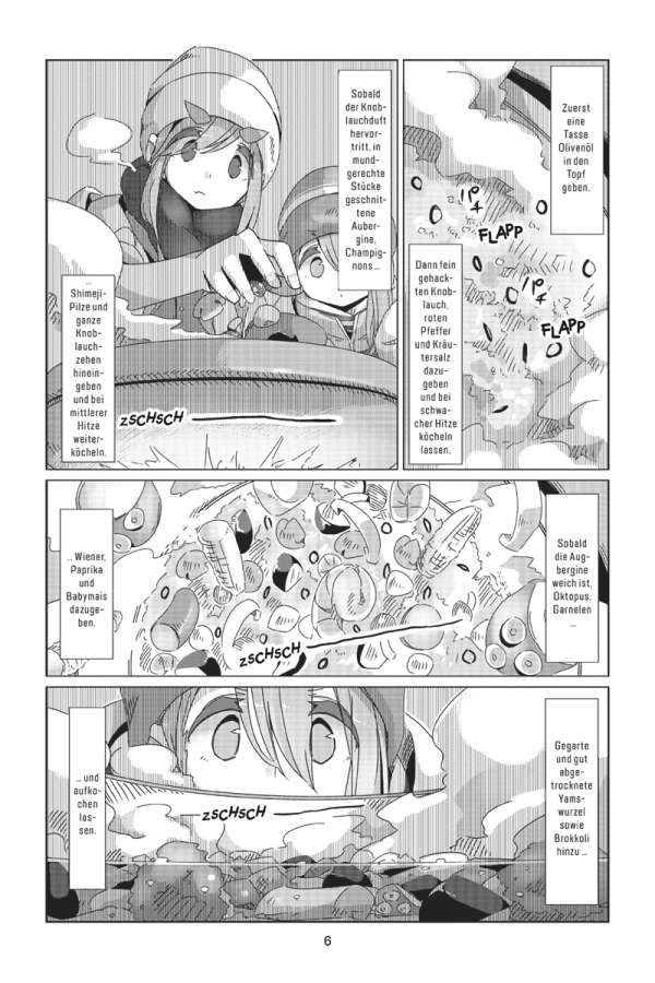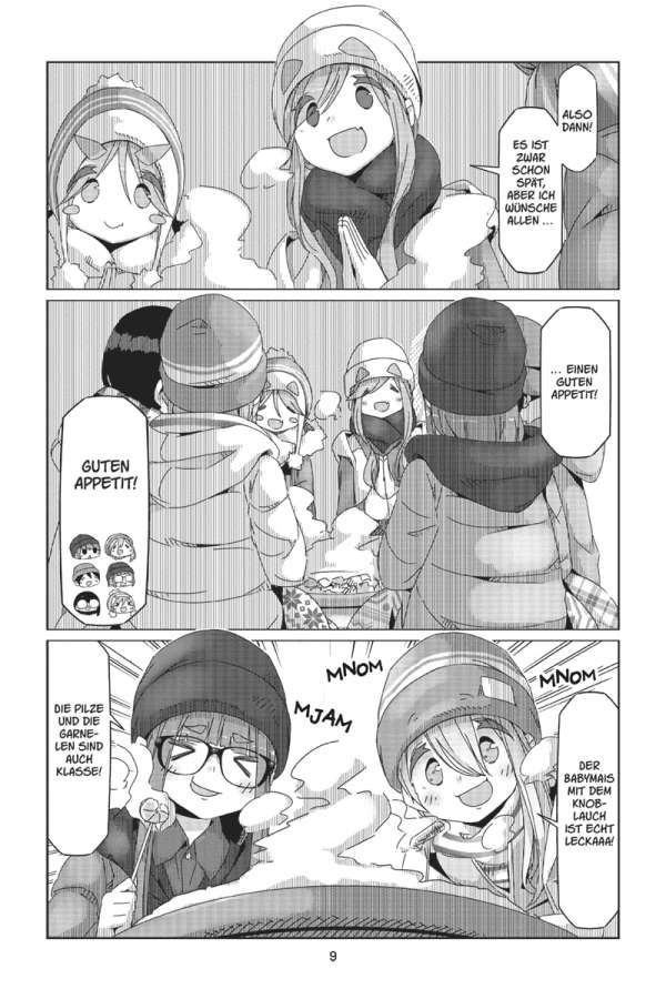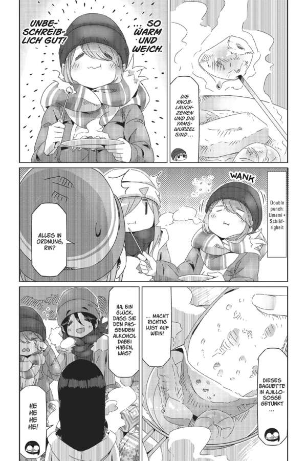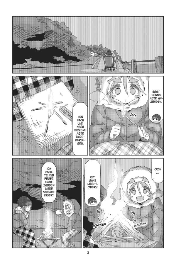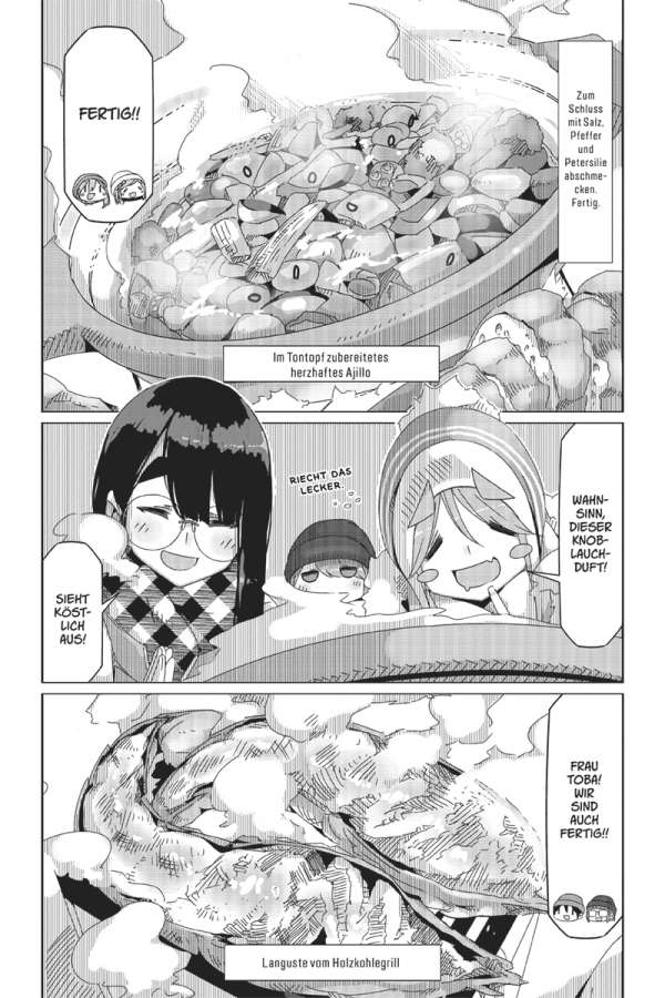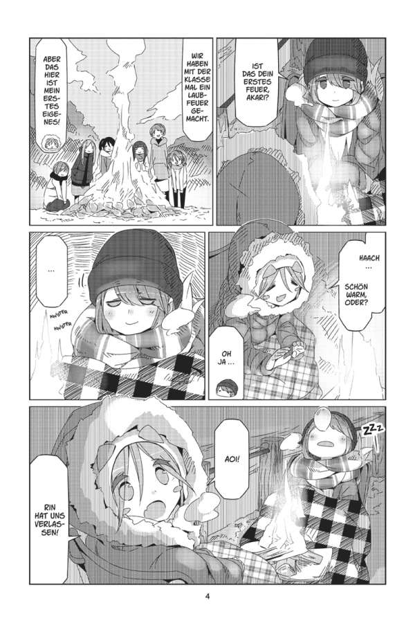Das Zelt am ruhigen See, den Fuji direkt im Blick: Rin liebt es zu campen! Doch ihre ruhige Auszeit wird jäh unterbrochen, als die lebhafte Nadeshiko auf einem Fahrrad an Rins Campingplatz vorbeikommt. Der Outdoor-Klub macht einen Ausflug nach Izu! Das bedeutet: Zwei Tage voller leckerer lokaler Spezialitäten, Wasserschweinen in heißen Quellen und atemberaubender Sonnenaufgänge auf dem Berg Omuru. Und dann steht noch ein ganz besonderes Ereignis vor der Tür: Nadeshiko und Inuko haben Geburtstag! Doch die Überraschungsparty ist in Gefahr, denn Geheimhaltung ist nicht gerade Akaris Stärke …