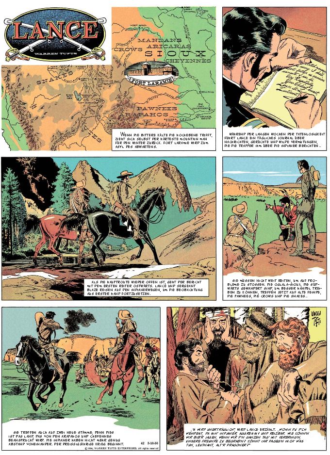 Lance wird nunmehr erstmals komplett in deutscher Sprache veröffentlicht. Ursprünglich erschien dieser großartige Western-Comic als farbige Sonntagsseiten (5. Juni 1955 bis 29. Mai 1960, insgesamt 261) und 13 Monate lang (14. Januar 1957 bis 15. Februar 1958) zusätzlich mit schwarz-weißenTagesstrips. Bocola bringt die gesamte Serie digital restauriert in fünf Hardcover-Alben mit jeweils 80 Seiten heraus. Freuen Sie sich auf einen - Prinz Eisenherz nahezu ebenbürtigen - Comic-Klassiker.