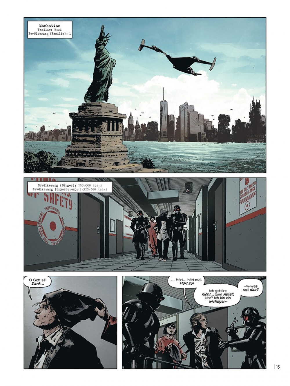 Nach einer Studie der internationalen Hilfsorganisation Oxfam besitzen bereits heute nur 85 Menschen so viel Vermögen wie die gesamte ärmere Hälfte der Weltbevölkerung. Da erscheint es nicht abwegig, dass in einer nahen Zukunft lediglich sechzehn Familien die ganze Welt unter sich aufgeteilt haben. Und den Rest der Menschheit in »Diener« und »Müll«. Zur Absicherung von Reichtum und Macht hält sich jede dieser Familien einen genetisch modifizierten »Lazarus«, der nahezu unbesiegbar und praktisch unsterblich ist. Greg Rucka (»Whiteout«, »Gotham Central«) hat ein packendes Endzeitdrama geschrieben, Michael Lark (»Gotham Central«, »Terminal City«) dafür kühle, schonungslos klare Bilder geschaffen. Nicht umsonst wurde »Lazarus« 2014 für den Eisner-Award als »beste neue Serie« nominiert.