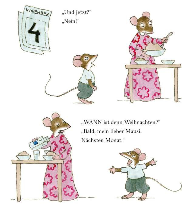 Es ist fast Weihnachten, und die kleine Maus freut sich darauf, Weihnachten mit Mama Maus sowie Opa und Oma Maus zu feiern. Aber Weihnachten scheint noch sehr, sehr weit weg zu sein, und die kleine Maus wird langsam ungeduldig! Zum Glück gibt es viele Dinge, bei denen die kleine Maus helfen kann – zum Beispiel Lebkuchen backen und den richtigen Weihnachtsbaum aussuchen.
