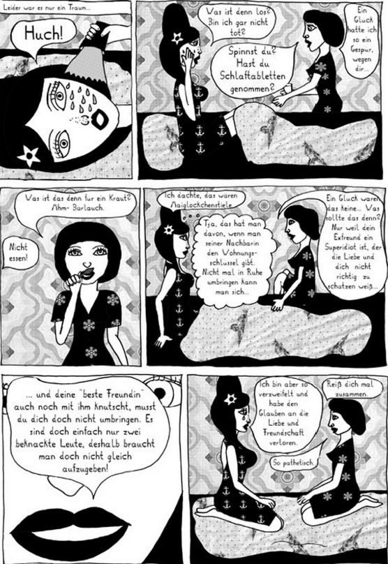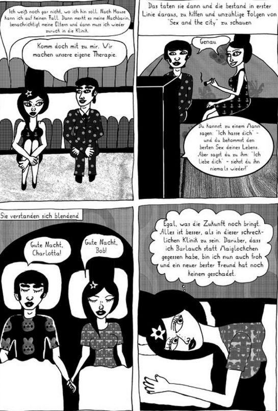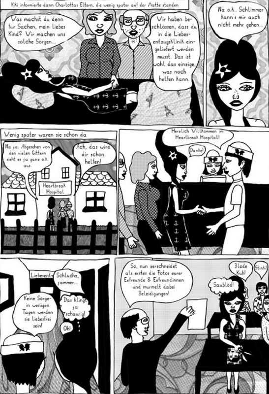 In ihren Comics beschäftigt sich Jule K immer wieder mit den Themen Musik, Freundinnen, Überlebenskampf und Liebe. Nachdem die 1974 in Lemgo geborene Künstlerin in dem letzten Band, „Fernanda´s fabulous life“, die Musik in den Mittelpunkt der Geschichte gestellt hat, dreht sich bei ihrer neuesten Veröffentlichung alles um die Liebe - genauer um die seelischen Schmerzen, die mit der Liebe einhergehen können: dem Liebeskummer. Zentrale Figur ist Charlotta, für die das Leben eigentlich nicht schöner sein könnte. Sie hat einen Comicladen, beste Freundinnen und einen Freund, mit dem sie geradezu lächerlich glücklich ist. Bis er ihr unvermittelt eröffnet, dass er nach Australien auswandert und zwar sofort. Als dann noch ihre beste Freundin Lilly mit ihrem Exfreund rumknutscht, bricht für Charlotta die Welt zusammen. Ihre Eltern bringen sie in eine Liebesentzugsklinik. Dort lernt sie ihren neuen besten Freund kennen, der ebenfalls versucht, ein gebrochenes Herz zu überleben. Gemeinsam fliehen sie aus der Klinik und entwickeln ihre eigene Kur gegen Liebeskummer. Ein bisschen abgedreht, ein bisschen melancholisch, dabei aber immer mit einem heftigen Augenzwinkern erzählt!