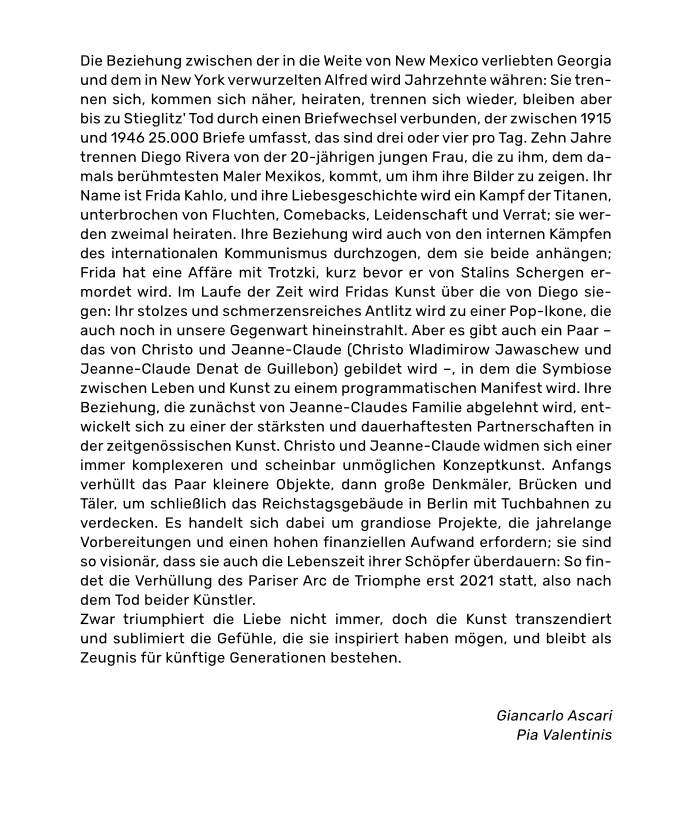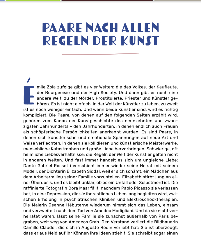 »Lovers in Art« schildert überwältigende Leidenschaften in einer immer noch von Männern dominierten Gesellschaft. Diese Graphic Novel erzählt anhand der Schlüsselmomente ihres gemeinsamen Lebens von den Wünschen und der Schwierigkeit, sie einander zu erfüllen, von den Komplizenschaften und Komplikationen zehn leidenschaftlicher Paare, die allesamt Kunstgeschichte geschrieben haben. Das Buch wirft ein neues Licht auf die Rolle, die die Frauen als Malerinnen, Fotografinnen, Dichterinnen und Philosophinnen gespielt haben, und zwar eben nicht nur als Musen männlicher Künstler, sondern auch als Konkurrentinnen ihrer Liebhaber, als ihre Opfer und Herrscherinnen. Wenn Kunst und Leidenschaft aufeinandertreffen, entstehen unvergessliche, manchmal quälende, niemals aber banale Geschichten. Die Geschichte der Kunst ist geprägt von diesen schicksalhaften Begegnungen, die im Zeichen der Gemeinsamkeit und der mehr oder weniger ausgeprägten Rivalität stehen.