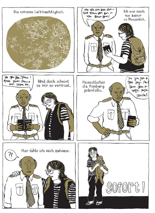 Birgit Weyhe recherchiert diese kaum bekannte Fußnote deutsch-mosambikanischer Geschichte, indem sie die Betroffenen selbst zu Wort kommen lässt. Sie dreht die übliche Perspektive eines deutschen Blicks auf die Welt um und porträtiert zugleich einen Staat vor dessen Untergang. Durch subtiles Einfügen von Erinnerungsobjekten und mit allegorischen Motiven angereichert entstand ein Comic, der in seiner Bild- und Erzählsprache selbst die Grenzen zwischen afrikanischer und europäischer Kultur überschreitet.