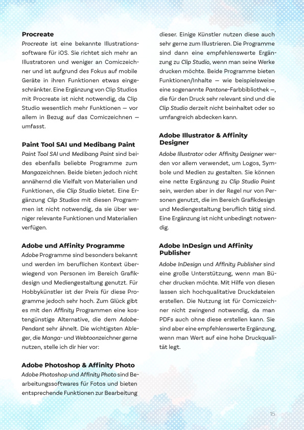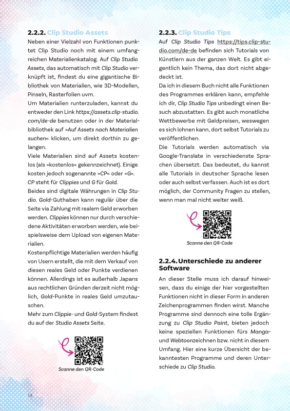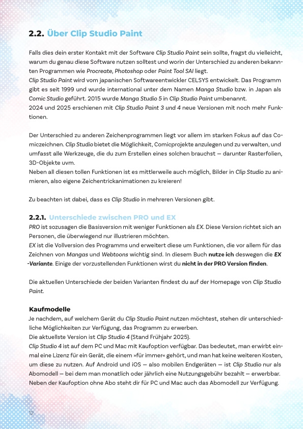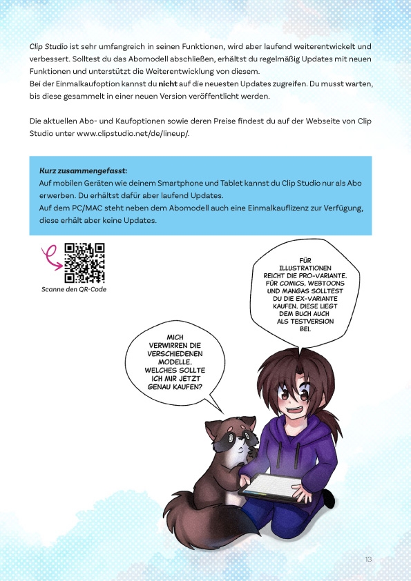 Von der benötigten Hardware über digitale Fachbegriffe bis hin zu Konturen, Werkzeugen zum Kolorieren und Rastern, der Verwendung von 3D-Modellen und schließlich dem Druck – hier finden Anfänger, Clip Studio-Neulinge und auch Fortgeschrittene anfängerfreundliche Anleitungen für den digitalen Einstieg.