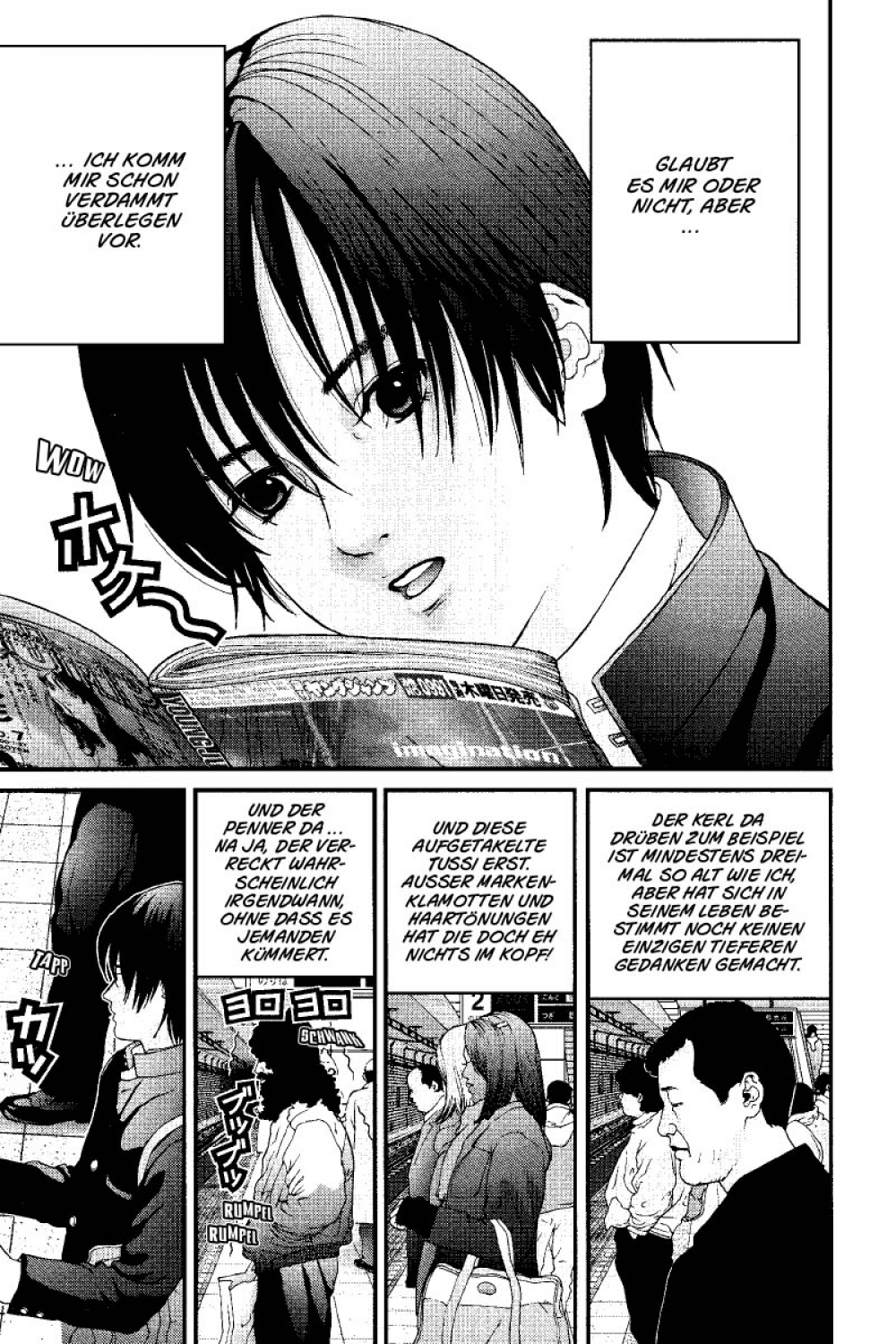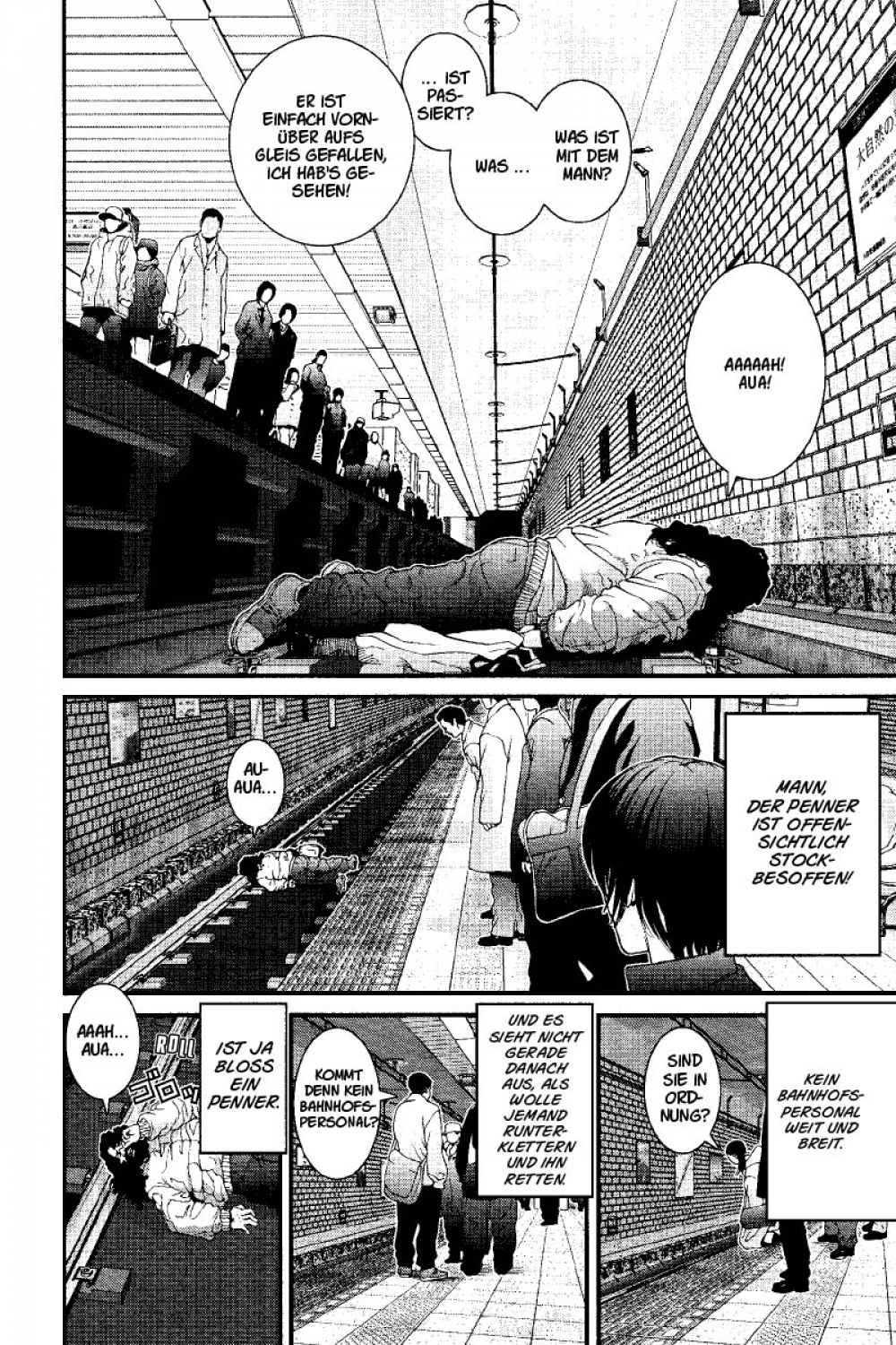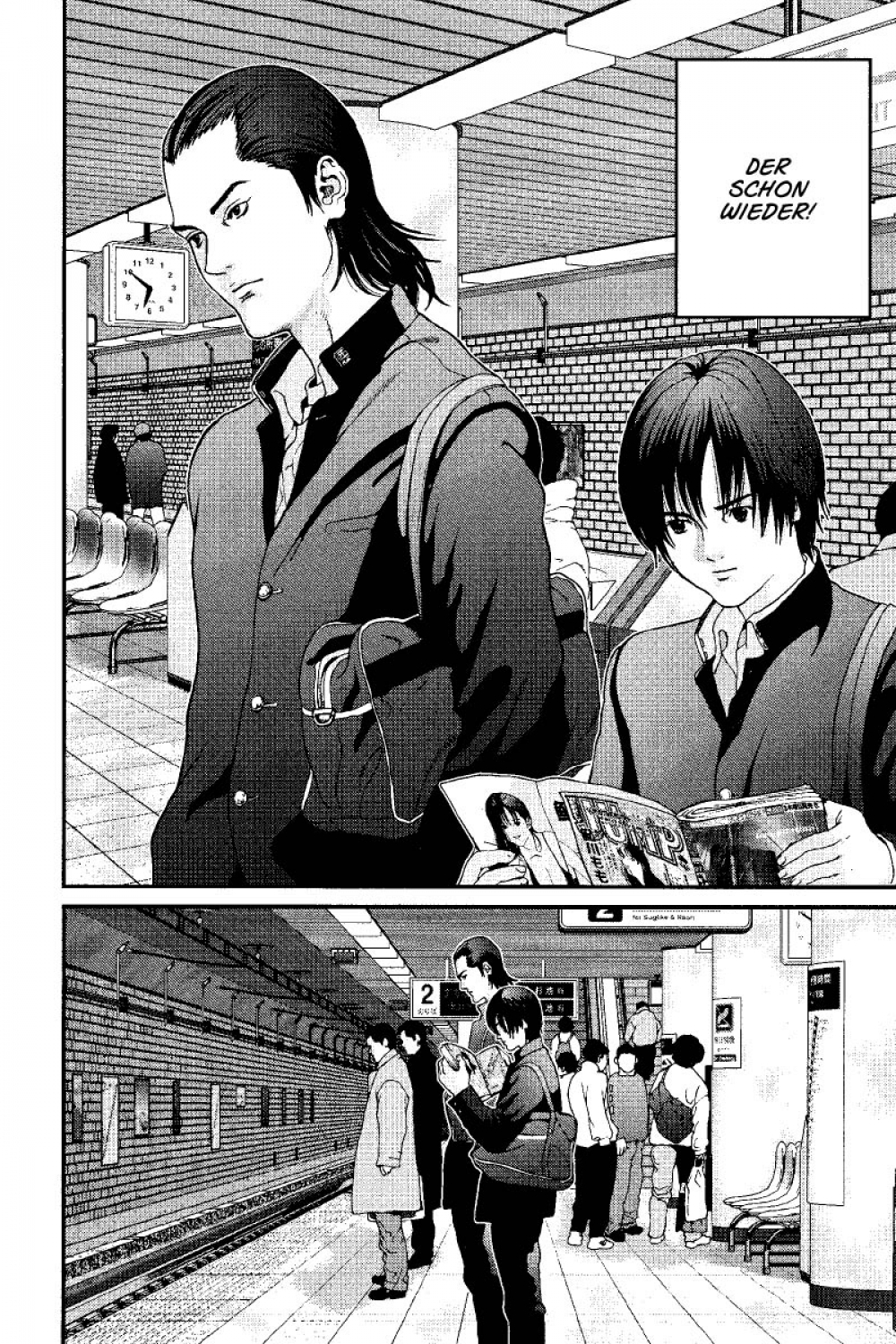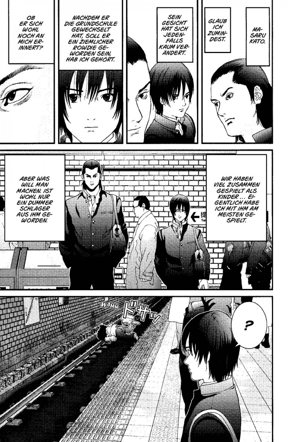 Kei und sein Freund Masaru eilen einem Obdachlosen zur Hilfe, der auf die Gleise der U-Bahn gestürzt ist – und werden selbst von einem Zug erfasst und getötet. Doch statt im Jenseits erwachen die beiden in einem leeren Raum, in dessen Mitte sich eine mysteriöse schwarze Kugel befindet: Gantz.