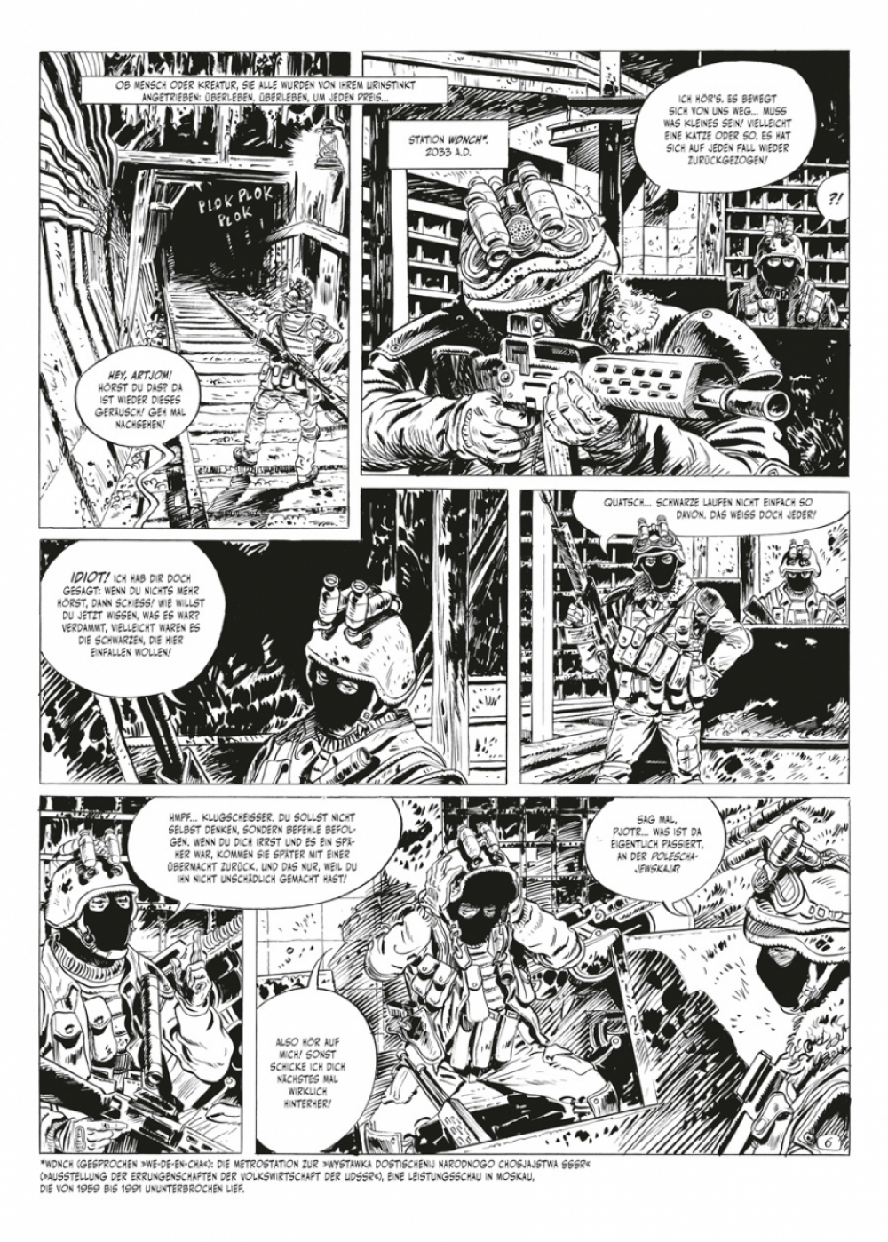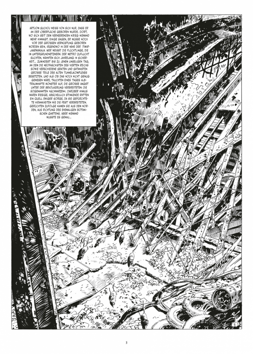 Das Jahr 2033. Der verheerende Atomkrieg, der die Welt in eine radioaktive Ödnis verwandelt hat, zwang die Bewohner Moskaus dazu, in der Metro Zuflucht zu suchen. Über die Jahre entwickelten sich die Stationen der U-Bahn zu regelrechten Staaten, die Handel und auch Krieg miteinander treiben. Auf der Oberfläche, so sagt man, durchstreifen mutierte Monstrositäten und Schlimmeres die verstrahlten Ruinen der Metropole. Dorthin wagen sich nur Schatzsucher und Wahnsinnige - und wo ist da der Unterschied? Einer dieser Abenteurer beauftragt den jungen Artyom, durch die Metro zur Polis zu reisen, um einen Mann namens Commander zu finden und ihn vor den „Schwarzen“ zu warnen - menschenähnlichen Mutanten, die Artyoms Heimatstation bedrohen… Mit dieser Adaption des russischen Bestsellers Metro 2033 verwirklicht der Niederländer Peter Nuyten sich einen Traum, denn er ist selbst der größte Fan von Gluchowskis einzigartiger Mischung aus Survival-Horror, Bildungsroman und dystopischer Gesellschaftskritik."