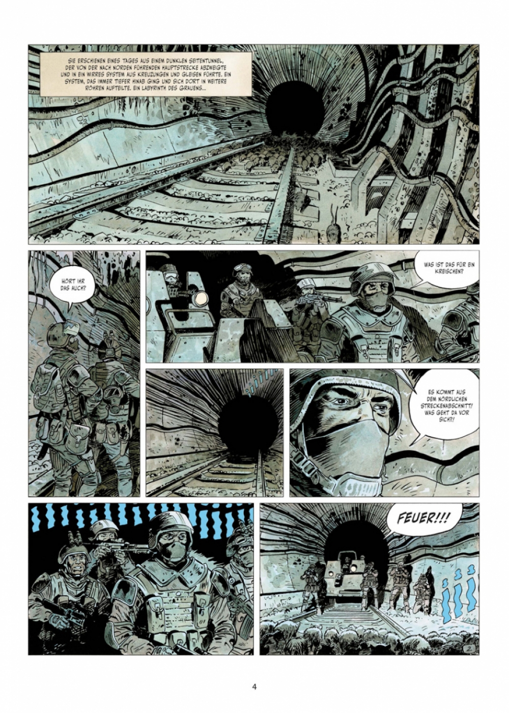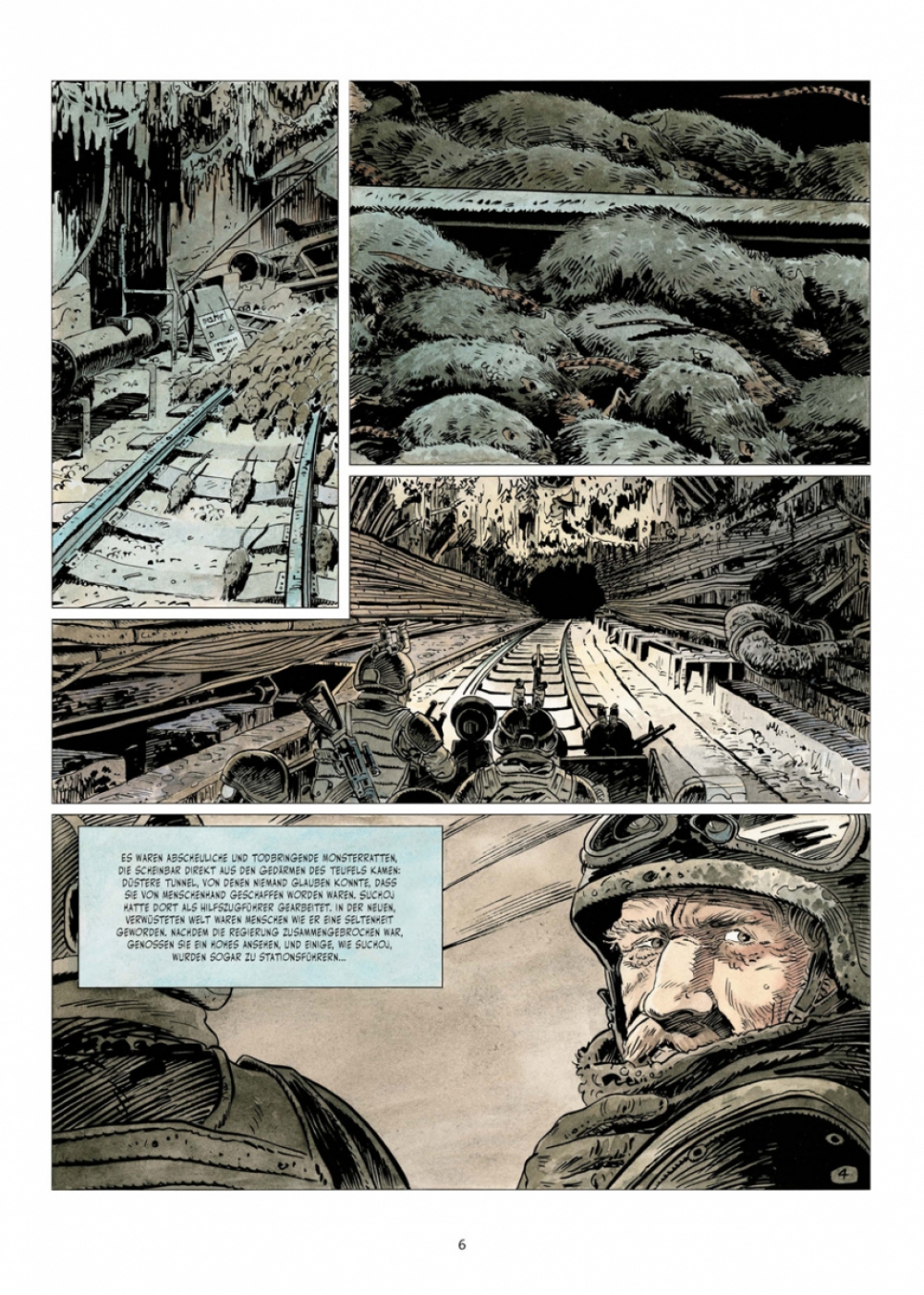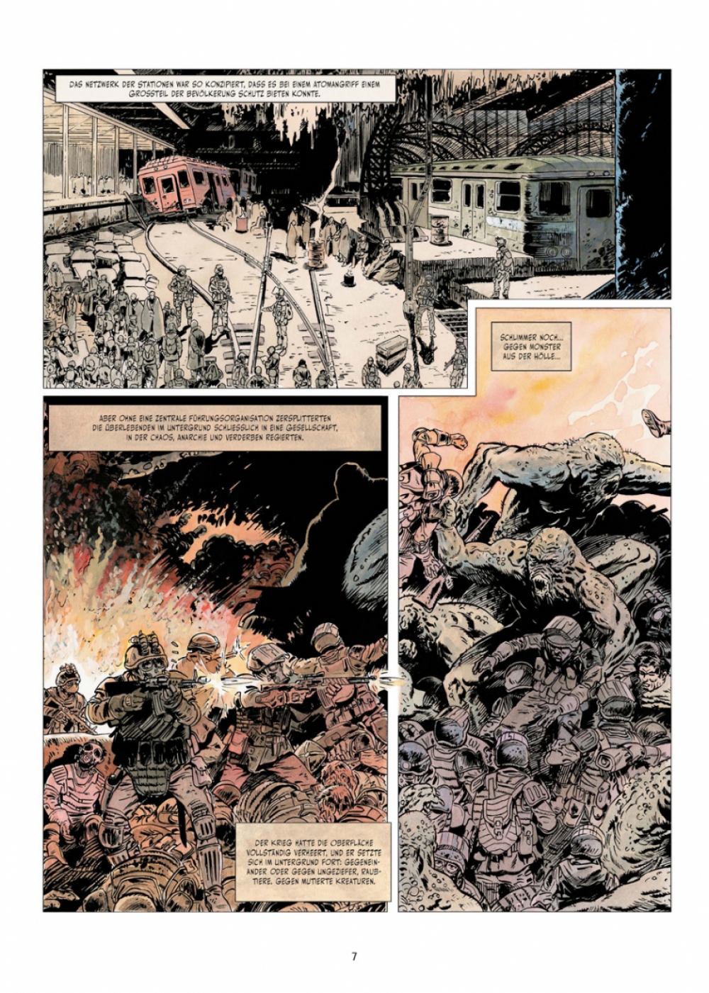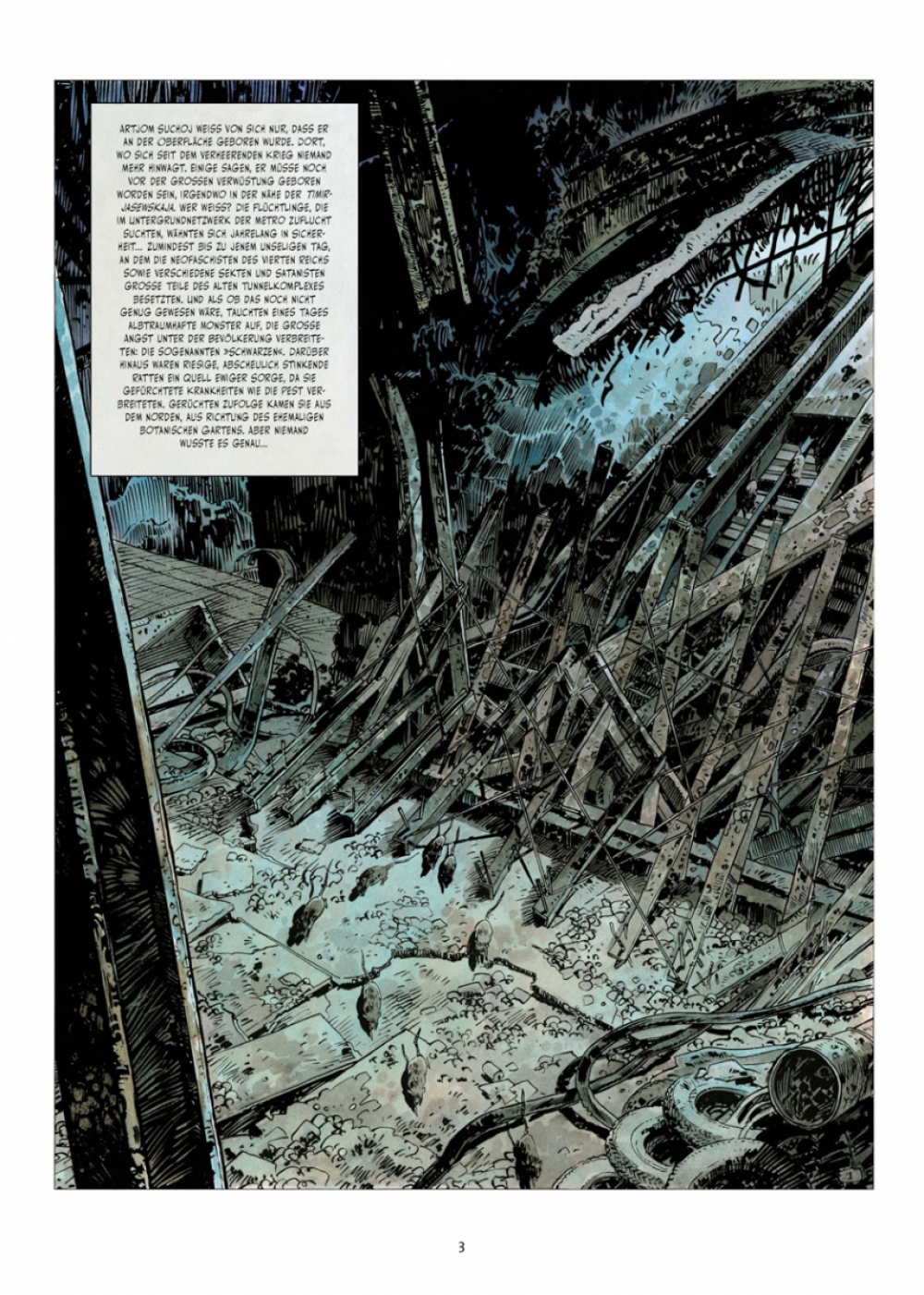 Das Jahr 2033. Der verheerende Atomkrieg, der die Welt in eine radioaktive Ödnis verwandelt hat, zwang die Bewohner Moskaus dazu, in der Metro Zuflucht zu suchen. Über die Jahre entwickelten sich die Stationen der U-Bahn zu regelrechten Staaten, die Handel und auch Krieg miteinander treiben. Auf der Oberfläche, so sagt man, durchstreifen mutierte Monstrositäten und Schlimmeres die verstrahlten Ruinen der Metropole. Dorthin wagen sich nur Schatzsucher und Wahnsinnige – aber wo ist da der Unterschied? Einer dieser Abenteurer beauftragt den jungen Artyom, durch die Metro zur Polis zu reisen, um einen Mann namens Commander zu finden und ihn vor den »Schwarzen« zu warnen - menschenähnlichen Mutanten, die Artyoms Heimatstation bedrohen… Mit dieser Adaption des russischen Bestsellers »Metro 2033« verwirklicht der Niederländer Peter Nuyten sich einen Traum, denn er ist selbst der größte Fan von Gluchowskis einzigartiger Mischung aus Survival-Horror, Bildungsroman und dystopischer Gesellschaftskritik.