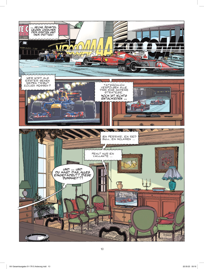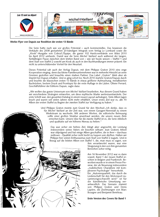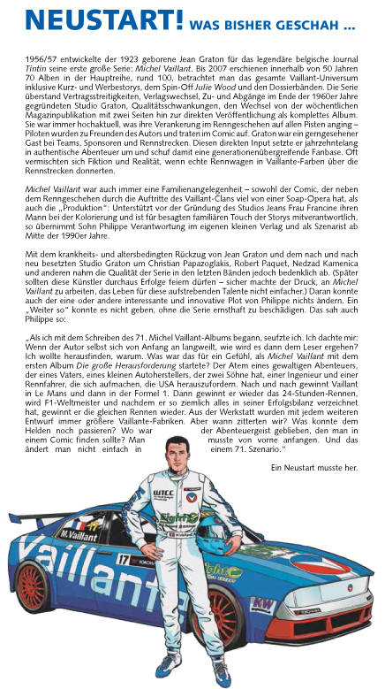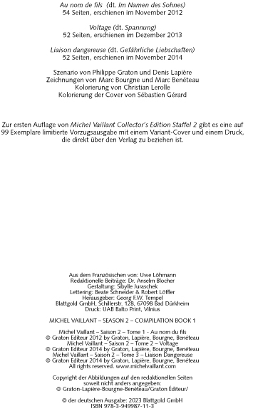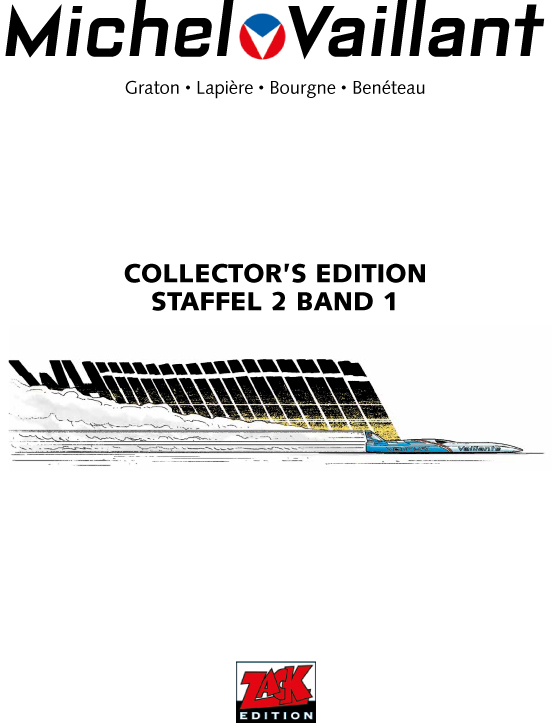 Der erste Band der Gesamtausgabe beinhaltet die ersten drei Alben der zweiten Staffel von Michel Vaillant, die z. Zt. vergriffen sind. Das Coverlayout orientiert sich am Layout der Ehapa-Gesamtausgabe der klassischen Michel Vaillant-Alben. Neben den Comic-Alben wird es 10 – 13 redaktionelle Seiten von Vaillant-Experte Anselm Blocher geben.