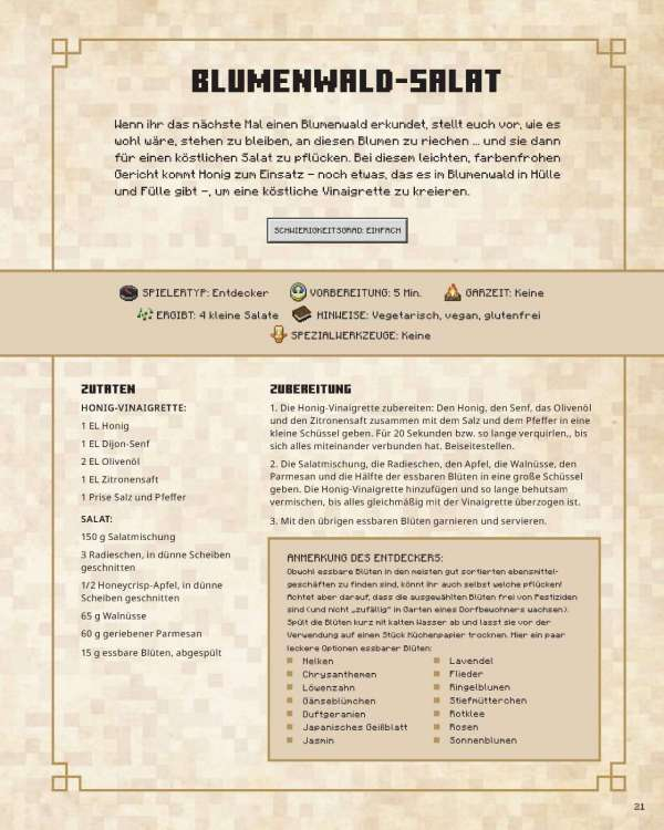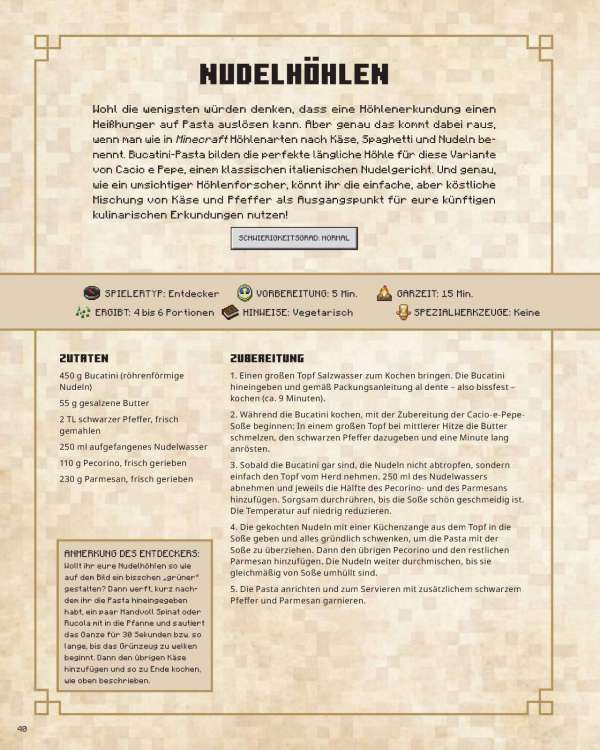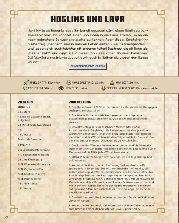 Von gehaltvollen Hauptgerichten, die die Nahrungspunkte auffüllen, über verzauberte Snacks, ohne die Alex und Steve in der abenteuerlichen Welt von Minecraft nicht überleben könnten, bis hin zu partytauglichen Desserts und Tränken – dieses Buch steckt voller Gerichte, die Gamerinnen und Gamer jeden Alters begeistern werden. Ideal, um Familie und Freunde in der Küche zusammenzubringen. Sammelt eure Zutaten und versammelt euch zum Kochen und Essen! Kinder werden die begleitenden farbenfrohen Illustrationen ihrer Lieblingsfiguren und bekannter Szenarien lieben, während Eltern die einfachen und zugänglichen Schritt-für-Schritt-Anleitungen für die fantasievollen Kompositionen schätzen werden.