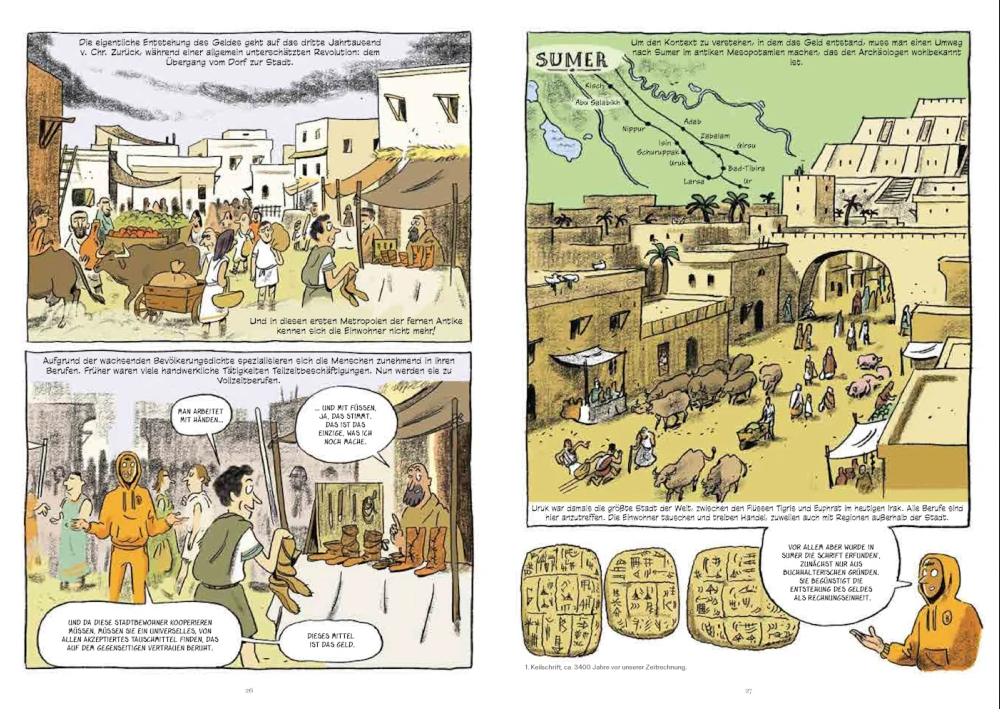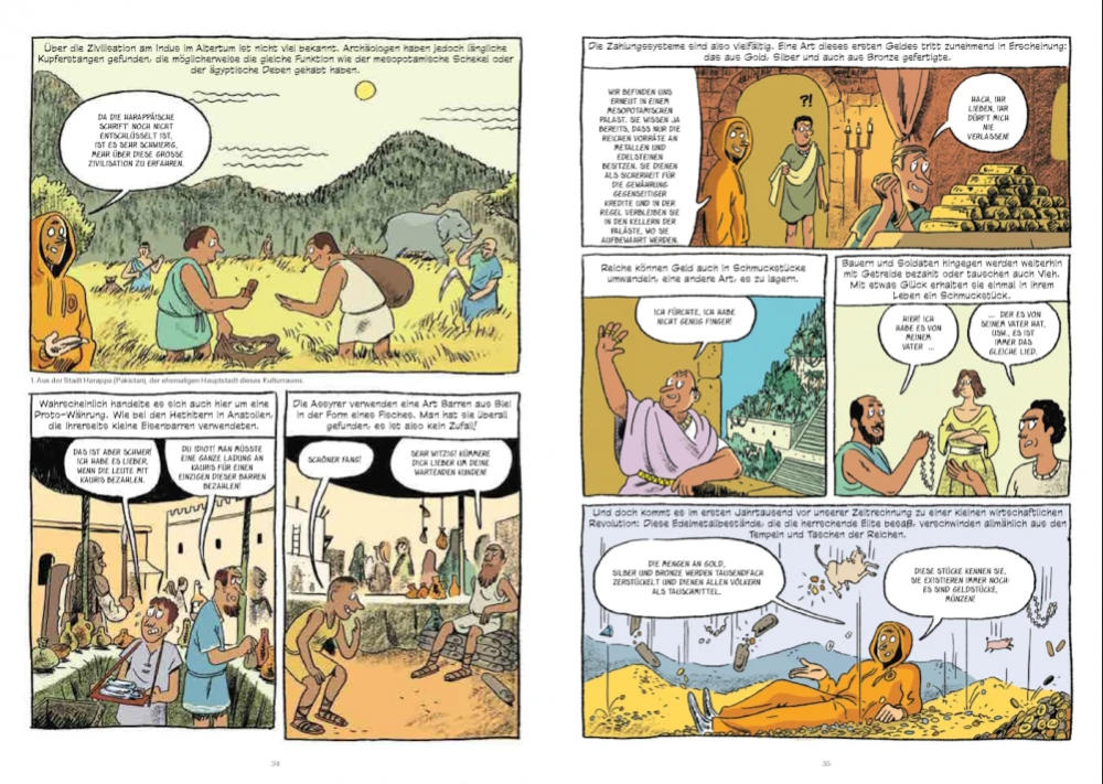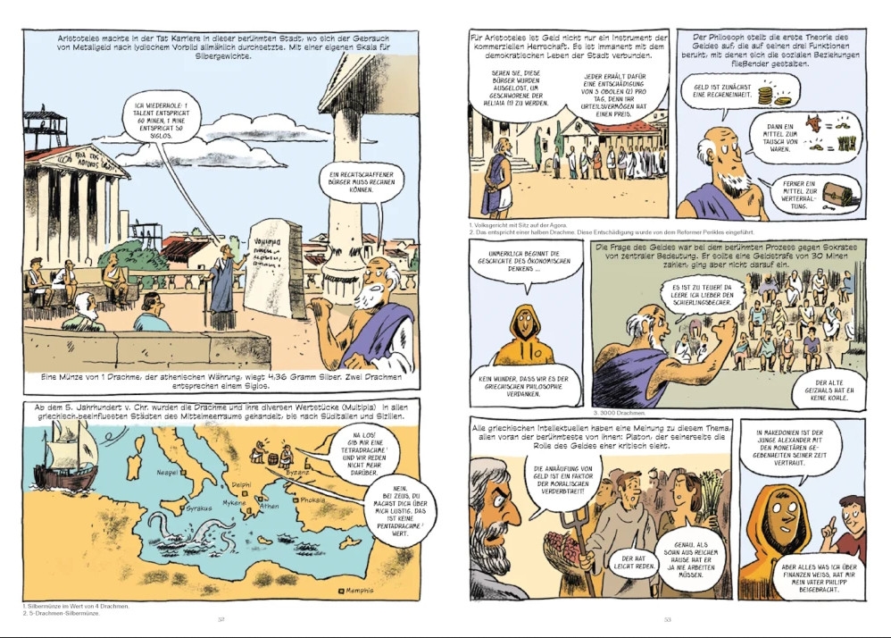 Nutzen die Asyrer und Chinesen noch Muscheln oder Edelmetallstücke als unterschiedliche Werteinheiten, prägten die griechischen und römischen Zivilisationen vor allem ausgeklügelte Geldsysteme. Diese Fortschritte ermöglichten die Entwicklung komplexerer Volkswirtschaften, förderten den Handel und festigten politische Macht. Humorvoll und leicht nachvollziehbar werden die wichtigsten monetären Umwälzungen der Geschichte erforscht, wie die Entstehung von Bankensysteme, die Schaffung der ersten Münzen aus Metall und die Reformen, die die politischen und wirtschaftlichen Revolutionen begleitet haben. Außerdem blickt die Graphic Novel auch auf aktuelle Themen, wie die Globalisierung des Handels und die Entwicklung der internationalen Währungssysteme und beleuchtet Herausforderungen, die mit der Einführung neuer Geldformen, insbesondere Kryptowährungen, verbunden sind.