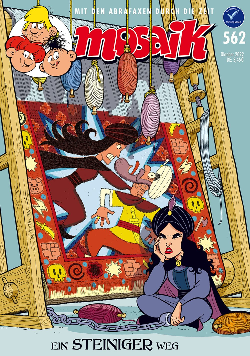 Die Reisegruppe, mit der die Abrafaxe nun nach Europa reisen wollten, verließ Bagdad am folgenden Morgen. Drei Wochen später würde sie einen Fluss erreichen, der die Grenze zum Byzantinischen Reich markierte. Warum nur Califax diese Grenze überquert, welchem legendären Helden Abrax und Brabax begegnen und wieso der Elefant auf einem großen Stein in reißenden Wassern steht, das erfahrt ihr in diesem MOSAIK.
